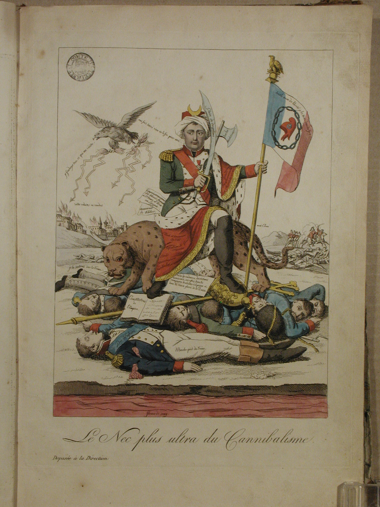 Комм.: Засудження наполеонівської політики та війн.Перераховані та зображені наступні реальні чи вірогідні злочини Наполеона: навернення до мусульманства; отруєння поранених біля гори Сен-Жан д’Акр; вбивства генерала Клебера, генерала Пішегрю, герцога Ангієнського; величезні втрати людей у військових кампаніях в Росії та Іспанії; неповага до Конституції та Церкви; занадто часті набори в армію; невиправдані розстріли, заслання тощо./Информацiя об оригiнале: Під зображенням назва французькою мовою: "Le Nec plus ultra du Cannibalisme". Унизу ліворуч: "Déposéс à la Direction"/Аналогіi: 1.Інший відбиток: British museum. «Le Nec plus ultra du Cannibalisme». 1815. 200x265. Registration number 1989,1104.38 , AN 102034001;