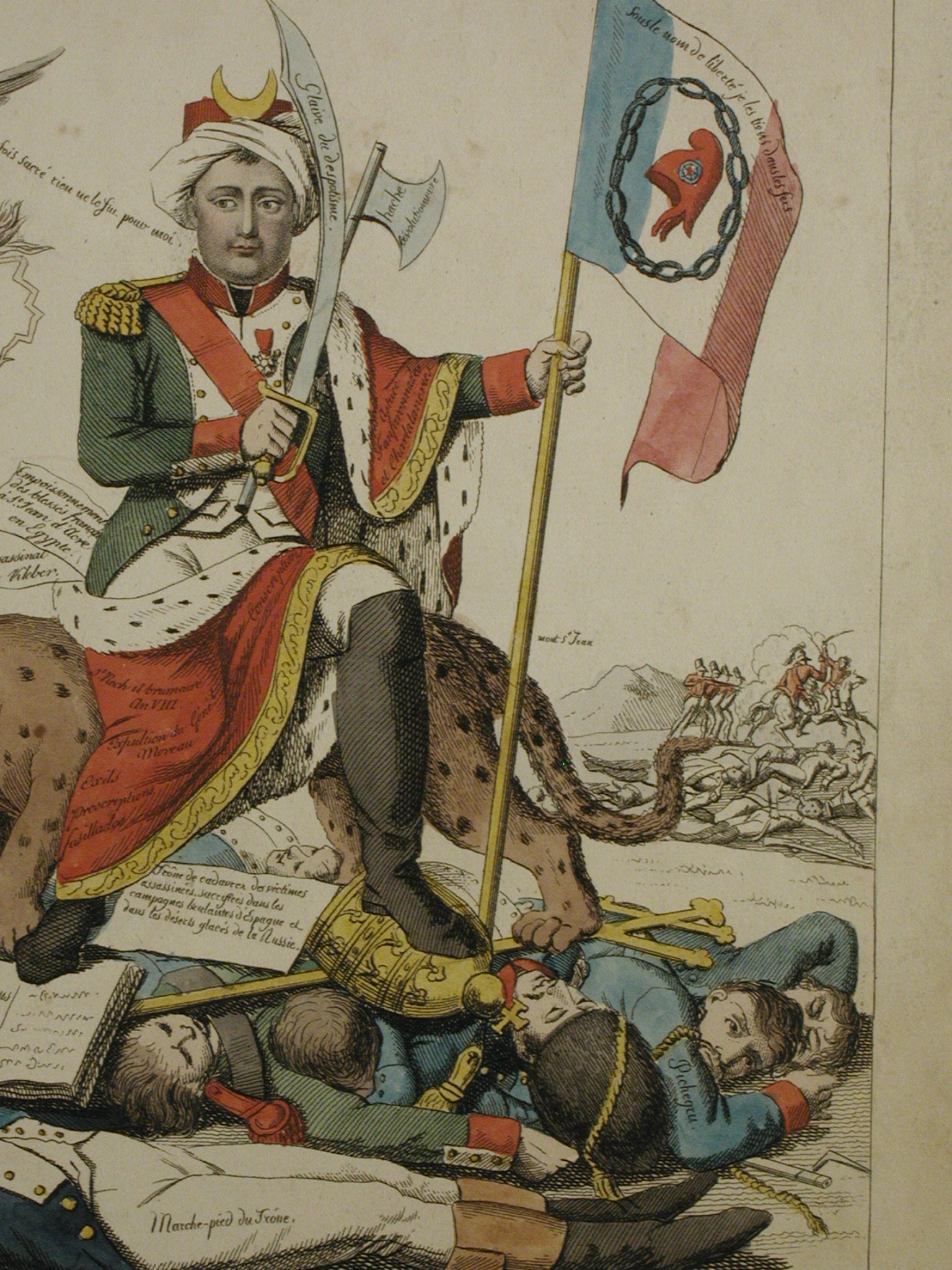 /Кількість: 1/Старі документи прийому: Акт №1 від 05.01.1952/Опис: Зображення Наполеона, який сидить на леопарді, який стоїть на повержених на землю військових, в червоній мантії з горностаєвою підбивкою, в чалмі з напівмісяцем, з кривим мечем і сокиркою в правій та трикольоровим стягом в лівій руці. На лосинах того, хто лежить на передньому плані напис : "Marche-pied du Trône" (Сходи до трону)./ншi написи, штампи, печатки, етикетки, наклейки: Печатка: ліворуч угорі круглий відбиток чорним.
