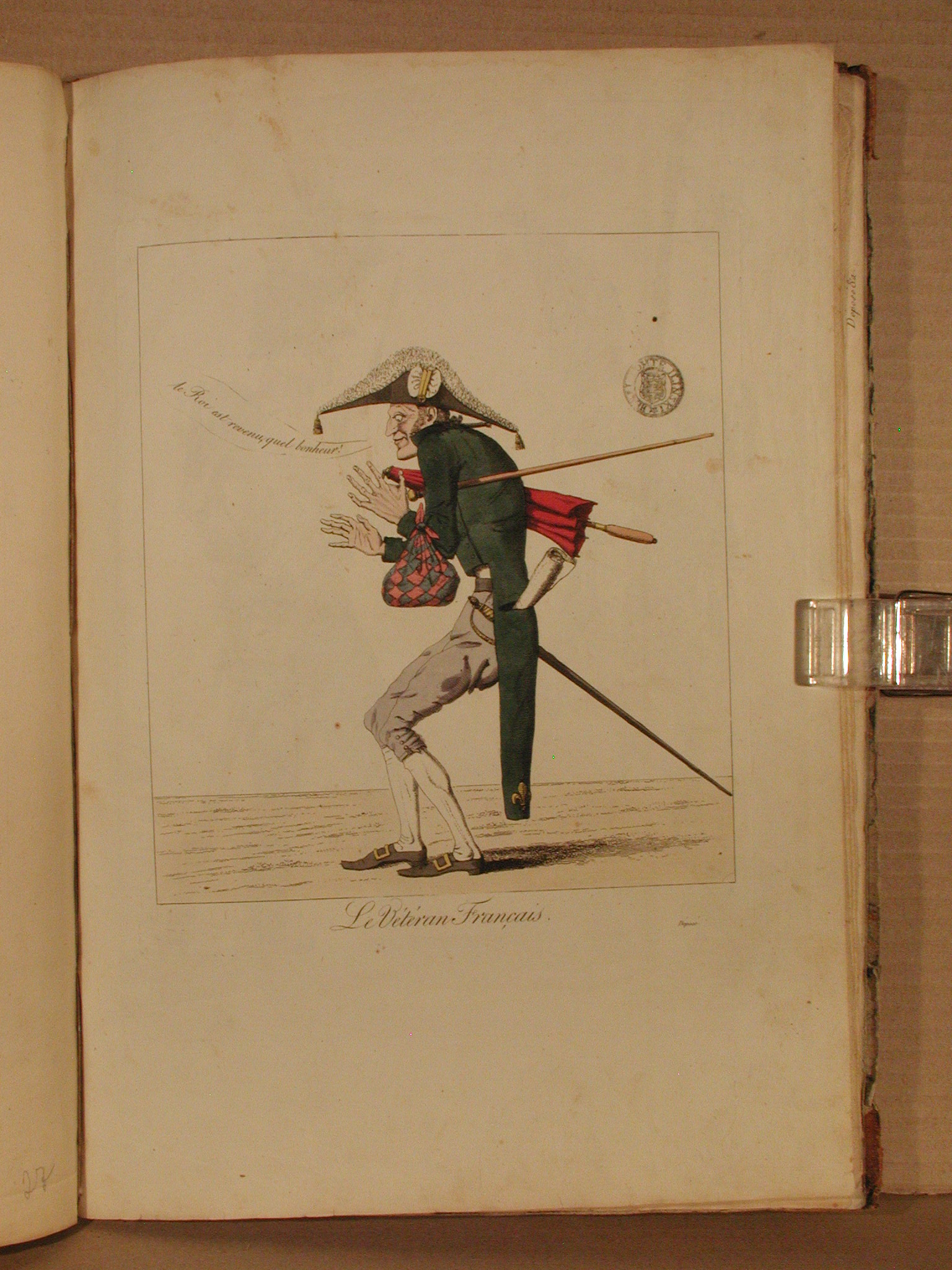 Закладка “Атрибуція” - Змiн. назва: Французький ветеран./Наим. предмета, издания: гравюра/Змiн.Розміри дошки: 241х207/Змiн.розміри листа: 385х262/Змiн. авторські пiдписи i написи: Під зображенням – назва аркуша: «Le vétéran français» («Французький ветеран»); в бульбашці репліка персонажа: «Le Roi est revenu, quel bonheur » («Король повернувся, яке щастя»); під зображенням праворуч – позначка про реєстрацію «Déposé»./Змiн.опис: Згорблений старий, зображений в профіль, одягнений у фрак із королівською лілією на фалді, короткі панталони і трикутний капелюх з кокардою, з-під якого стирчить косичка перуки; на лівій руці – вузлик, під пахвами тримає парасольку і тростину, на боці – шпага, з кишені визирає сувій./Змiн. Iншi написи, штампи, печатки, етикетки, наклейки: На зображенні праворуч угорі - кругла чорна печатка «HENRІ COMTE ILINSKI».Автор, автор съемки: Невідомий майстерИзм. предметный классификатор: гравюрамісце створення, школа: ФранціяНовый материал: папірИзм. техника: офортИзм. техника: розфарбований від руки