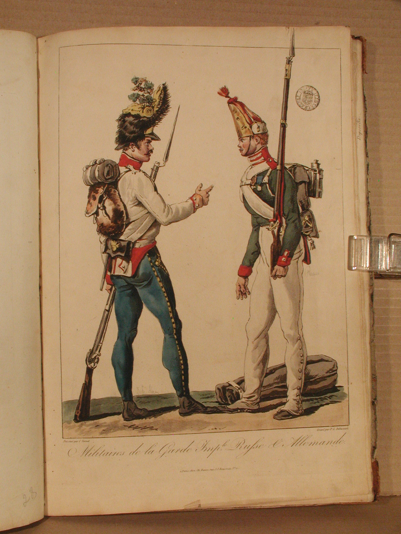 Закладка “Атрибуція” - Змiн. назва: Військові російської та німецької імператорських гвардій/Наим. предмета, издания: гравюра/Змiн.розміри листа: 384х266/Змiн.додаток до назва (лист, ...): Серія "Колекція костюмів, намальованих з натури", частина 2, № 4/Змiн. авторські пiдписи i написи: Під зображенням – назва аркуша: «Militaires de la Garde Imp.le Russe et Allemande» («Військові російської та німецької імператорських гвардій»); нижче – ім′я та адреса видавця: «à Paris chez Ch. Bance rue J. J. Rousseau No.10»; під зображенням ліворуч ім′я рисувальника: «Dessiné par C. Vernet», праворуч – гравера: «Gravé par P. L. Debucourt»./Змiн.опис: Двоє військових зображені обличчям один до одного: ліворуч росіянин у високому хутряному капелюсі, праворуч - німець./Змiн. Зведення про відбиток: Стан: до нумерації аркушів серії./Змiн. Iншi написи, штампи, печатки, етикетки, наклейки: На зображенні праворуч угорі - печатка «HENRІ COMTE ILINSKI»./Змiн. час створення: 1815Автор, автор съемки: Верне КарлАвтор, автор съемки: Дебюкур Луї ФеліберИзм. предметный классификатор: гравюрамісце створення, школа: ФранціяНовый материал: папірИзм. техника: офортИзм. техника: розфарбований від рукиИзм. комплект(ИЗО): «Collection de costumes dessinés d'après nature» 1814-1818