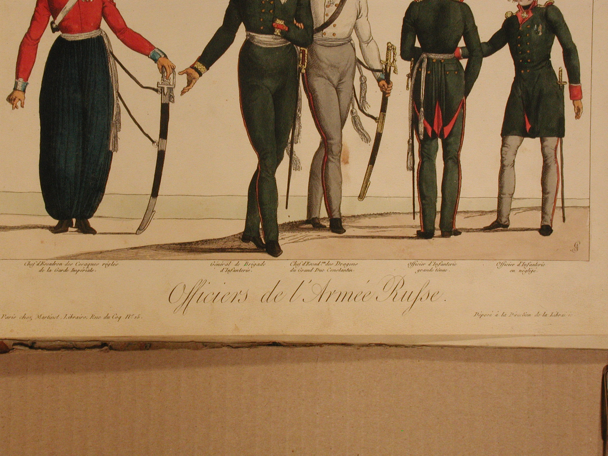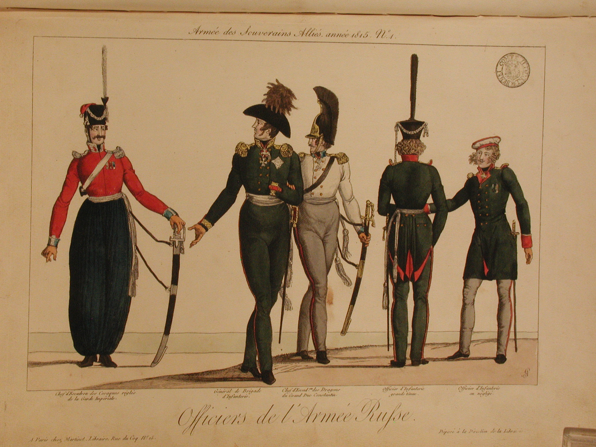 Информацiя об оригiнале: Під зображенням - найменування кожного із зображених французькою мовою. Праворуч унизу монограма гравера з буквами CHF. Пд зображенням назва серії:«Armée des Souverains Alliés, année 1815 № 1». Унизу в центрі назва аркуша: «Officiers de l'Armée Russe». Нижче ліворуч: «à Paris chez Martinet libraire rue du Cog no.15»; праворуч: «Déposé à la Direction Générale de la Librairie»./Аналогіi: 1. Інший відбиток: British Museum. «Armée des Souverains Alliés, année 1815 / Officiers de l'Armée Russe», 1815. Registration number: 1917,1208.4010;