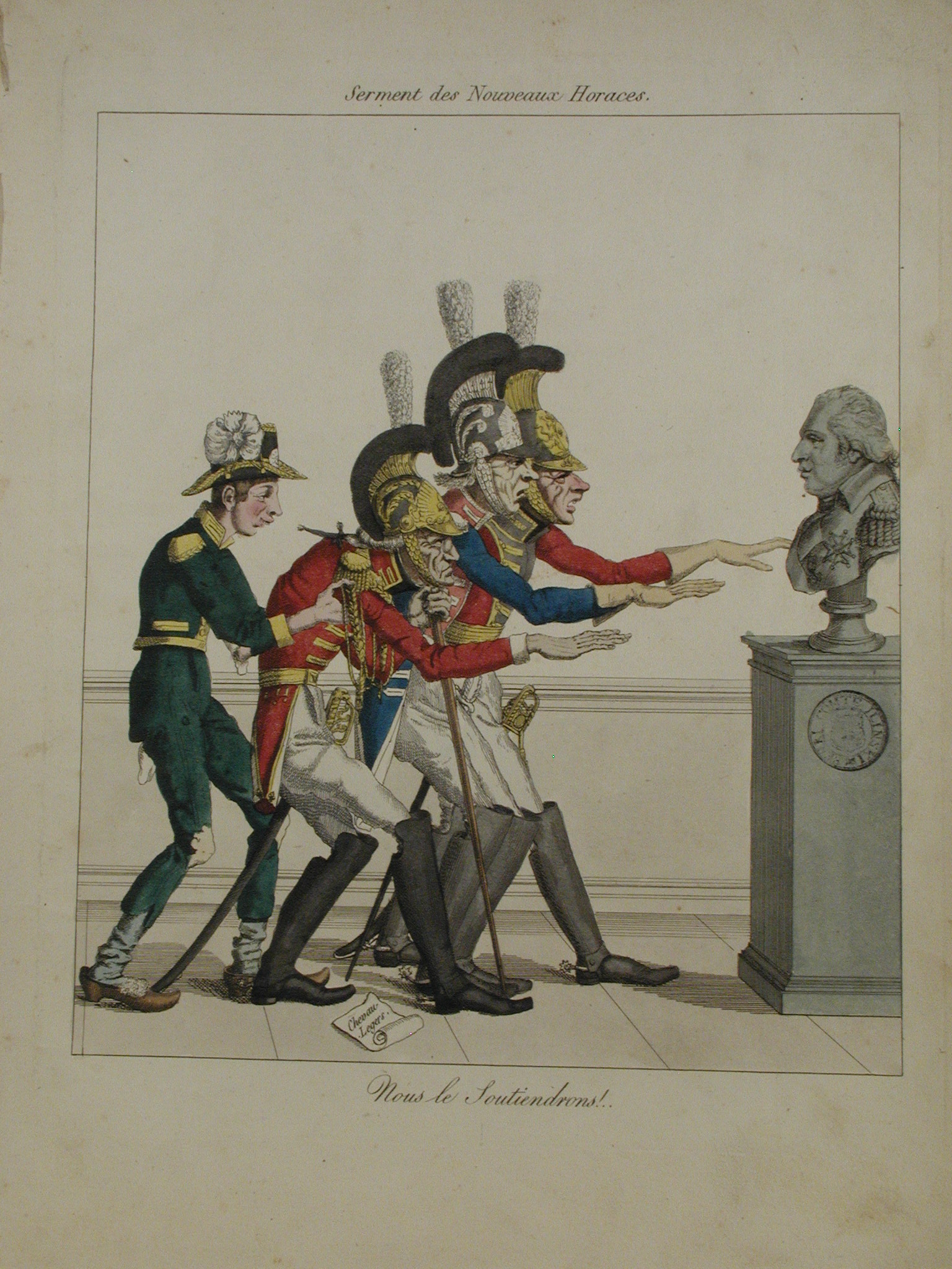 Комм.: Троє старих аристократів присягають перед бюстом Людовіка XVІ - осміювання безсилості та застарілості французької монархії, неспроможності роялістів протистояти змінам у суспільстві загалом, та поверненню Наполеона зокрема, оскільки це карикатура часів Ста Днів./Информацiя об оригiнале: Над зображенням назва французькою мовою: "Serment des Nouveaux Horaces". Під зображенням напис: «Nous le Soutiendrons!»./Аналогіi: 1. інший відбиток: Bibliothèque nationale de France. «Serment des Nouveaux Horaces», 1815. Notice n° : FRBNF41515651; RESERVE QB- 370 (72) -FT 4 http://catalogue.bnf.fr/ark:/12148/cb41515651f;