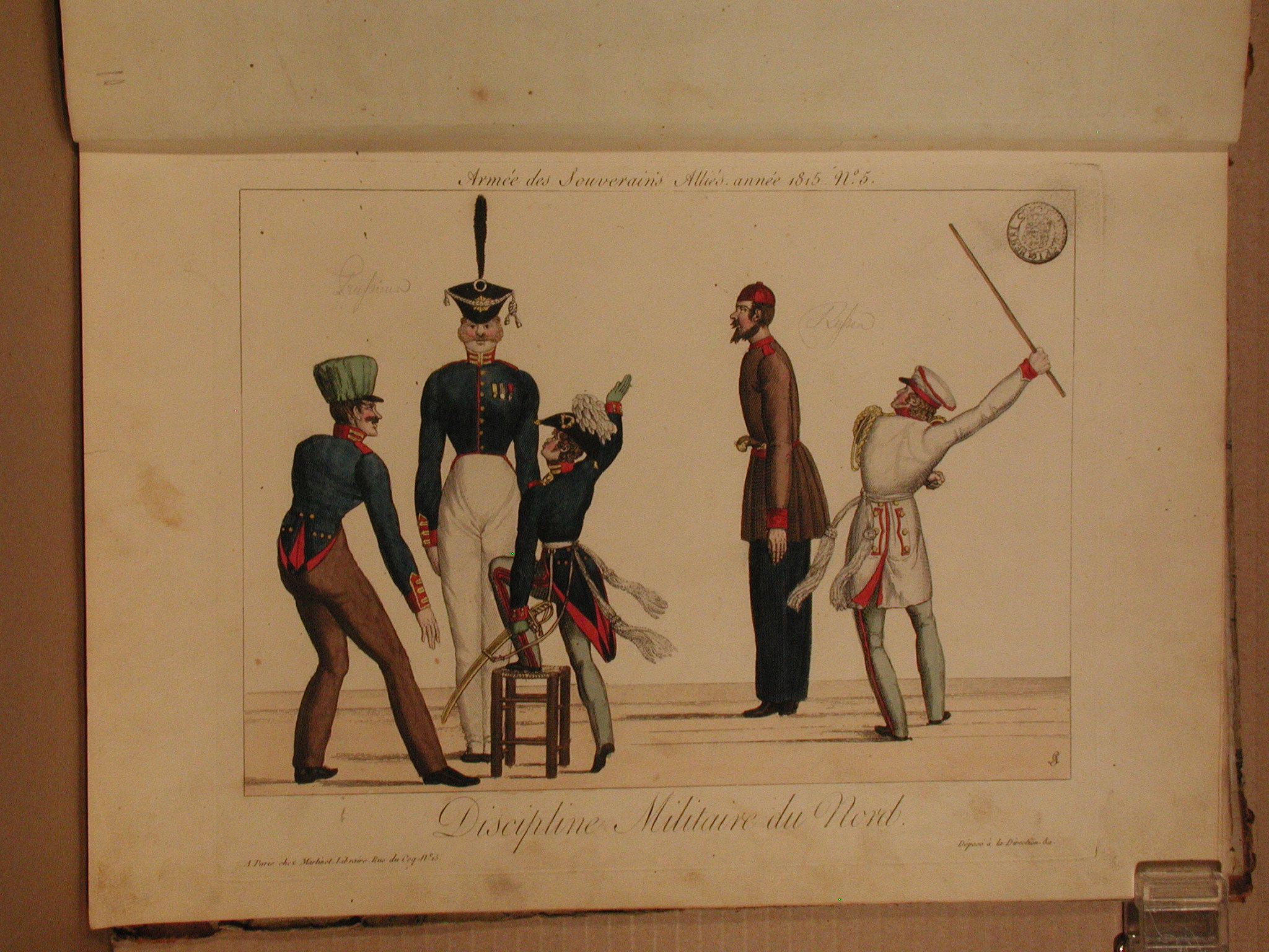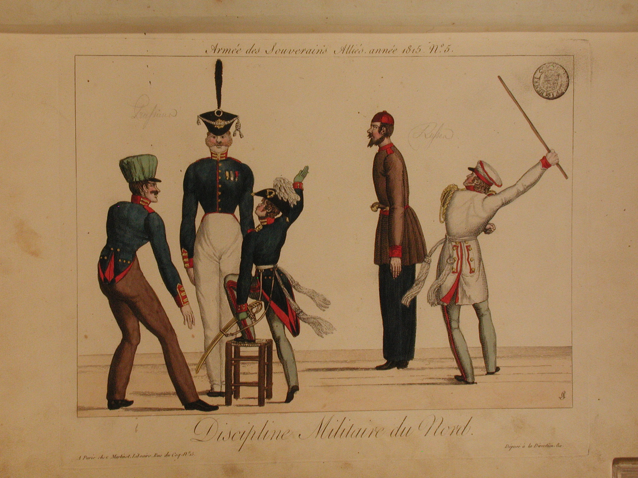 Закладка “Атрибуція” - Змiн. назва: Військова дисципліна Півночі./Наим. предмета, издания: гравюра/Змiн.Розміри дошки: 237х298/Змiн.розміри листа: 266х384/Змiн.додаток до назва (лист, ...): Аркуш № 5 з серії «Армія союзних монархів, 1815 рік» («Armée des Souverains Alliés, année 1815»./Змiн. авторські пiдписи i написи: угорі над зображенням «Armée des Souverains Alliés, année 1815. №5»; під зображенням - назва «Discipline militaire du Nord» («Військова дисципліна Півночі»); на зображенні у правому нижньому куті – монограма автора «AG»; під зображенням у лівому нижньому куті ім’я та адреса видавця: «à Paris chez Martinet librarie rue du Coq no.15»; у правому нижньому куті – позначка про реєстрацію: «Déposé à la Direction &c»./Змiн.опис: Праворуч російський офіцер у білій уніформі замахується палицею на високого солдата, оберненого до нього спиною, ліворуч – прусський солдат та два офіцери, один з яких забирається на табурет і замахується рукою на одного із солдатів./Змiн. Iншi написи, штампи, печатки, етикетки, наклейки: У правому верхньому куті кругла чорна печатка «HENRІ COMTE ILINSKI»; на зображенні написи олівцем: праворуч – «Russen», «Prussen»./Змiн. час створення: 1815.Автор, автор съемки: Годфруа Адріан Пьєр ФрансуаИзм. предметный классификатор: гравюраИзм. техника: офортИзм. техника: розфарбований від рукиНовый материал: папірИзм. комплект(ИЗО): Годфруа А. Armée des Souverains Alliés, année 1815 1814-16