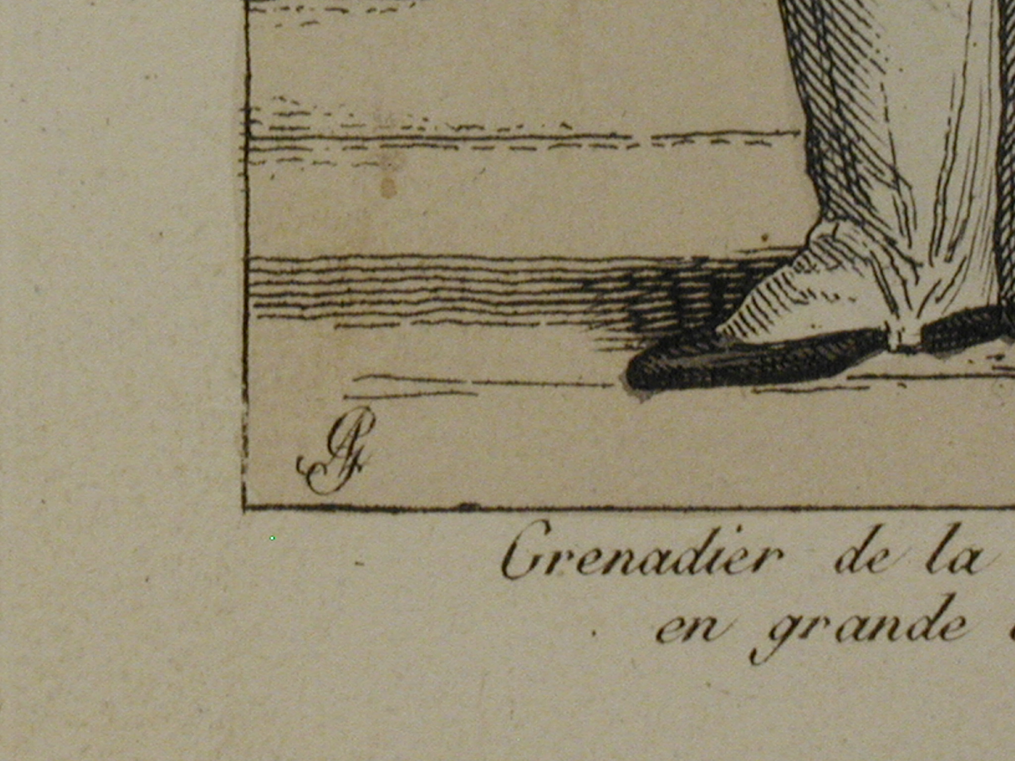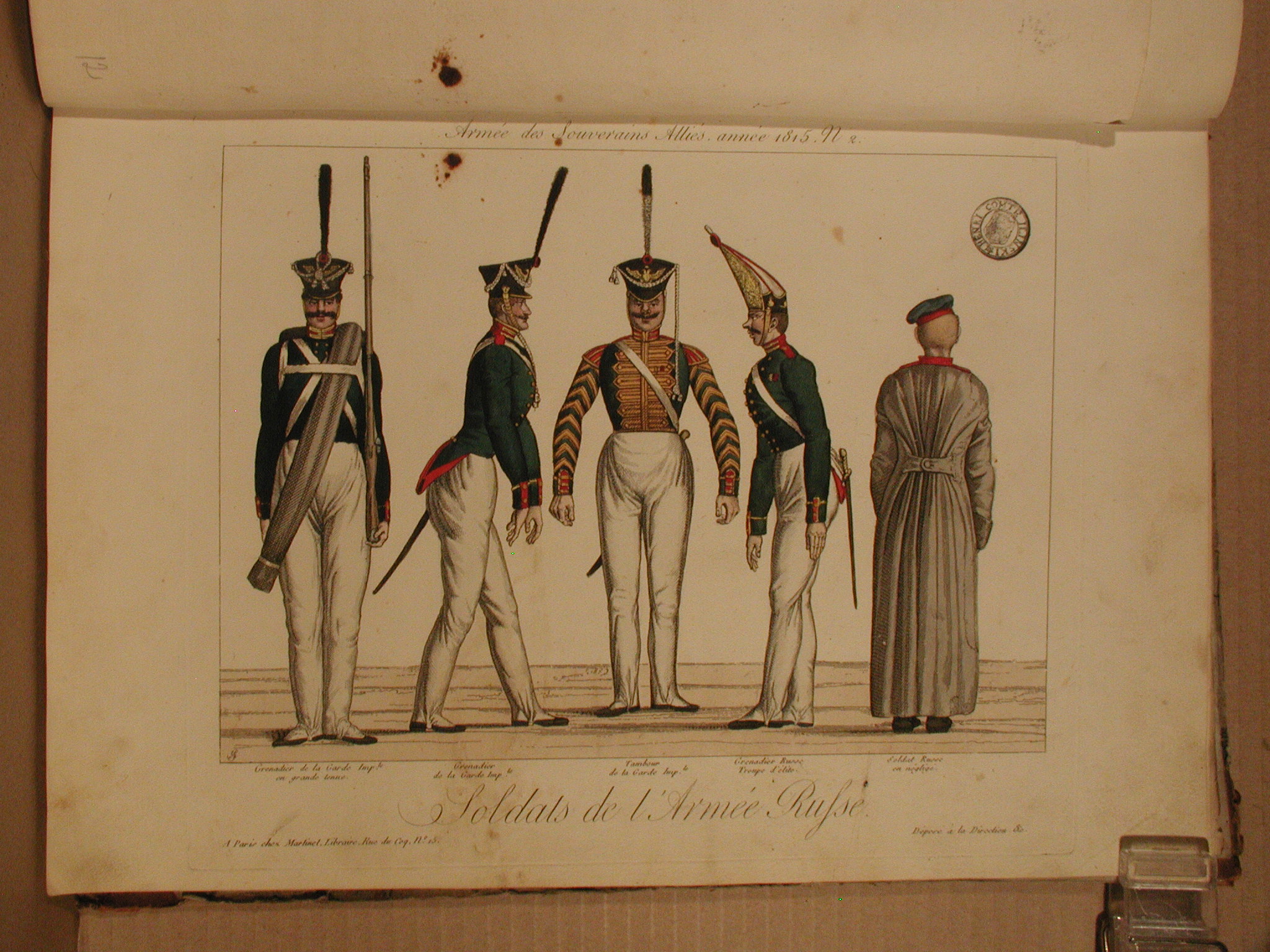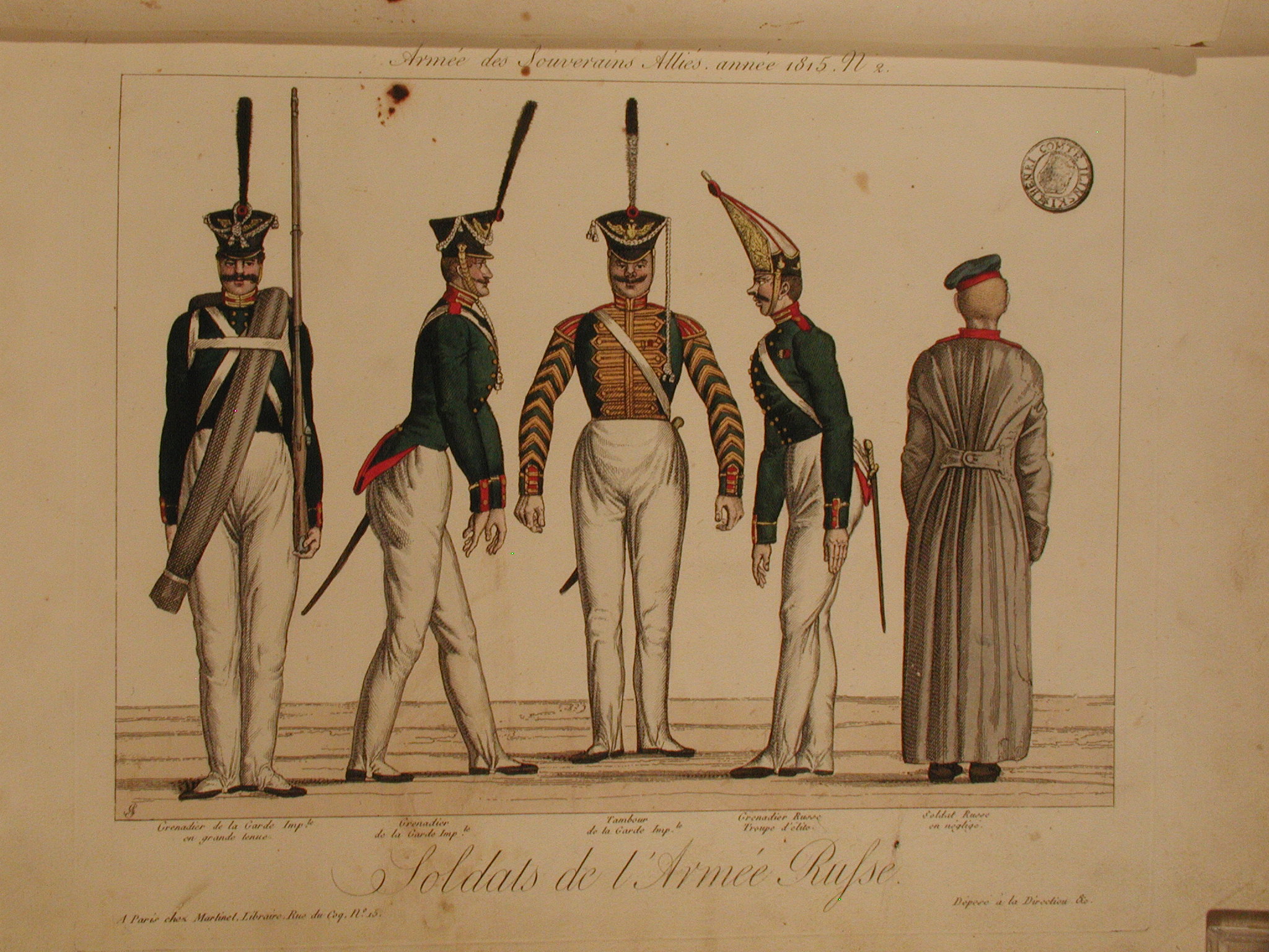 Информацiя об оригiнале: Над зображенням назва серії: «Armée des Souverains Alliés, année 1815 №2». Під зображенням назва аркуша: «Soldats de l'Armée Russe». Нижче ліворуч: «à Paris chez Martinet libraire rue du Cog no.15»; праворуч: «Dépesé à la Direction &c». Лыворуч на зображенны монограма гравера з лытерами CAF./Кількість: 1/Старі документи прийому: Акт № 1 від 05.01. 1952/Опис: Ліворуч гренадер імператорської гвардії в парадній формі; поруч - профільне зображення гренадера; в центрі - зображення барабанщика імператорської гвардії; праворуч - профільне зображення гренадера відбірних військ та зображення солдата в похідній формі спиною до глядача./ншi написи, штампи, печатки, етикетки, наклейки: Печатка: праворуч круглий відбиток чорним.