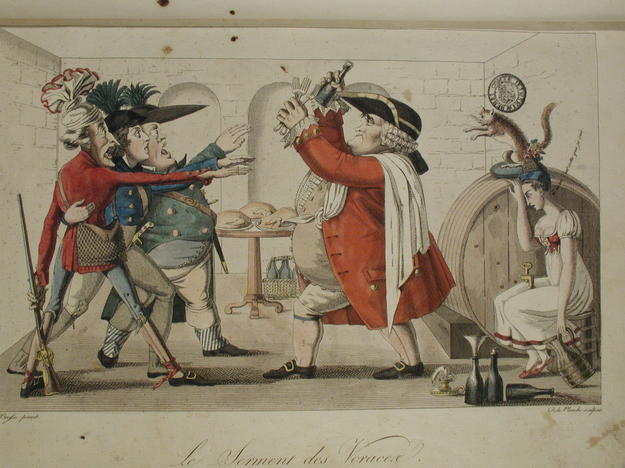 2. Bibliothèque nationale de France. «Le serment des Voraces», Paris. Notice n° : FRBNF41515553; RESERVE QB- 370 (71) -FT 4/Кількість: 1/Старі документи прийому: Акт № 1 від 05.01. 1952/Опис: Сцена в інтер'єрі підвалу з винною діжкою праворуч. Біля діжки - жінка, яка сидить з глеком в лівій руці. В центрі праворуч - профільне зображення товстуна в червоному жюстокорі з трема виделками та пляшкою в піднятих руках; ліворуч - профільне зображення трьох чоловіків з піднятою в присязі правою рукою./ншi написи, штампи, печатки, етикетки, наклейки: Печатка: угорі праворуч круглий відбиток чорним.