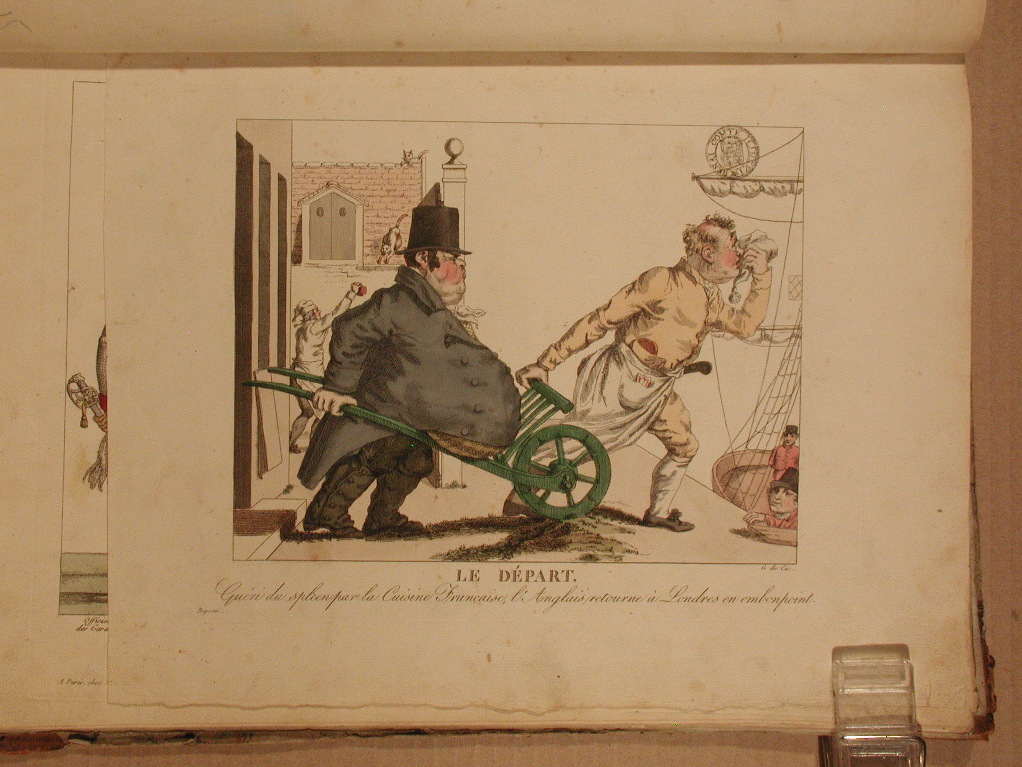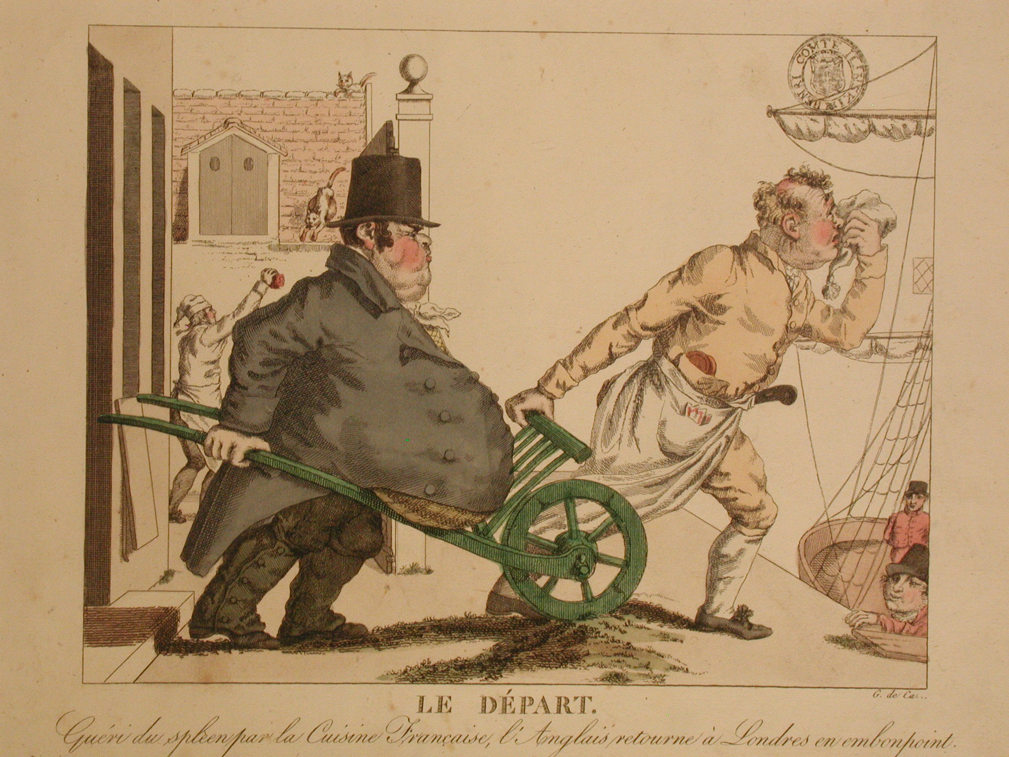 Комм.: Французька «відповідь» на численні англійські карикатури, в яких французи зображені за приготуванням рагу з котів. Зображений англієць, який від'їзджає з Франції після "лікування" від спліну французькою кухнею. Зображений на другому плані кухар, який годує кота м'ясом - натяк на те, що англієць був обдурений: під виглядом кролячого рагу йому подавали рагу з котів, а смуток власника заїзджого двору та гроші в кишені його фартуха свідчать, що такі страви ще й дорого коштували. Окрім простого глузування з дурості англійців є ще кілька сенсів: