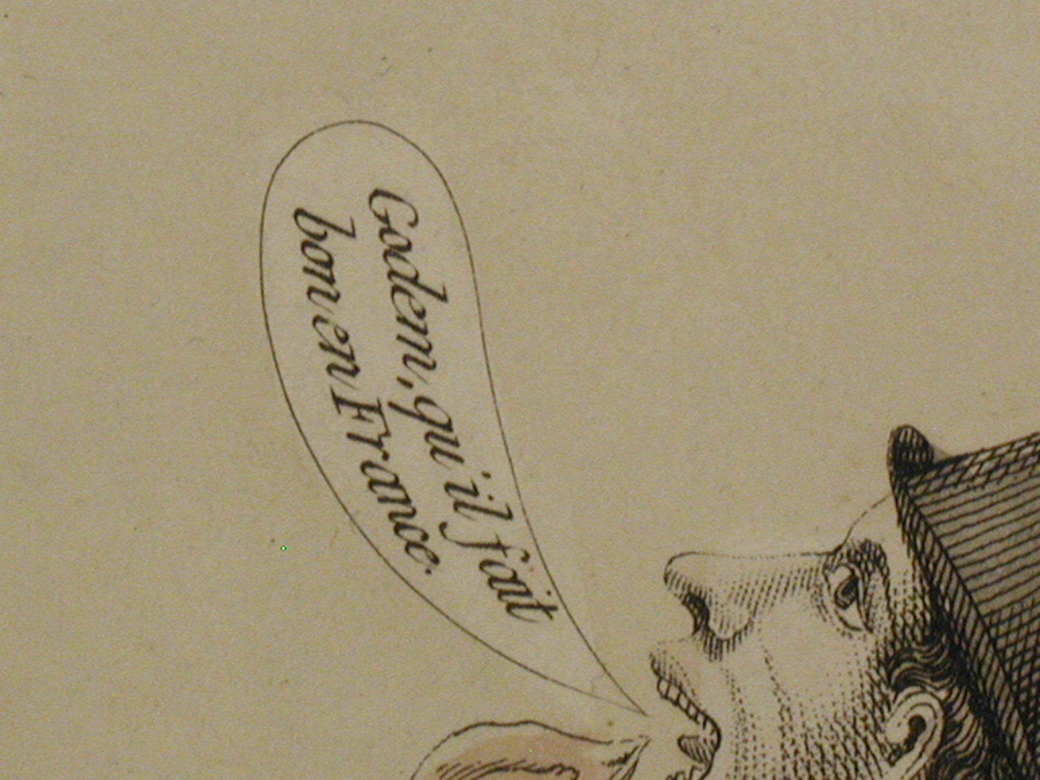 Закладка “Атрибуція” - Змiн. назва: Англійці у ресторатора в Парижі./Наим. предмета, издания: гравюра/Змiн.Розміри дошки: 238х329/Змiн.розміри листа: 263х382/Змiн.додаток до назва (лист, ...): аркуш № 2./Змiн. авторські пiдписи i написи: «Les Anglais chez le restaurateur à Paris», праворуч унизу позначка про реєстрацію: «Déposé à la Dion de l'Imrie», праворуч у горі «№2», англієць праворуч промовляє: «Goddem, qu'il fait bon en France»(«Чорт забирай, як добре у Франції!»)./Змiн.опис: Зображено двох англійців, які їдять за столом, що заставлений тарілками з курчатами, склянками, навколо – курячі кістки, розбиті тарілки і пляшки./Змiн. Iншi написи, штампи, печатки, етикетки, наклейки: На зображенні біля правого краю, угорі печатка «HENRI COMTE ILINSKI»/Змiн. час створення: 1814 або 1815Изм. предметный классификатор: гравюрамісце створення, школа: ФранціяНовый материал: папірИзм. техника: офортИзм. техника: розфарбований від руки