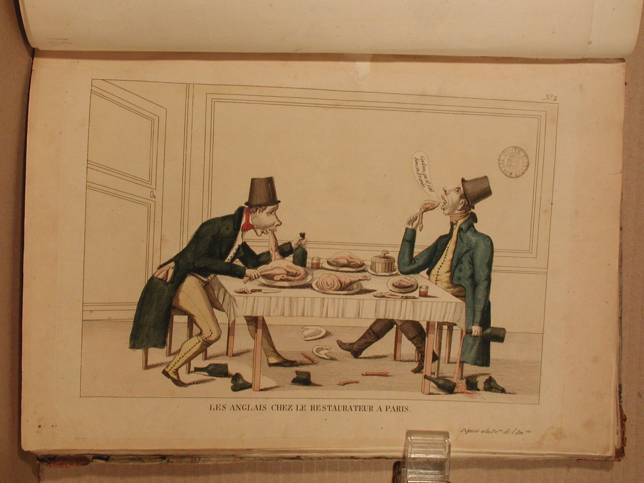 2. Інший відбиток: Bibliothèque nationale de France. Les Anglais chez le restaurateur à Paris. Notice n° : FRBNF41513946; RESERVE QB- 370 (56) -FT 4 http://catalogue.bnf.fr/ark:/12148/cb415139466/Кількість: 1/Старі документи прийому: Акт № 1 від 05.01. 1952/Опис: Карикатурне зображення двох чоловіків у фраках та циліндрах, які обідають за великим столом, зображеним на передньому плані. На столі - блюда з дичиною та пляшки, під столом - розбитий посуд, кістки./ншi написи, штампи, печатки, етикетки, наклейки: Печатка: угорі праворуч круглий відбиток чорним.