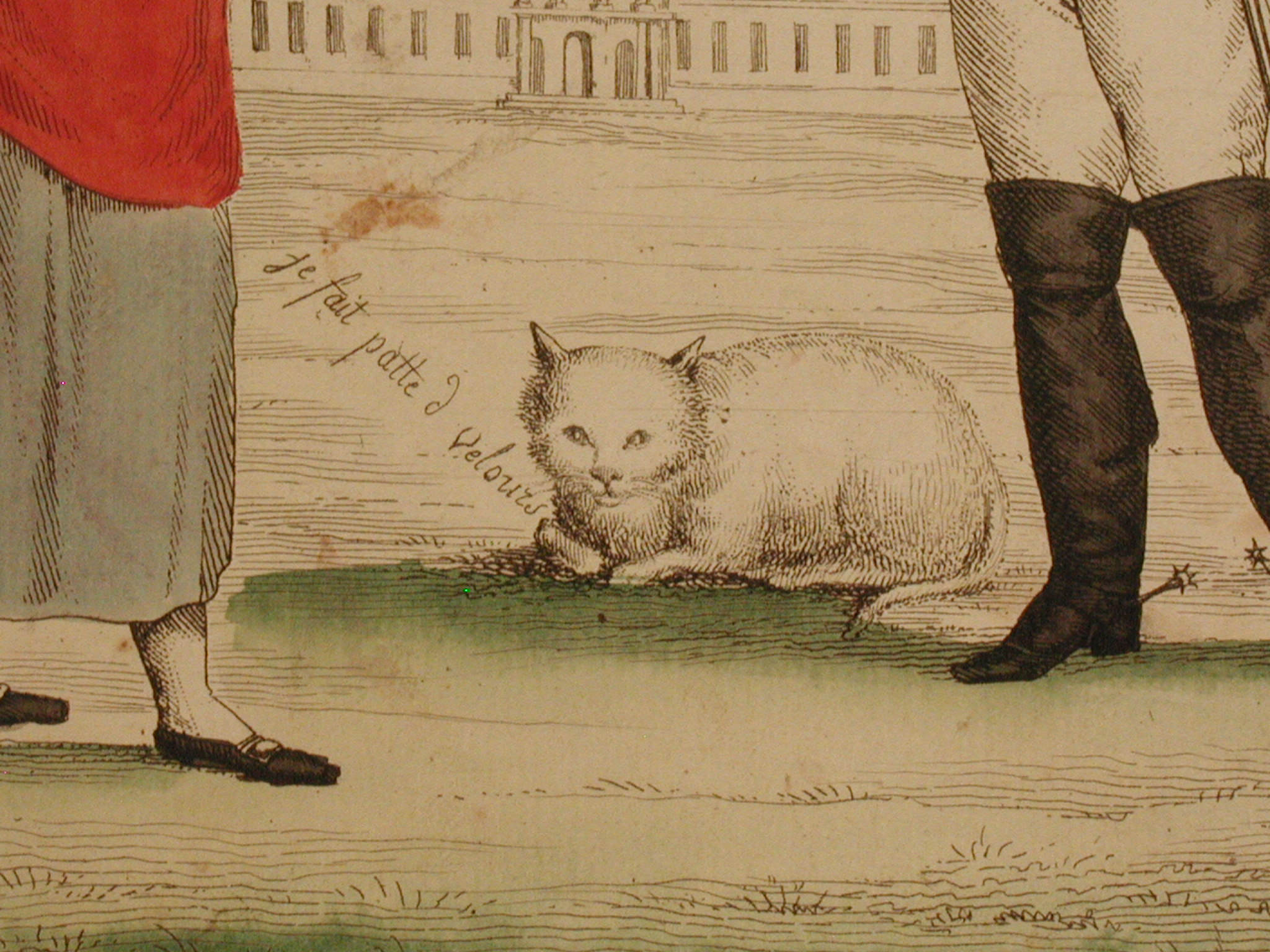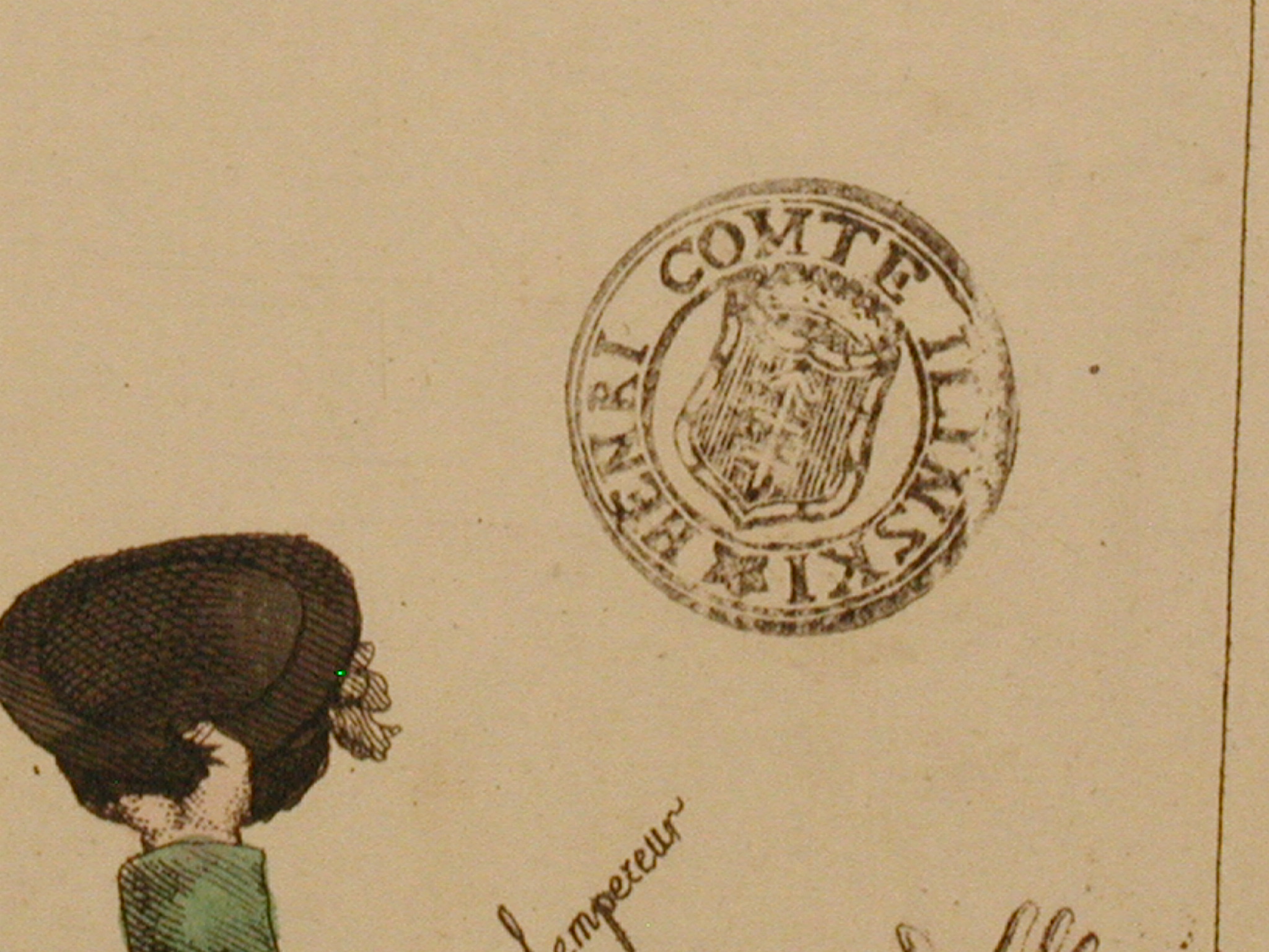 2. Інший відбиток: British museum. «Arrivée De Nicolas Buonaparte aux tuilleries le 20 Mars 1815». 1815. Registration number: 1989,1104.33; AN 102676001/Кількість: 1/Старі документи прийому: Акт № 1 від 05.01. 1952/Опис: В центрі зображений Наполеон в мундирі, трикутному капелюсі з кокардою, зі зверненням в правій руці. Біля його ніг білий кіт, поряд із ним напис-репліка: «Je fait patte d’ Velours». Праворуч біля помосту з написом «Recompense Militaire» ("Військова нагорода") - двоє чоловіків з піднятими вгору руками, жебрак в лохміттях та смерть з косою. Ліворуч - три жінки і двоє чоловіків, які слухають звернення./ншi написи, штампи, печатки, етикетки, наклейки: Печатка: угорі праворуч круглий відбиток чорним.