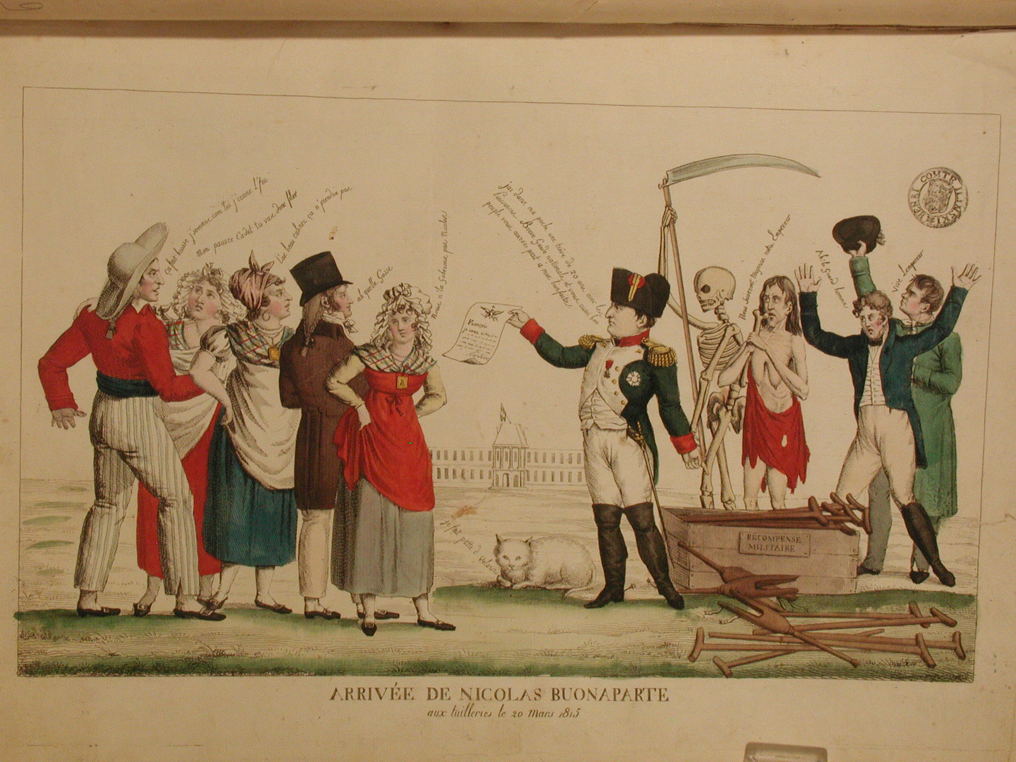 Наполеон насправді прибув 20 березня 1815 року до Парижу, де біля палацу Тюільрі на нього очікував натовп народу. Навідміну від того, що зображено на карикатурі, люди з і сльозами радості рвалися до Наполеона, підхопили його на руки і занесли до палацу./Информацiя об оригiнале: Під зображенням назва французькою мовою в два рядки: "ARRIVÉE DE NICOLAS BUONAPARTE/aux tuilleries le 20 Mars 1815"./Аналогіi: 1. Інший відбиток: Bibliothèque nationale de France. «Arrivée De Nicolas Buonaparte aux tuilleries le 20 Mars 1815». 1815. Notice n° : FRBNF41515695. RESERVE QB- 370 (72) -FT 4 http://catalogue.bnf.fr/ark:/12148/cb415156952