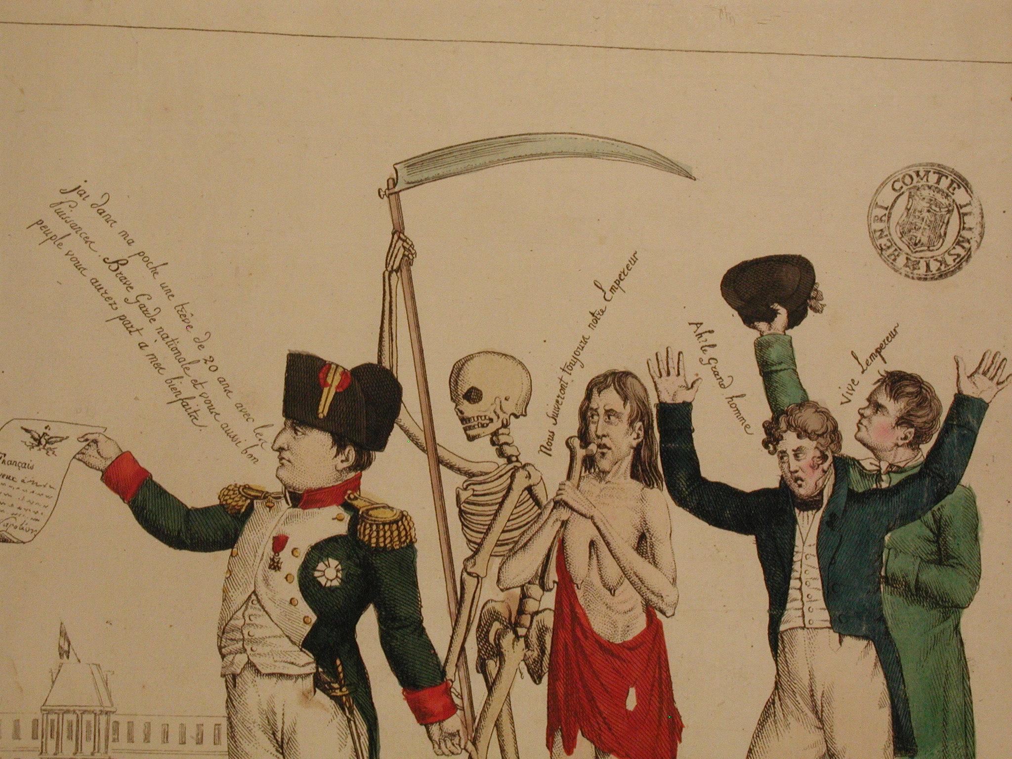 Комм.: Роялістська антинаполеонівська карикатура часів «Ста днів». Одна з карикатур, які зображають Наполеона у супроводі алегоричних фігур Злиднів та Смерті, яким він платить данину жертвами своїх військових походів.