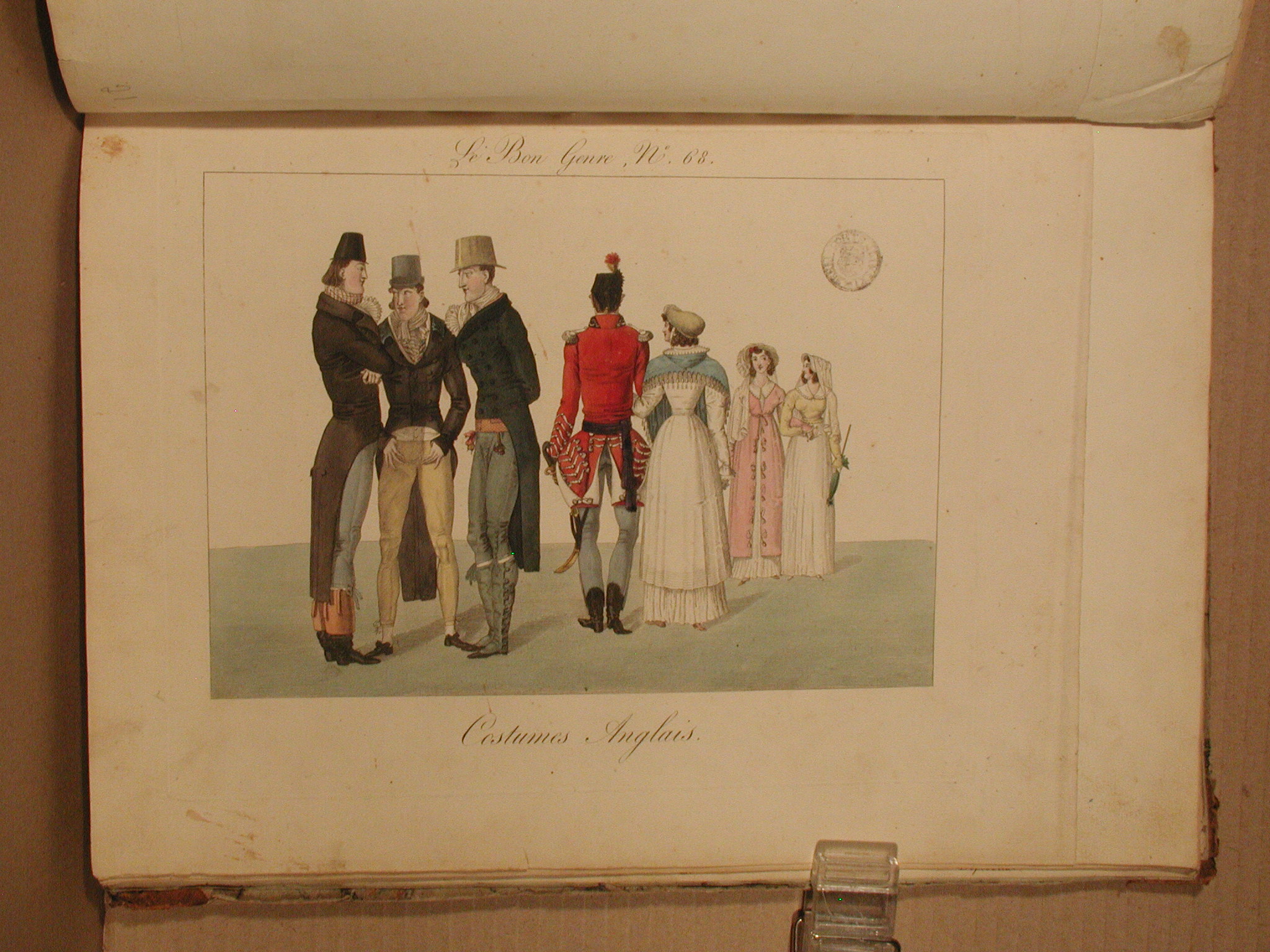 Информацiя об оригiнале: Над зображенням назва серії: "Le Bon Genze № 68" ("Хороший стиль № 68"). Під зображенням назва аркуша французькою мовою: "Costumes Anglais"./Аналогіi: 1. Інший відбиток: British museum. «Costumes Anglais», 1814. Registration number: 1868,0822.7244, AN 15406001 http://www.britishmuseum.org/research/search_the_collection_database/search_object_details.aspx?objectid=1336801&partid=1&searchText=satirical+print+Costumes+Anglais&fromADBC=ad&toADBC=ad&numpages=10&orig=%2fresearch%2fsearch_the_collection_database.aspx¤tPage=3/Кількість: 1/Старі документи прийому: Акт № 1 від 05.01. 1952/Опис: Ліворуч - карикатурне зображення трьох чоловіків у фраках та циліндрах, з пишними жабо, в центрі - спиною до глядача дама в білій сукні з блакитною шаллю під руку з офіцером в червоному мундирі, праворуч - обличчами до глядача зображені під руку дві дівчини в рожевій сукні та жовтій блузці, із зеленою парасолькою в лівій руці./ншi написи, штампи, печатки, етикетки, наклейки: Печатка: угорі праворуч круглий відбиток чорним.