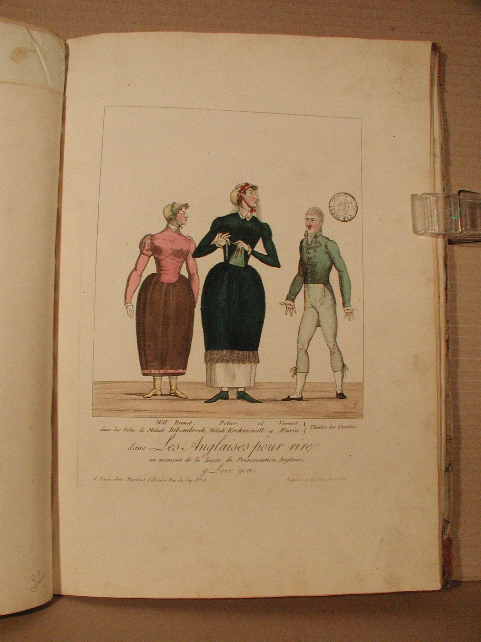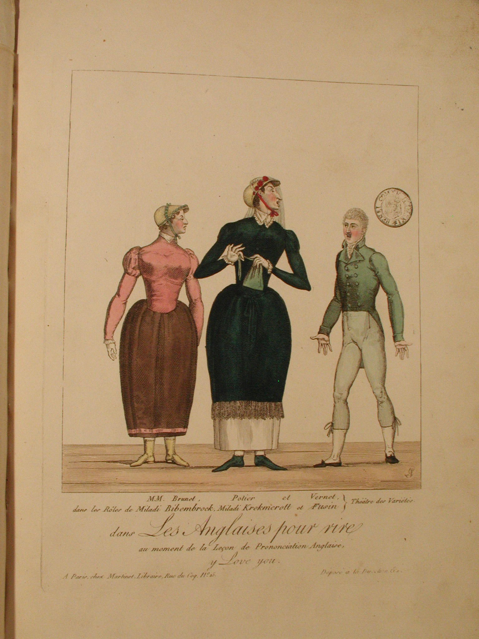 Комм.: Сцена з комедійної вистави Севрена (Sewrin) та Дюмерсана (Dumersan) «Англійки заради сміху», прем'єра якої відбулася в Парижі, в театрі Вар’єте 26 грудня 1814 року. Три актори – Брюне, Потьє та Верне, двоє з яких (Брюне та Потьє) одягнені, відповідно до своїх ролей, в незграбні жіночі костюми, зображені під час чотирнадцятої сцени – уроку англійської вимови.