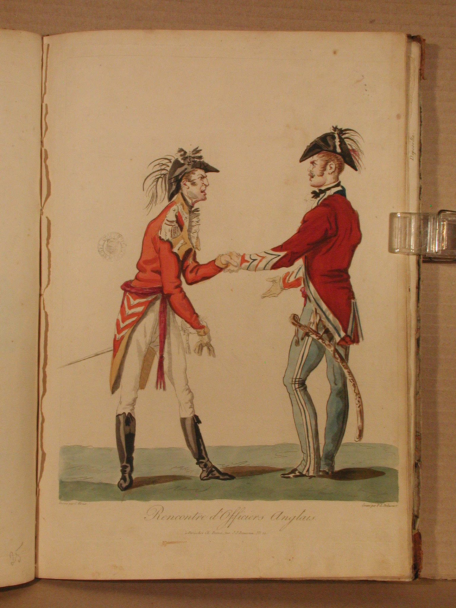 Комм.: Відповідно до каталогу М. Д. Джордж (Vol. IX., 1949 - № 12379), офіцер ліворуч може бути герцогом Веллінгтоном, який за щось сварить іншого, який намагається виправдатися./Информацiя об оригiнале: Під зображенням ліворуч: "Dessiné par C. Vernet"; праворуч: "Gravé par P. L. Debucourt". Нижче назва французькою мовою: "Rencontre d'Officiers Anglais". Під назвою напис: "à Paris chez Ch. Bance rue J. J. Rousseau No.10"./Аналогіi: 1. інший стан (з нумерацією): British Museum. «Rencontre d'officiers anglais / Collection de costumes dessinés d'après nature», 1814. Registration number: 1861,1012.405