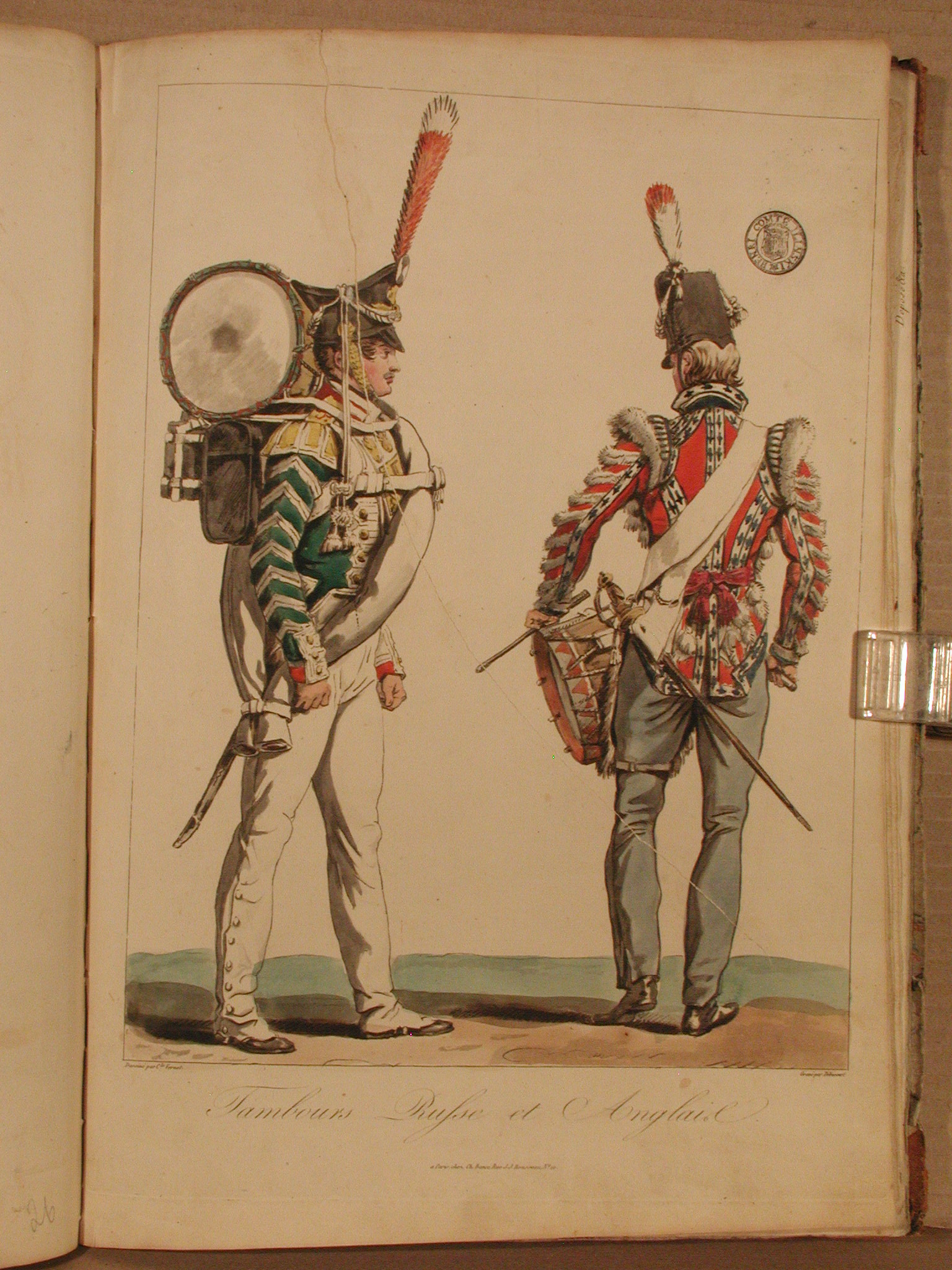 Закладка “Атрибуція” - Змiн. назва: Російський і англійський барабанщики./Наим. предмета, издания: гравюра/Змiн.розміри листа: 384х266/Змiн.додаток до назва (лист, ...): Серія "Колекція костюмів, намальованих з натури", частина 3, № 3/Змiн. авторські пiдписи i написи: Під зображенням – назва аркуша: «Tambours russe et anglais» («Російський та англійський барабанщики»); нижче – ім′я та адреса видавця: «à Paris chez Ch. Bance rue J. J. Rousseau No.10»; під зображенням ліворуч ім′я рисувальника: «Dessiné par C. Vernet», праворуч – гравера: «Gravé par P. L. Debucourt»/Змiн.опис: Ліворуч – російський барабанщик, хображений в профіль, праворуч – англійський барабанщик, зображений зі спини./Змiн. Зведення про відбиток: Стан: до нумерації аркушів серії./Змiн. Iншi написи, штампи, печатки, етикетки, наклейки: На зображенні праворуч угорі - кругла чорна печатка «HENRІ COMTE ILINSKI»./Змiн. час створення: 1814Изм. предметный классификатор: гравюраНовый материал: папірИзм. техника: офортИзм. техника: розфарбований від рукимісце створення, школа: ФранціяИзм. комплект(ИЗО): «Collection de costumes dessinés d'après nature» 1814-1818