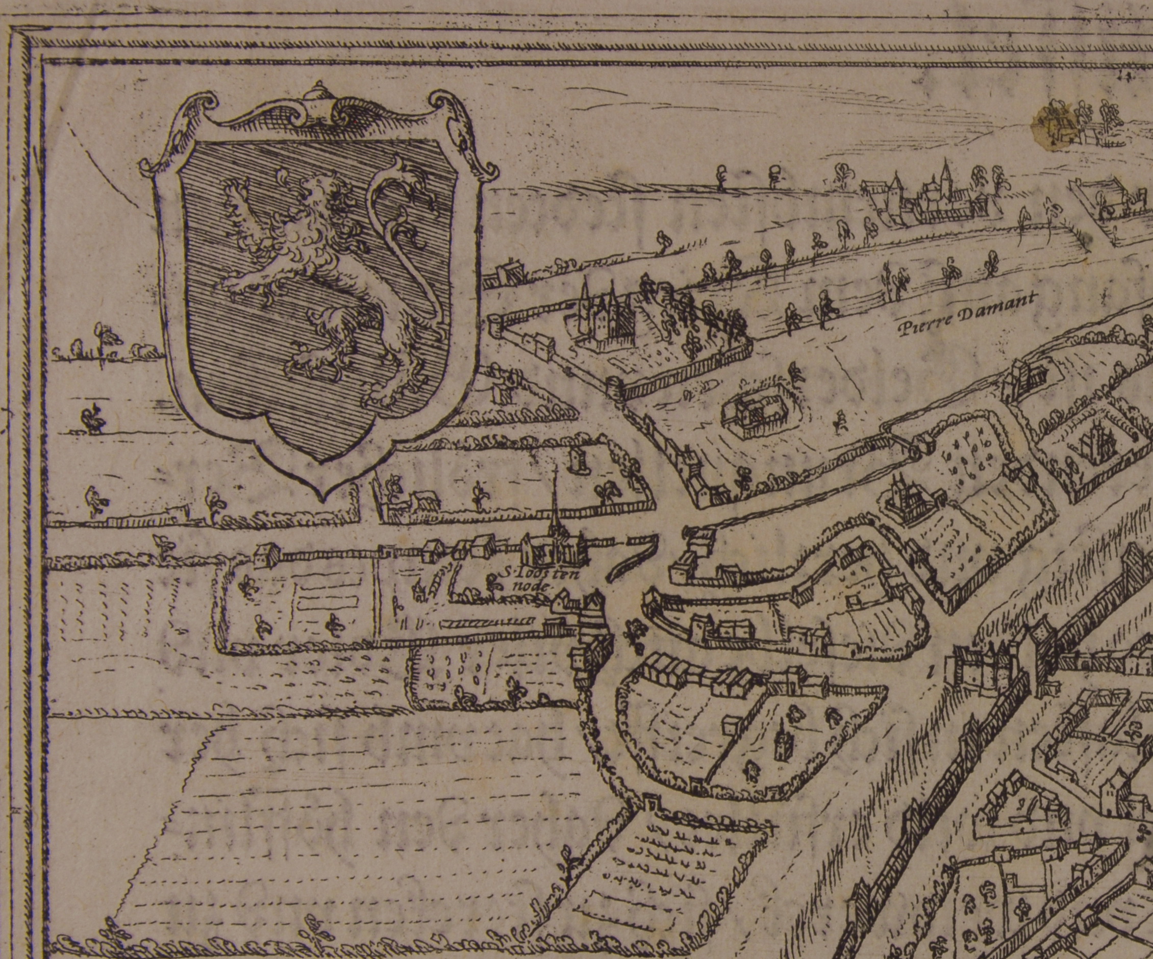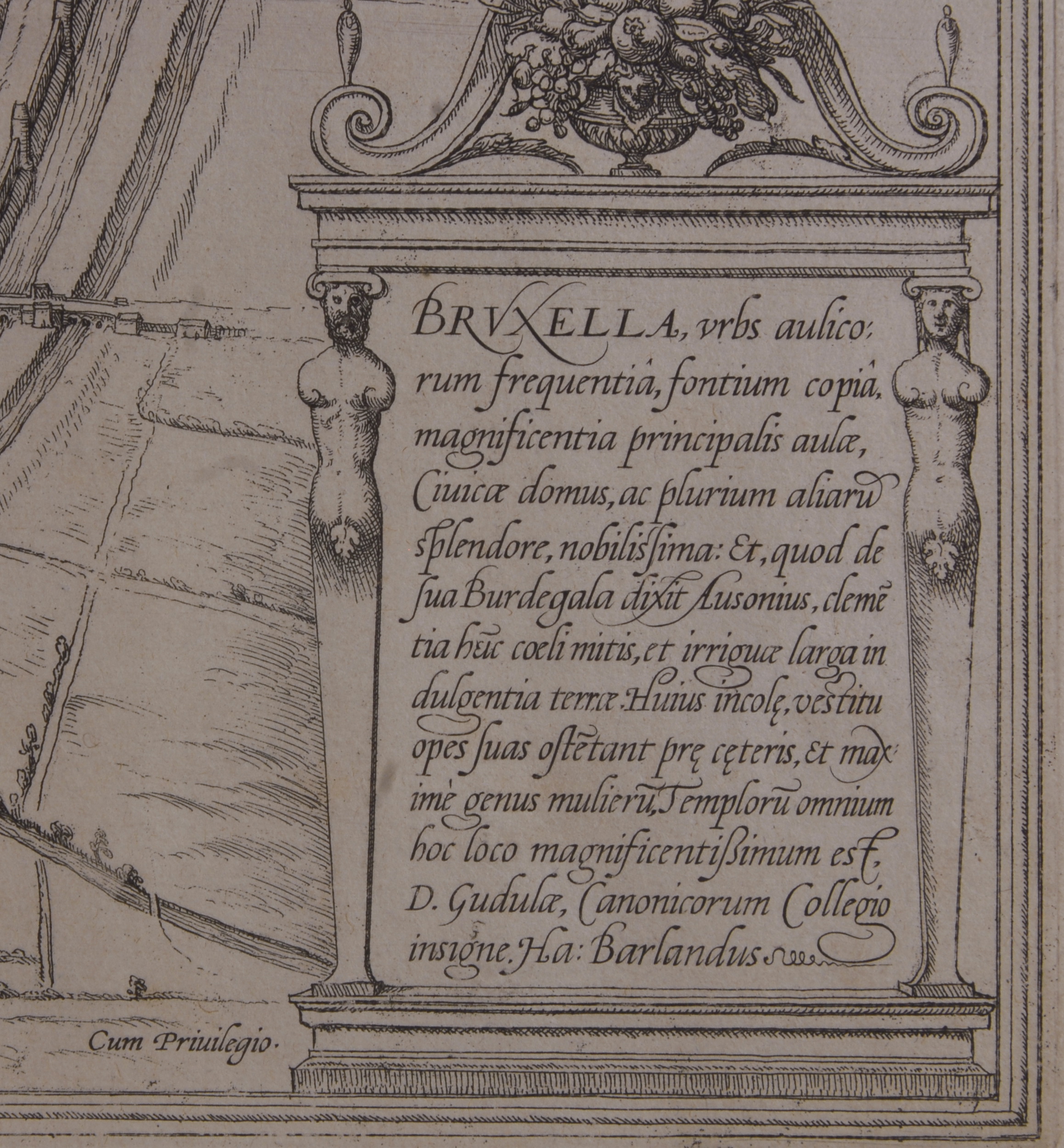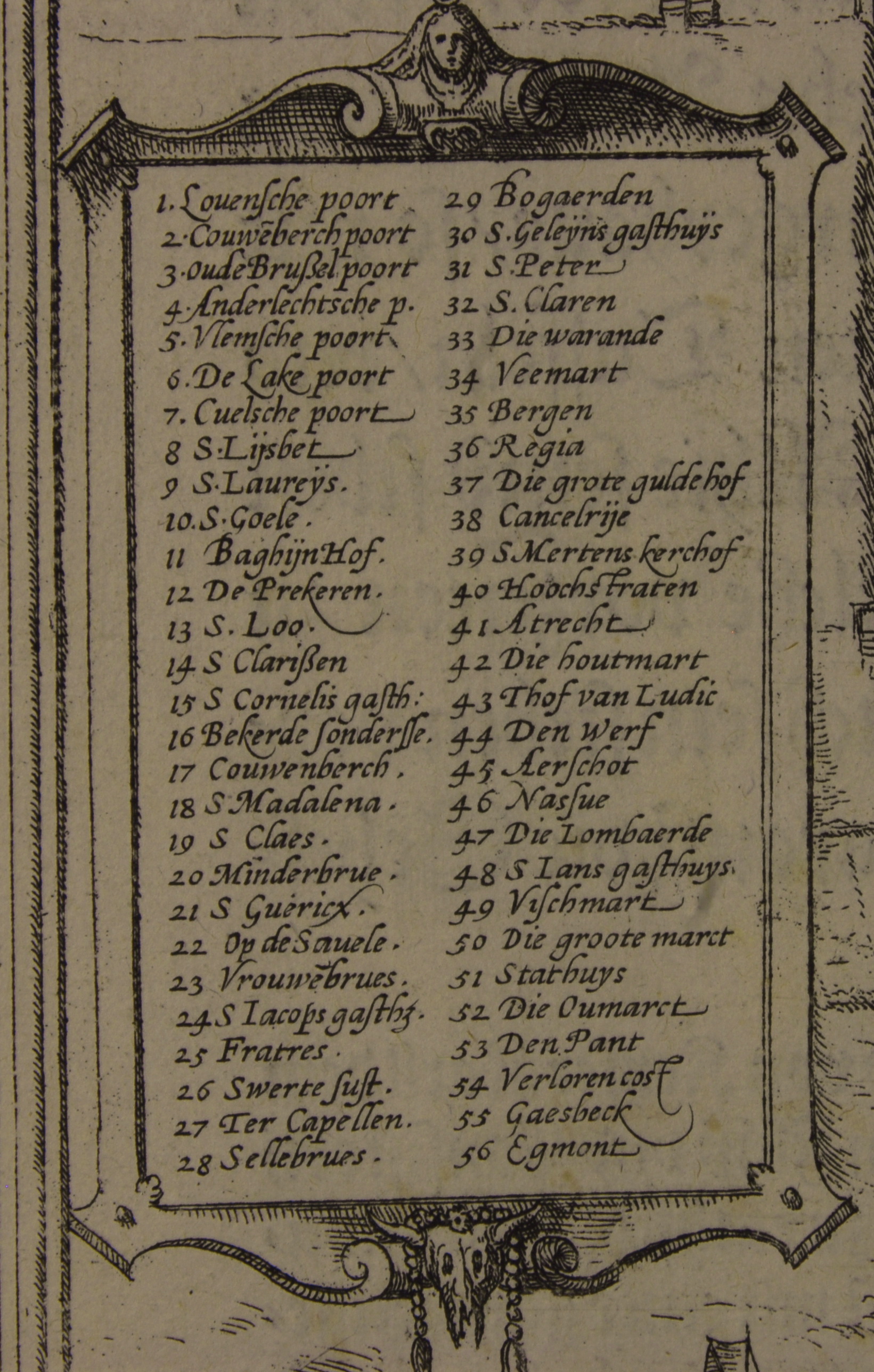 Ліворуч посередині у картуші легенда з 56 позицій: 1. Louesnche poort. 2. Couweberch poort. 3. Oude Brussel poort. 4. Anderlechtshe p. 5. Vlemsche poort. 6. De Lake poort. 7. Cuelsche poort. 8. S.Lijsbet. 9. S. Laureÿs. 10. S.Goele. 11. Baghÿn Hof. 12. De Prekeren. 13. S. Loo. 14. S.Clarissen. 15. S. Cornelis gasth. 16. Bekerde Sondersse. 17. Couwenberch. 18. S. Malalena. 19. S. Claes. 20. Minderbrue. 21. S. Guericx. 22. Op de Sauele. 23. Vrouberbrues. 24. S. Jacobs gasths. 25. Fratres. 26. Swetre sust. 27. Ter Capellen. 28. Selebrues. 29. Bogaerden. 30. S. Geleÿns gasthhuÿs. 31. S. Peter. 32. S. Claren. 33. Die warande. 34. veemart. 35. Bergen. 36. Regia. 37. Die grote guldehof. 38. Cancelsrije. 39. S. Mertens kerchof. 40. Hoochstraten. 41. Atrecht. 42. Die houtmart. 43. Trof van Ludic. 44. Den Werf. 45. Aerchot. 46. Nassue. 47. Die Lombaerde. 48. S. Lans gasthues. 49. Vischmart. 50. Die groote marct. 51. Stathuis. 52. Outmarct. 53.Den pant. 54. Verloren cost. 55. Gaesbeck. 56. Edmont.