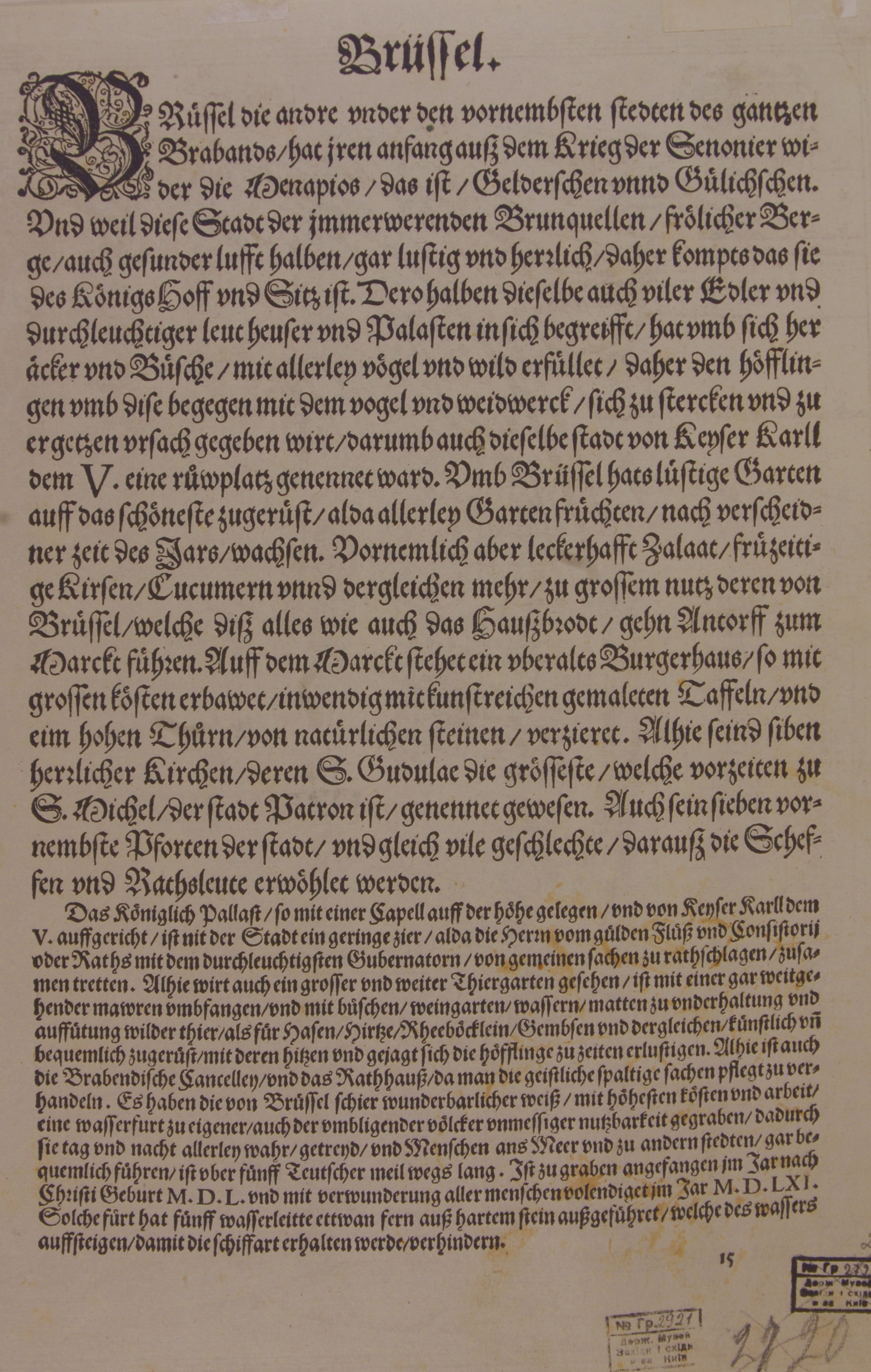Закладка “Атрибуція” - Змiн. "на звороті": На звороті німецькою мовою готичним шрифтом коментар Георга Брауна: (Брюссель - найблагородніше місто у всьому Брабанті, тож обране королями як їхня резиденція, оскільки воно має джерела, що не висихають, здорове повітря і високі пагорби, котрі милують зір. […] Королівський палац, розташований на пагорбі, був побудований імператором Карлом V і є значною окрасою міста; не випадково лицарі Золотого Руна і радники зустрічаються там на раді з Правителем. […] Водний шлях був проритий з Брюсселя дивовижним чином, - це коштувало чимало грошей і вели/Змiн. назва: План міста Брюсселя з висоти пташиного польоту./Наим. предмета, издания: гравюра/Змiн.Розміри дошки: 333х477/Змiн.розміри листа: 353х494/Змiн.додаток до назва (лист, ...): З видання: Braun and Hogenberg. Civitates Orbis Terrarum, I, 14/Змiн. авторські пiдписи i написи: У правому нижньому куті у картуші текст латиною: «BRUXELLA, urbs aulicorum frecentia, fontium copia, magnificentia principalis aulœ, Ciuicœ domus, ac plurium aliaru splendore, nobilissima: Et, quod de sua Burdegala dixit Ausonius, clemĕtia hεĩc coeli mitis, irriguœ larga in dulgentia terrœ. Huius incolę, vestitu opes suas ostĕtant prę cęteris, Et maximè genus mulierŭ, Templorŭ omnium hoc loco magnificentissimum est, D. Gudulœ, Canonicorum Collegio insigne. Ha: Barlandus» (Брюссель - це місто, що славиться численними придворними, повноводими джерелами, пишнотою королівського двору, своєю ратушею і багатьма іншими речами. І, як Авсоній сказав про свою Бурдегалу, має щедрість м’якого клімату і добре зрошуваних ґрунтів. Жителі, особливо жінки, демонструють своє багатство вибагливим вбранням. Найрозкішніша церква Святої Гудули, вирізняється також своїм коледжем каноніків (згідно Г. Барланду).