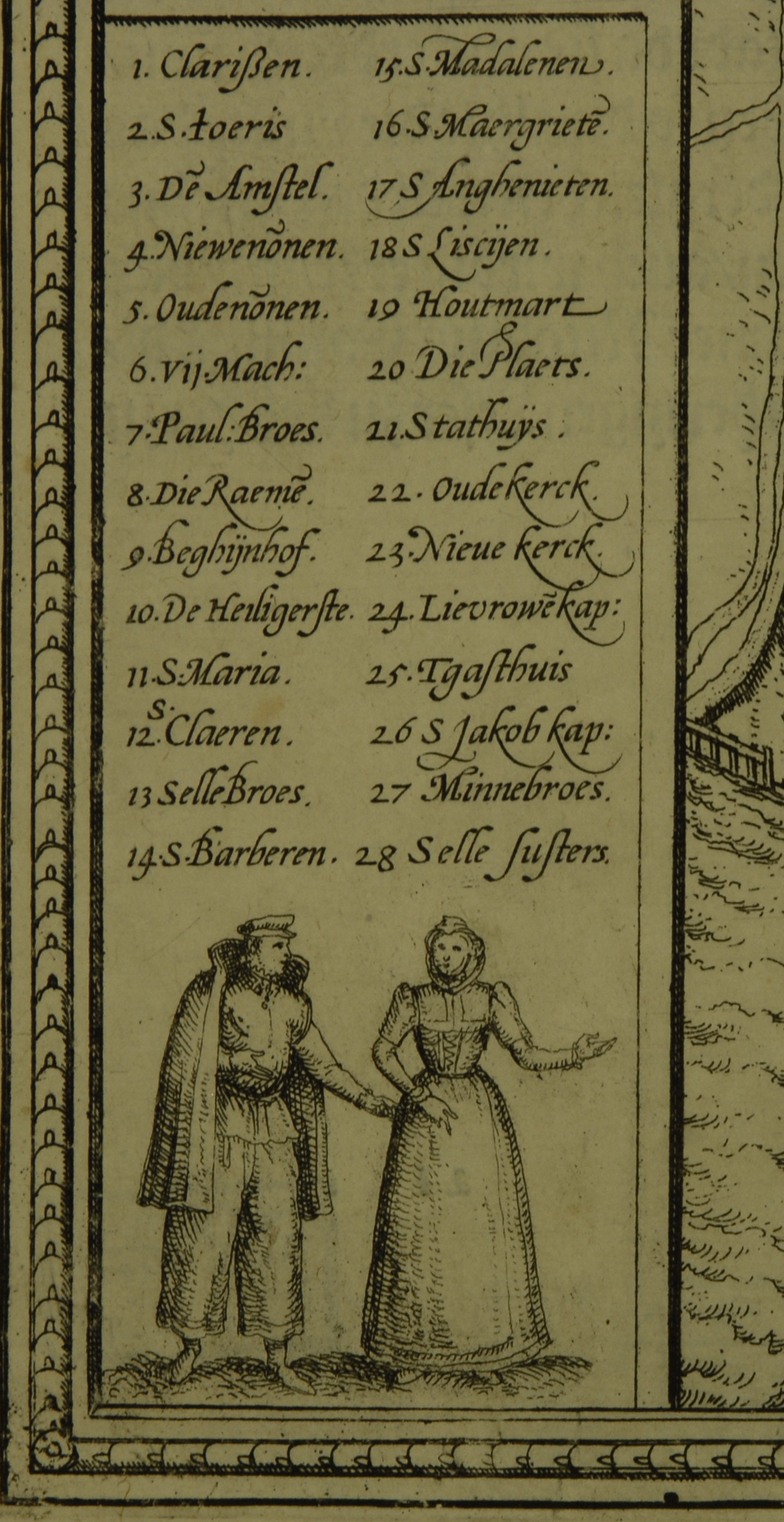 У лівому нижньому куті у картуші легенда з 28 позицій: “1. Clarissen. 2. S toeris 3. Dĕ Amstel. 4. Niewenõnen. 5. Oudenõnen. 6. vij. Mach: 7. Paul: Brous. 8. Die Raemĕ. 9. Bedhijnhof. 10. De Heilingerte. 11. S. Maria. 12. S. Claeren. 13. Selle Broes. 14. S. Barberen. 15 S. Madalenen. 16. S. Anghenieten. 17. S. Liscijen. 18. S. Licijen. 19. Houtmart 20. Die Plaers. 21. Stathuÿs. 23. Oude Kerk. 24. Nieue Kerk. 24. Lievrovekap. 25. Igasthuis 26 S Jacob Kap: 27 Minnebroes. 28. Selle susters. ”