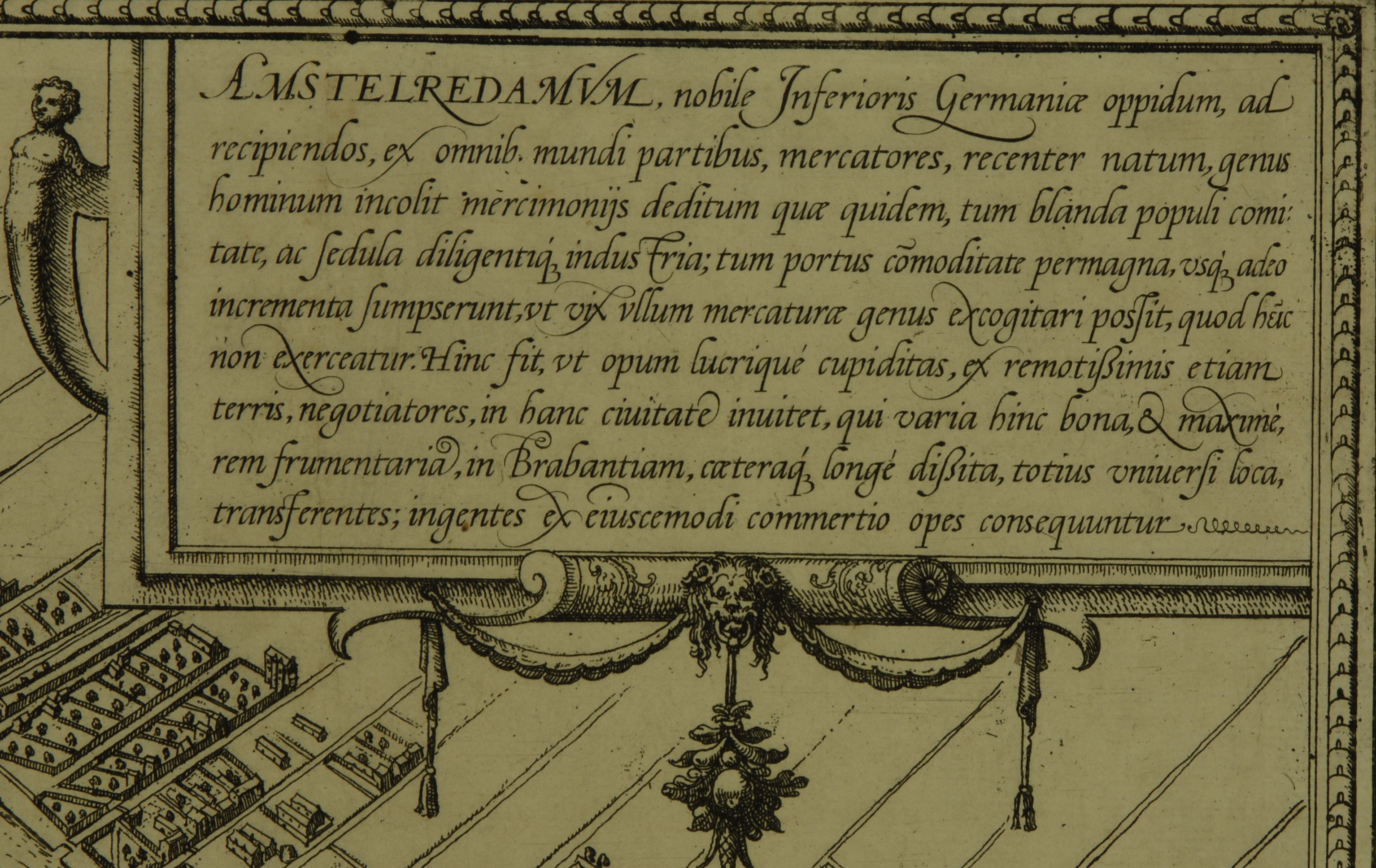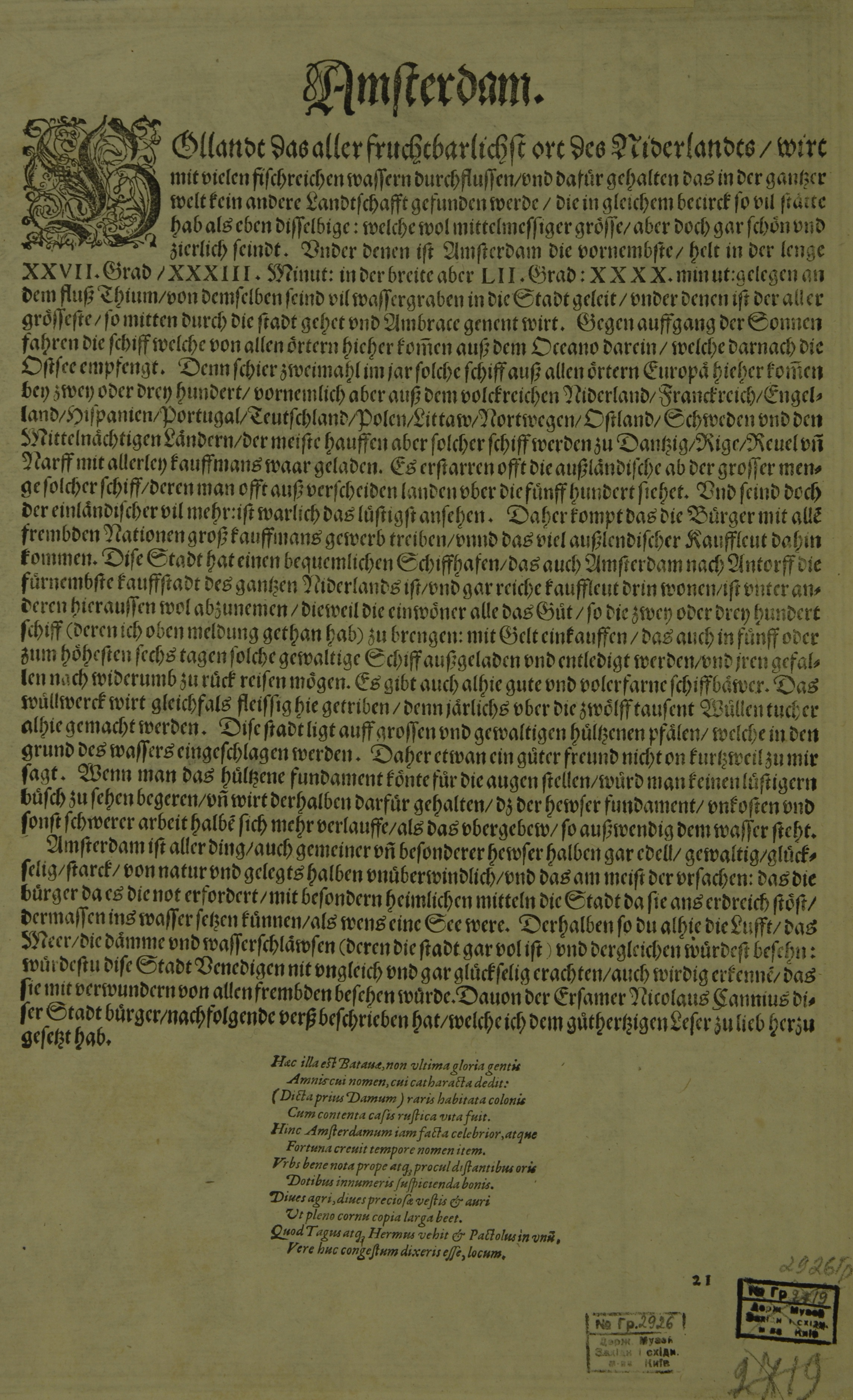 Закладка “Атрибуція” - Змiн. "на звороті": На звороті німецькою мовою готичним шрифтом коментар Георга Брауна: (Голландія – найродючіша частина Нідерландів. Її перетинають численні водні шляхи, багаті рибою; тому в цілому світі немає іншої місцевості, в якій так багато міст існує на такій обмеженій території. Серед них найблагородніший - Амстердам. Він стоїть на річці Амстел, від якої багато каналів тече крізь місто. Приблизно двічі на рік численні кораблі прибувають сюди з усієї Європи, десь 200 чи 300 - з Нідерландів, Франції, Англії, Іспанії, Португалії, Німеччини, Польщі, Литви, Норвег/Змiн. назва: План міста Амстердама з висоти пташиного польоту./Наим. предмета, издания: гравюра/Змiн.Розміри дошки: 340х486/Змiн.розміри листа: 349х493/Змiн.додаток до назва (лист, ...): З видання: Braun and Hogenberg. Civitates Orbis Terrarum, І, 20/Змiн. авторські пiдписи i написи: У правому верхньому куті картуш з текстом латиною: “Amsterdamum, nobile Inferioris Germaniœ oppidum ad recipiendos, ex omnib. mundi partibus, mercatores, recenter natum, genus hominum incolit mercimonijs deditum quœ quidem, tum blanda populi comitate, ac sedula diligentiq industria; tum portus cõmoditate permagna, vsq adeo incrementa sumpserunt, vt vllum mercaturœ genus exorgitari posit, quod heic non exerceatur. Hinc fit, vt opum sucriqué cupiditas, ex remotissimis etiam terries, negotiatores, in hanc ciuitate inuitet, qui varia hinc bona, & maxime rem frumentaria, in Brabantiam, cœteraq Congé dissita, totius vniuersi loca, transferentes; ingentes ex eiscemondi commertio opes consequuntur” (Амстердам – широко відоме місто у Нижній Німеччині; воно виникло нещодавно; там оселилися купці і мешкають люди, пов’язані з торгівлею. Не можна уявити собі комерційної діяльності, якої не було б тут. Тому вигода, котру шукають ділові люди, веде їх від цього міста аж до найвіддаленіших країн, звідки перевозять різноманітні товари, перш за все зерно до Брабанту і в інші краї. Грандіозні прибутки від торгівлі такого роду).