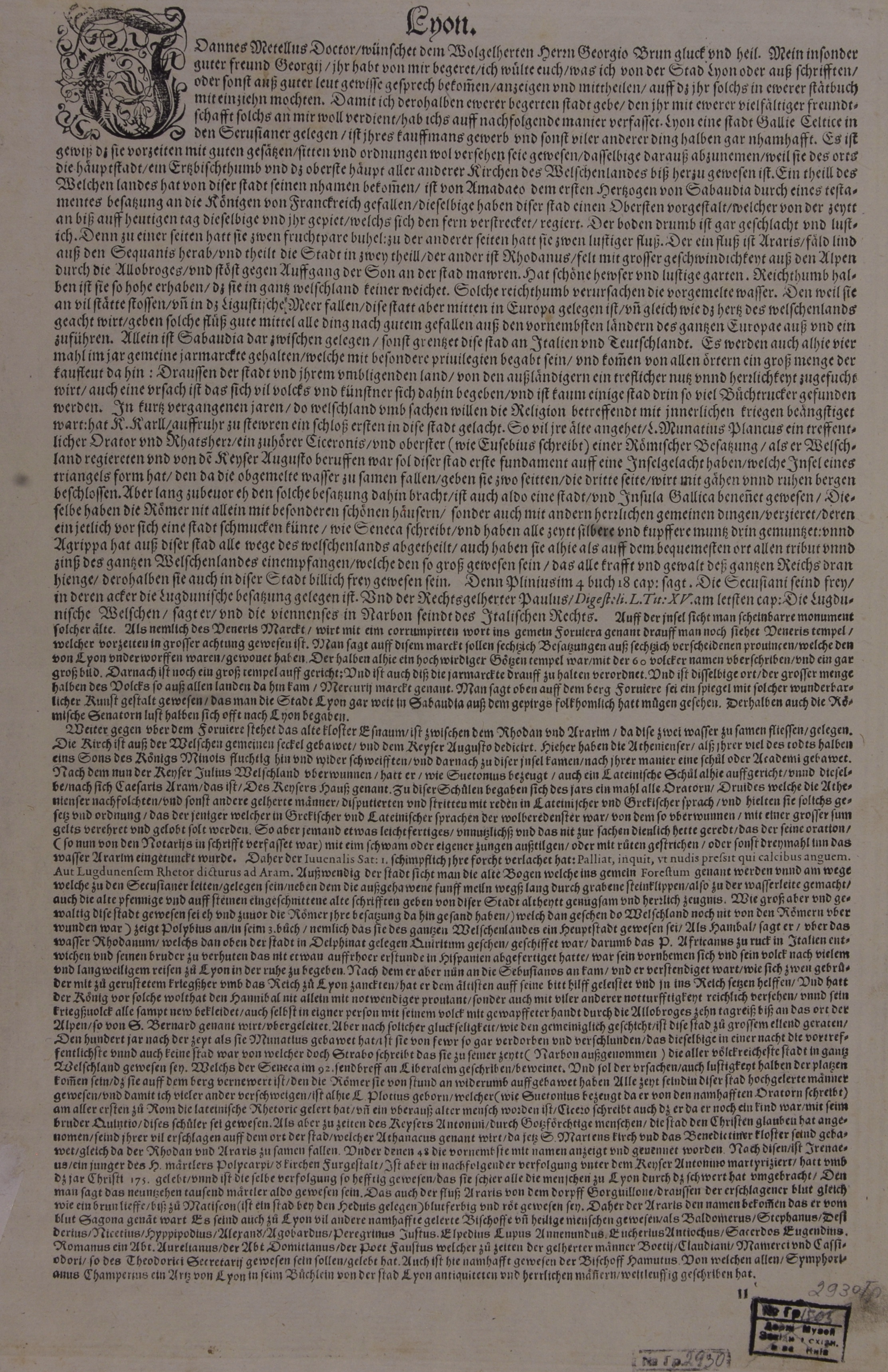 У лівому нижньому куті картуш з текстом латиною: «Scribit Strabo, LVGDVNƱM ſuo tempore fuiße alteram omnium gallia vrbium nobilißimam, et populoſißimam, Narbone eχcepta. Et hodie quidem non in minorem eχcreuit magnitudinĕ, cum tantus ſit moenior ambitus, colles duos & vineta complectens, vt ei paucißima Galliarum urbes anteponi poßint.