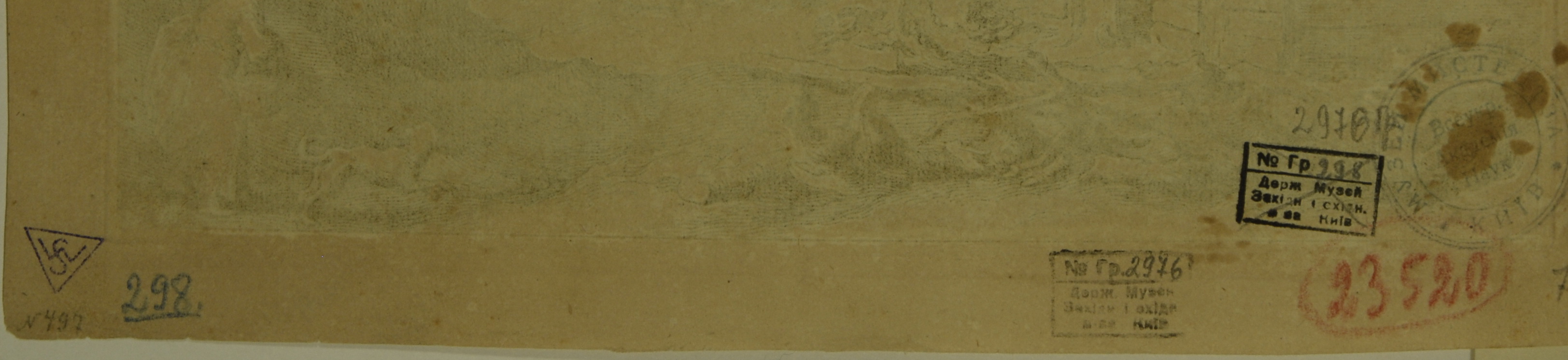 Ліворуч унизу легкі коричневі плями. Зі звороту суцільні жовті плями, пом'ятості. Зі звороту сліди наклеєного паперу.,