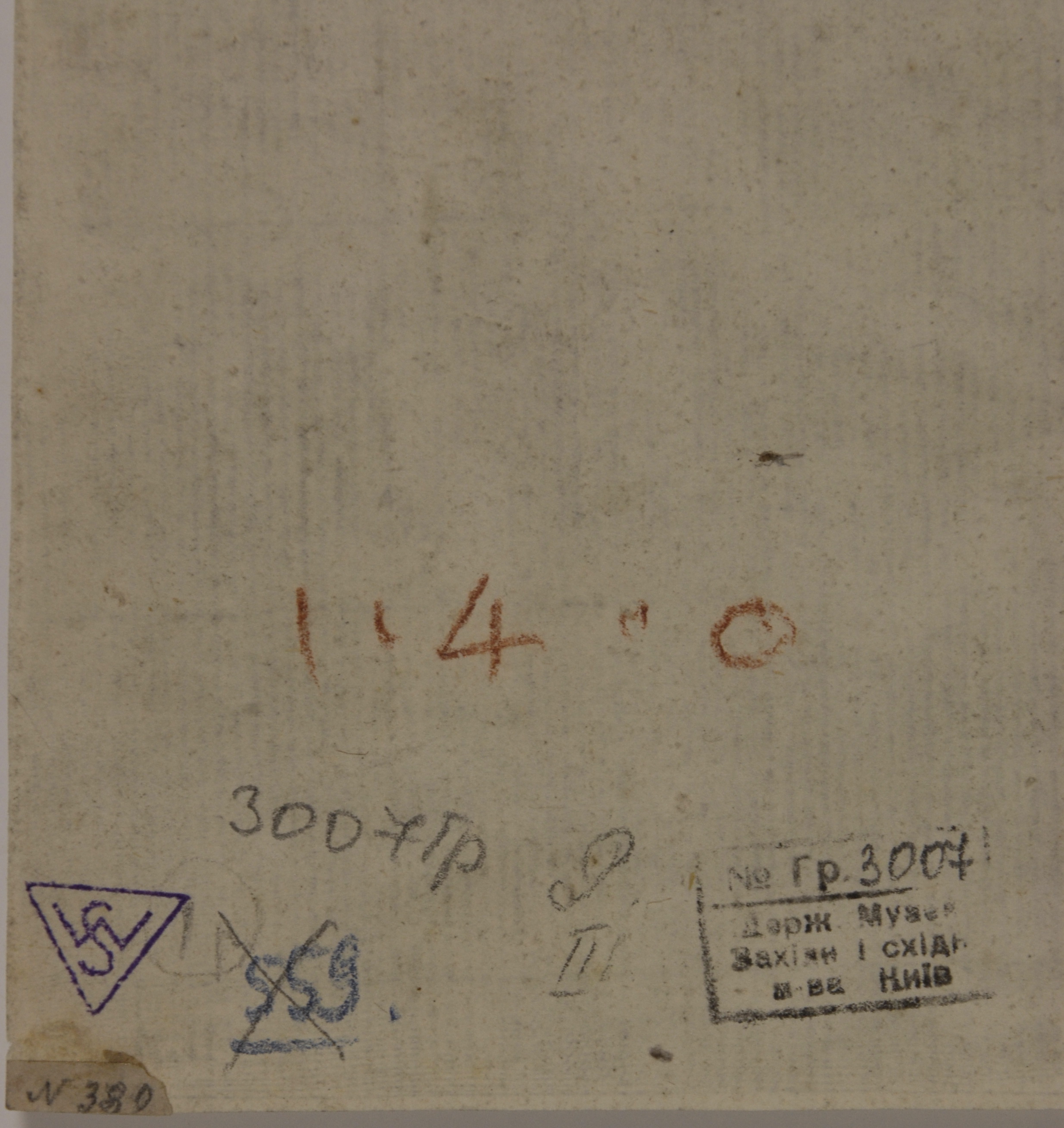 Поля обрізані, по кутах коричневаті плями, в центрі горизонтальний злам, зі звороту вздовж верхнього краю сліди паперових наклейок.,