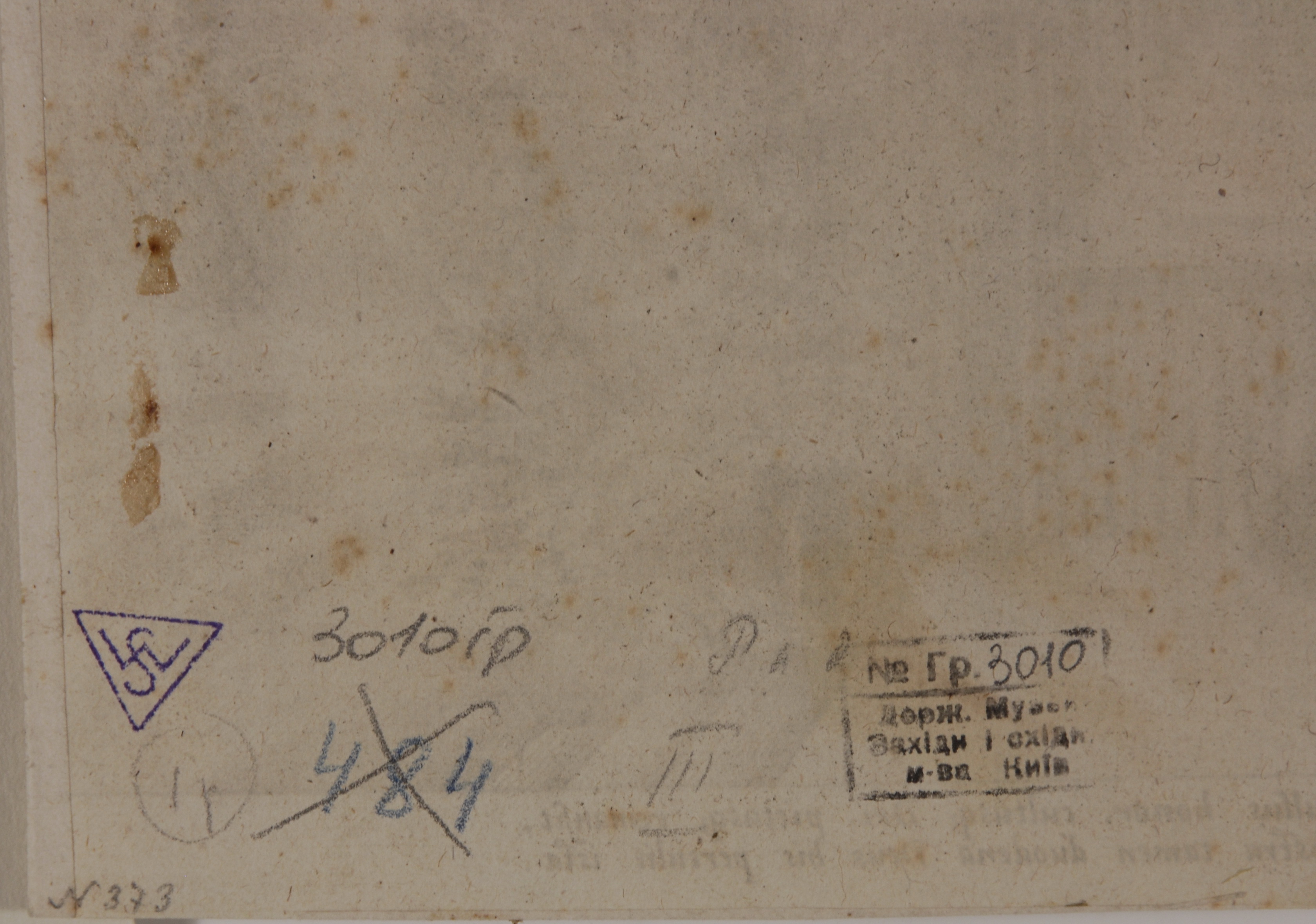 Поля обрізані, в нижній частині великі жовтуваті плями. У верхньому правому куті на зображенні чорна пляма. Ліворуч унизу жовтуваті плями. Зі звороту коричневі плями і плями клею. Вздовж верхнього краю паперові наклейки.,