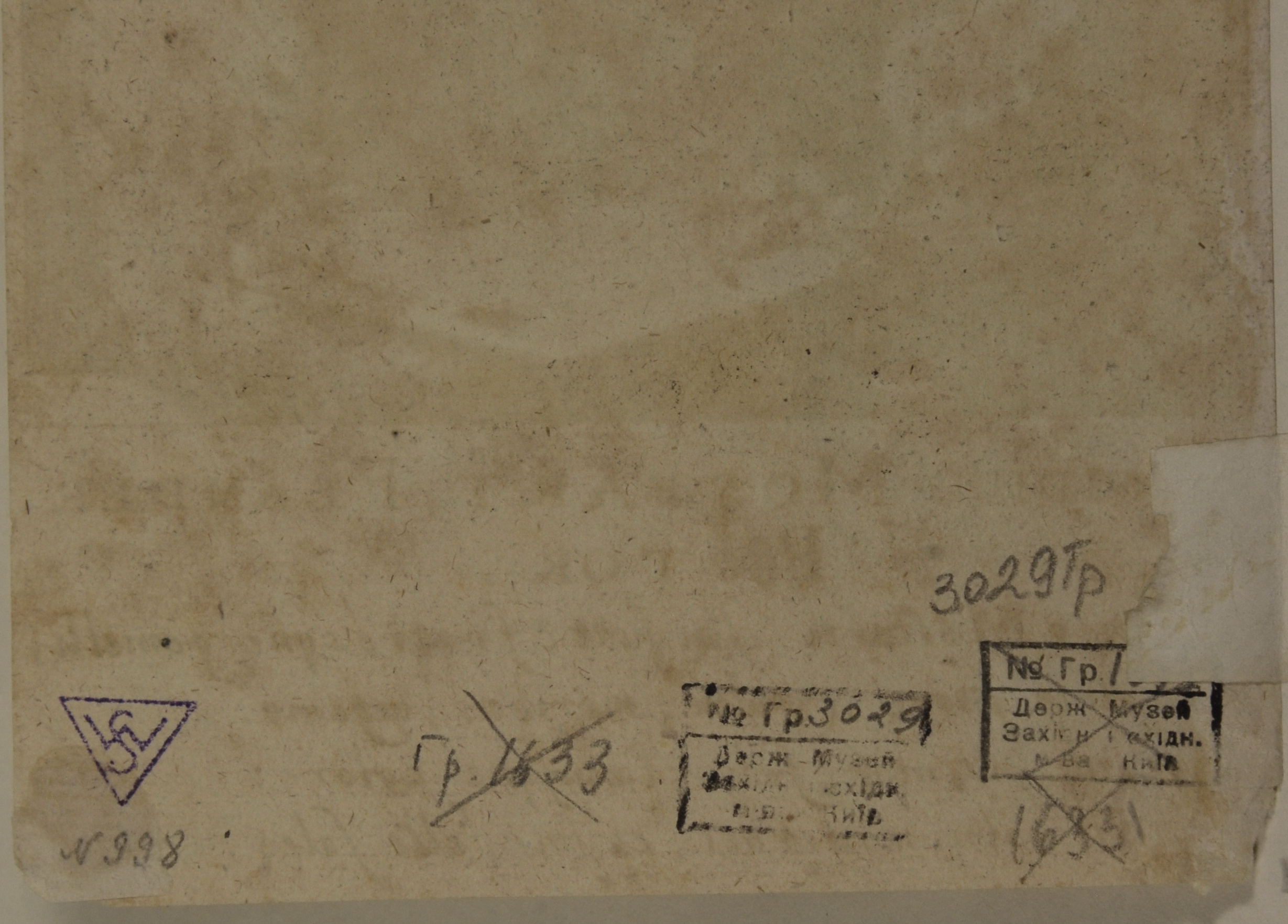 Аркуш обрізаний по фацету, в лівому верхньому куті пом'ятий. Повсюдне пожовтіння, по краях сліди наклеєного паперу і клею. В лівому верхньому і нижньому кутах - втрати. В правому нижньому куті - реставраційна заправка.,