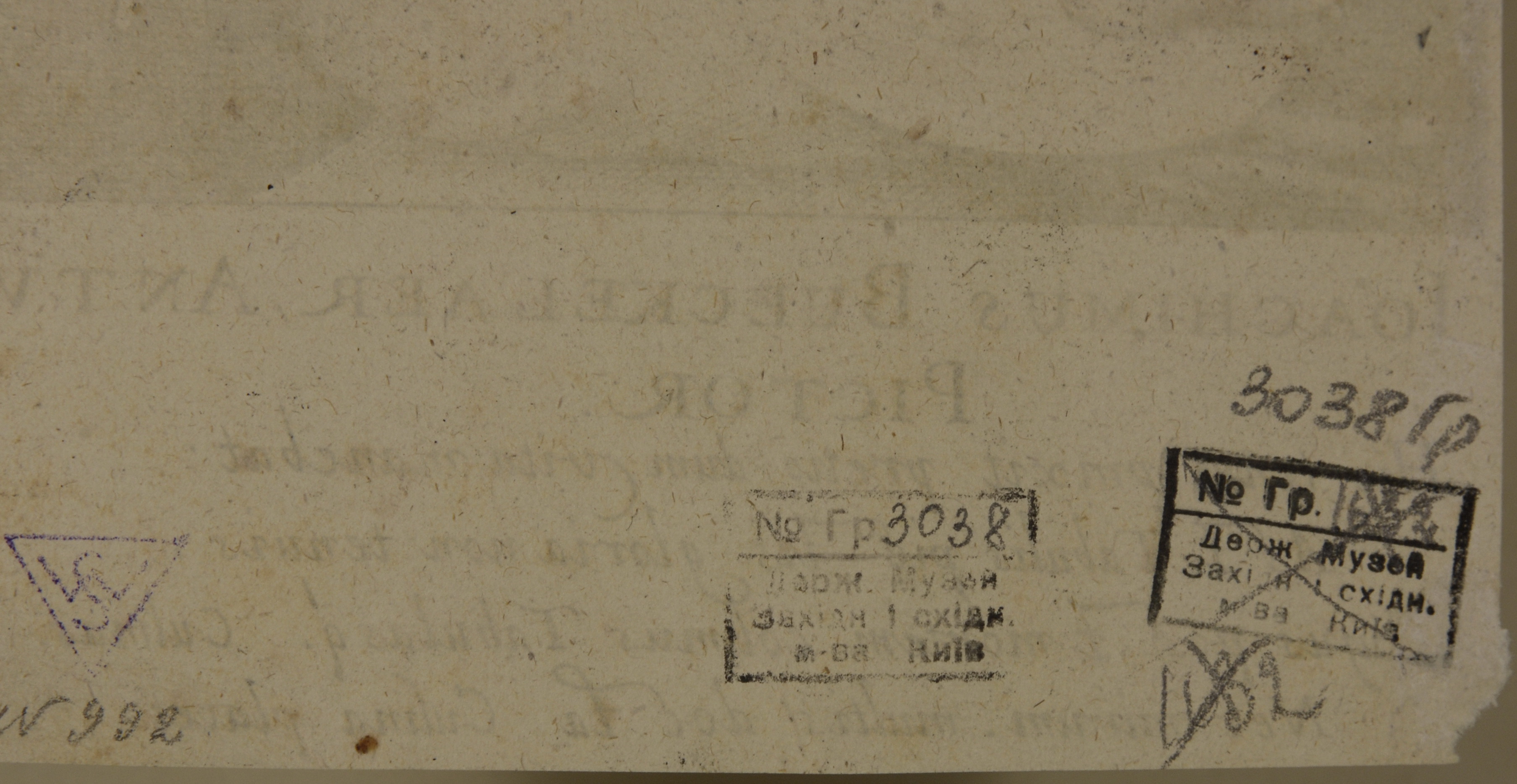 Поля відсутні, унизу по кутах незначні втрати. Зі звороту вгорі паперові наклейки, ліворуч невелика втрата.,