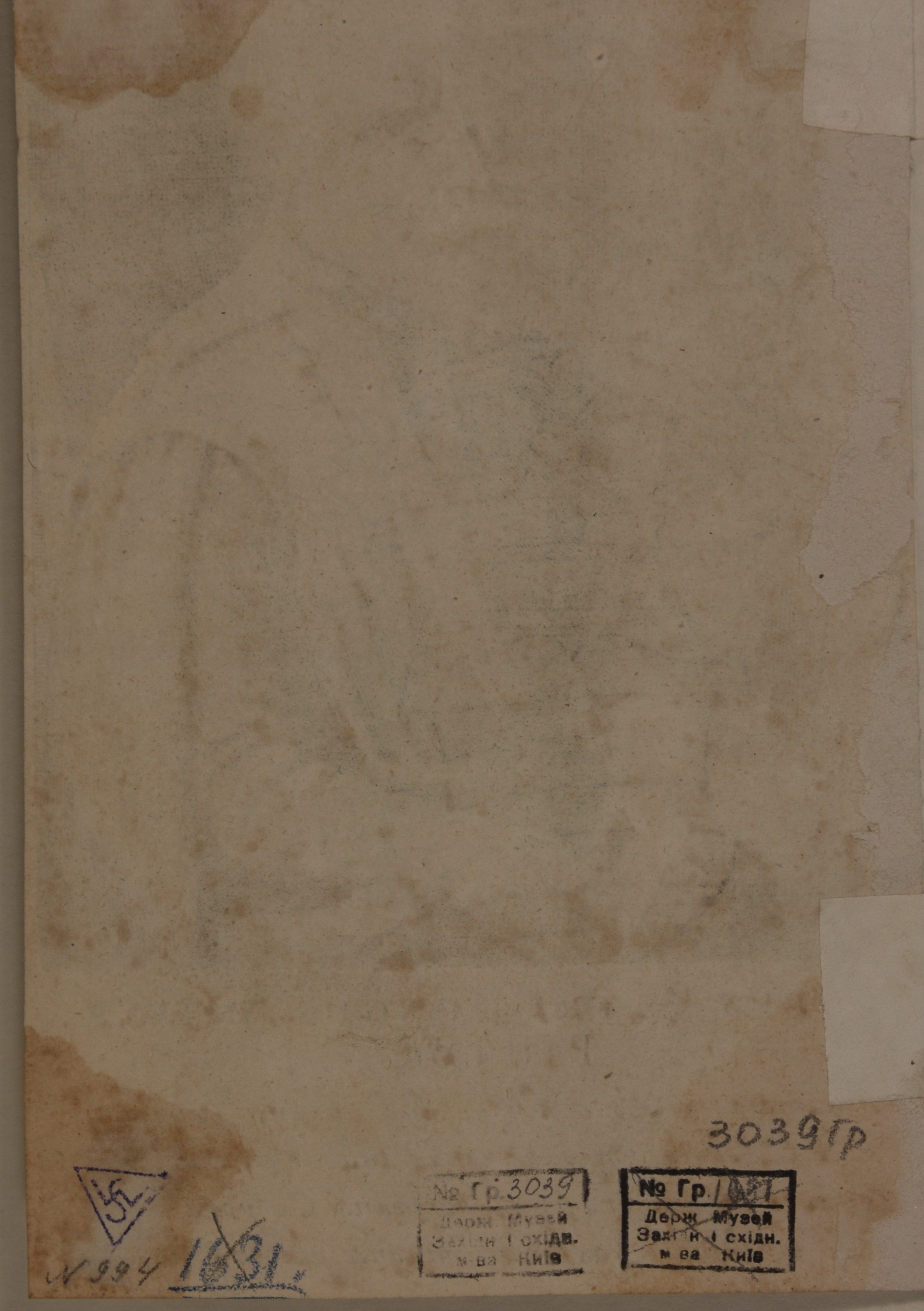 Поля відсутні, численні плями, по кутах затікання. На звороті вгорі і вздовж правого краю сліди наклеєного паперу, короблення, легке забруднення.,