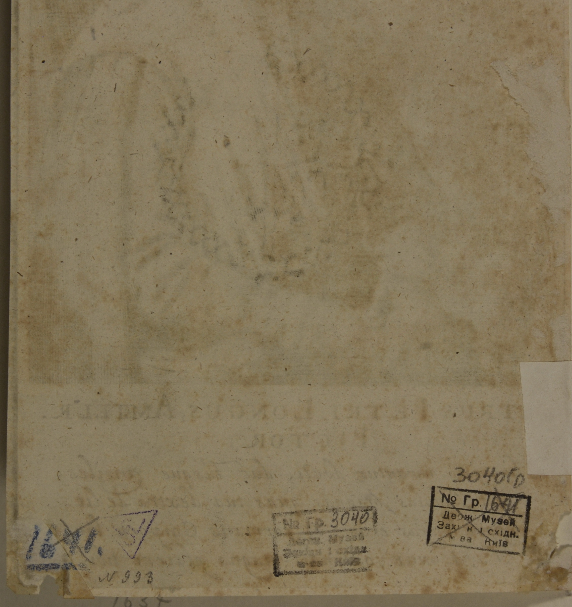 Поля відсутні, повсюдно бурі плями. Зі звороту по кутах сліди клею і паперові наклейки.,
