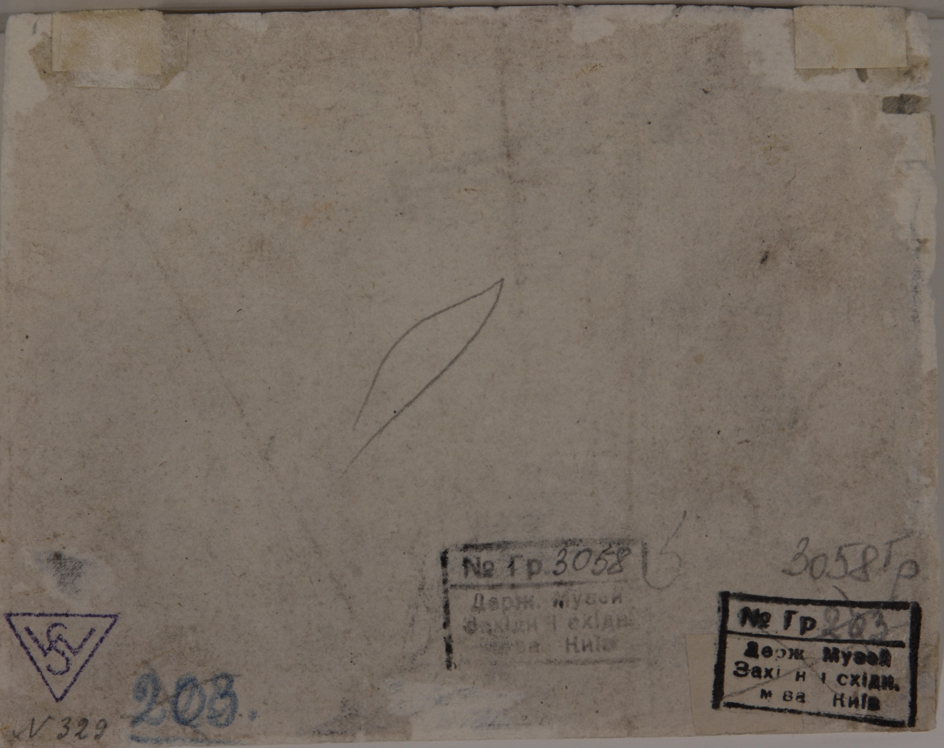 Поля обрізані, короблення, в правому верхньому куті слід зламу, по верхньому краю дрібні надриви, в центрі вгорі надрив; надриви по лівому краю, нижче центру прорив і потертість, загальна потертість, забруднення; угорі зі звороту сліди наклеєного паперу.,