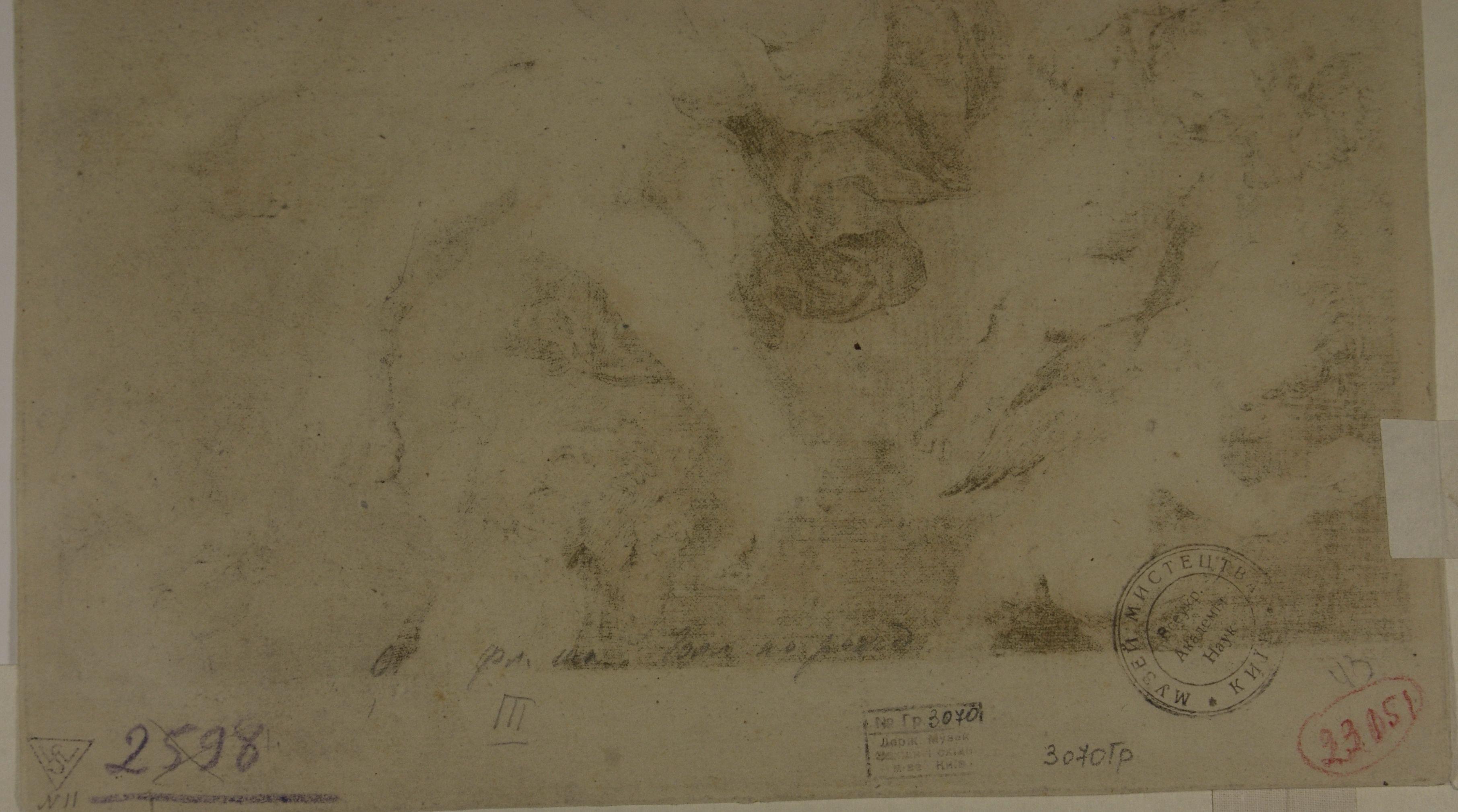 Аркуш обрізаний по фацету, праворуч унизу невеликий злам. Зі звороту угорі три паперові наклейки.,