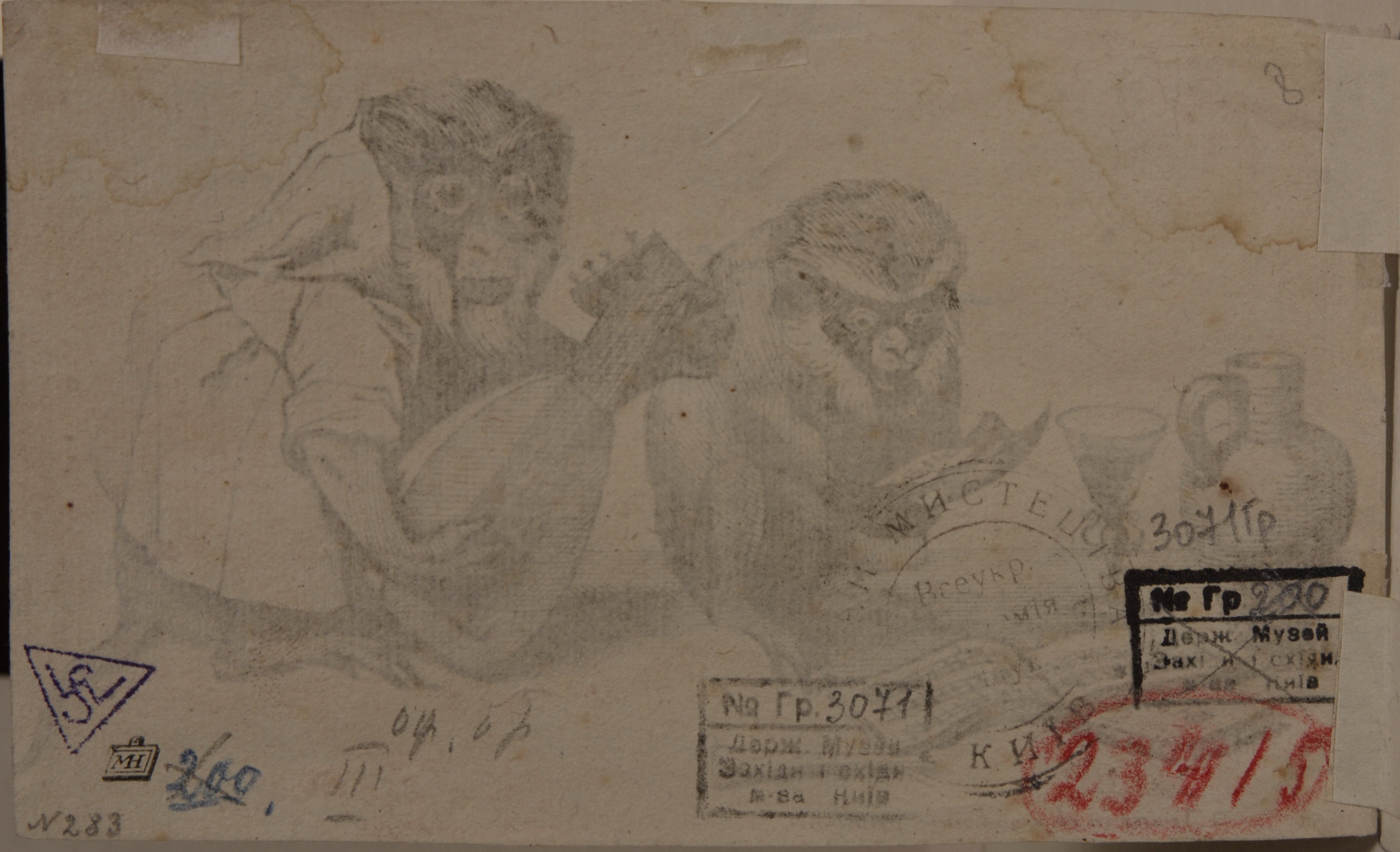 Аркуш обрізаний по фацету, пом'ятості. В лівому і в правому верхніх кутах - два великі затікання; точкові рудуваті плями, пожовтіння. Зі звороту угорі сліди клею і наклеєного паперу.,