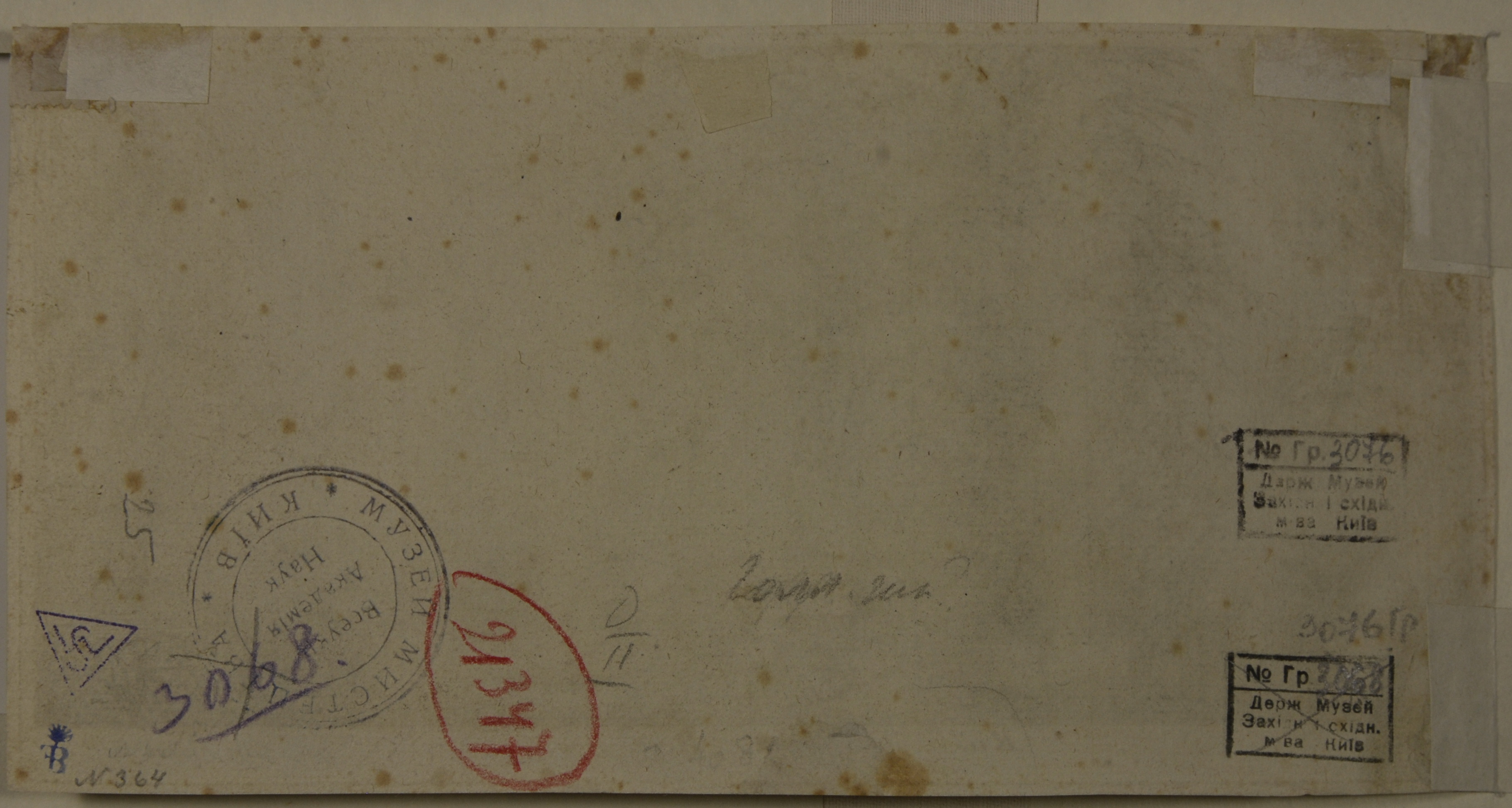 Аркуш обрізаний, повсюдно великі і дрібні рудуваті плями. На звороті по краях паперові наклейки, сліди клею і наклеєного паперу.,