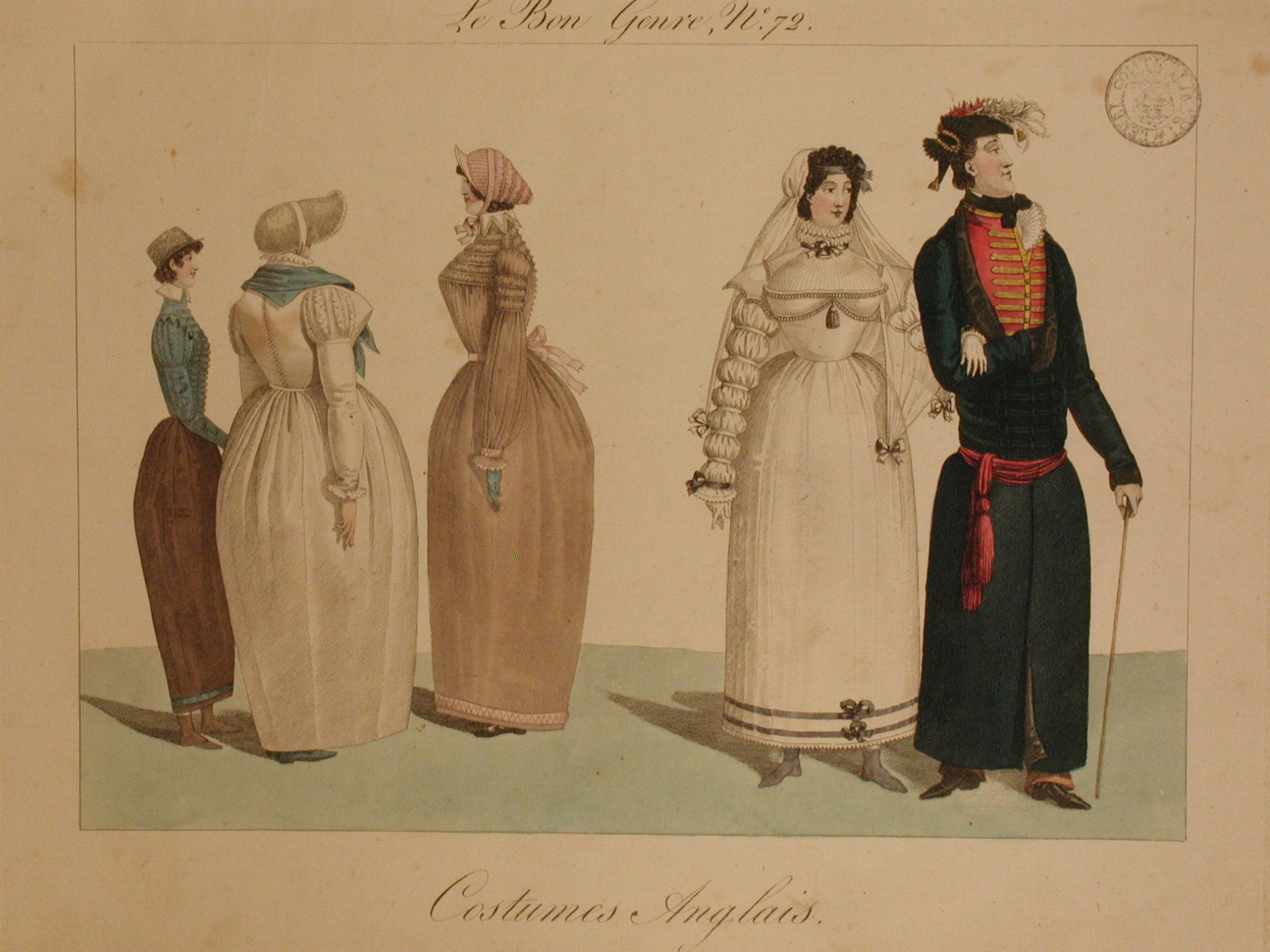 Информацiя об оригiнале: Над зображенням напис: "Le Bon Genre, №72" (Хороший стиль "№ 72). Під зображенням назва французькою мовою: "Costumes Anglais"./Аналогіi: 1. Інший відбиток: British museum. «Costumes Anglais», 1814. Registration number: 1900,0319.6, AN 101036001/Кількість: 1/Старі документи прийому: Акт № 1 від 05.01. 1952/Опис: Карикатурне зображення англійських модних костюмів. Ліворуч три дами, які розмовляють, вбрані в сукні із завуженими донизу штянями. Праворуч - зоборажені під руку дама у весільній сукні та фаті і кавалер в синьому шлафроці./ншi написи, штампи, печатки, етикетки, наклейки: Печатка: угорі праворуч круглий відбиток чорним.