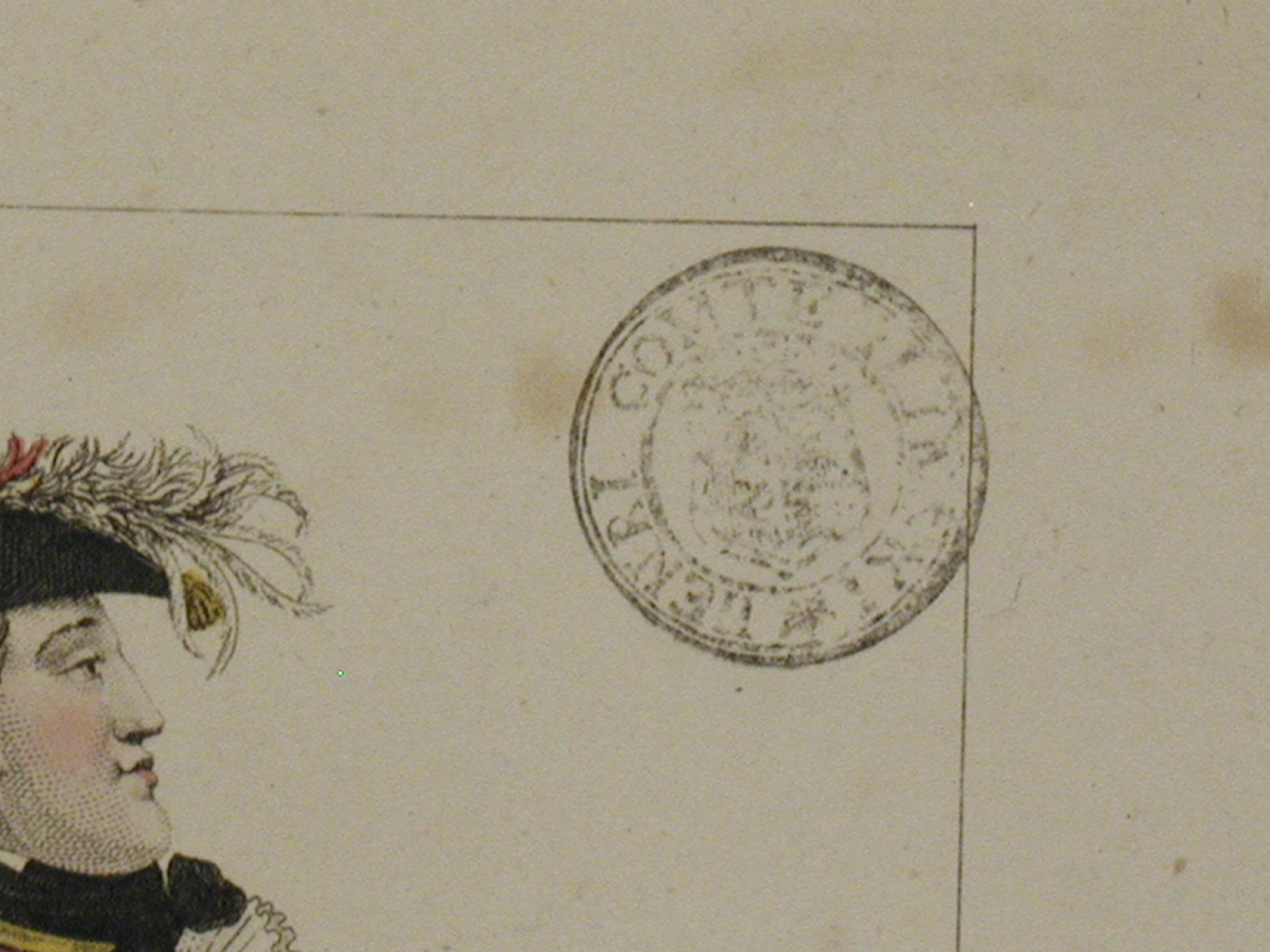 Закладка “Атрибуція” - Змiн. назва: Англійські костюми./Наим. предмета, издания: гравюра/Змiн.розміри листа: 266х341/Змiн.додаток до назва (лист, ...): Серія "Гарний стиль", аркуш № 72/Змiн. авторські пiдписи i написи: Над зображенням назва серії та номер аркуша: «Le Bon Genre, №72» («Гарний стиль, №72»); під зображенням – назва: «Costumes Anglais» («Англійські костюми»)./Змiн.опис: Праворуч – офіцер у довгому пальто, який іде, спираючись на палицю, під руку із дамою; ліворуч на другому плані – група з трьох дам в незграбних сукнях та капелюшках./Змiн. Iншi написи, штампи, печатки, етикетки, наклейки: у правому верхньому куті кругла чорна печатка «HENRІ COMTE ILINSKI»./Змiн. час створення: 1814.Изм. предметный классификатор: гравюрамісце створення, школа: ФранціяНовый материал: папірИзм. техника: офортИзм. техника: розфарбований від рукиИзм. комплект(ИЗО): Le Bon Genre. 1800 – 1822