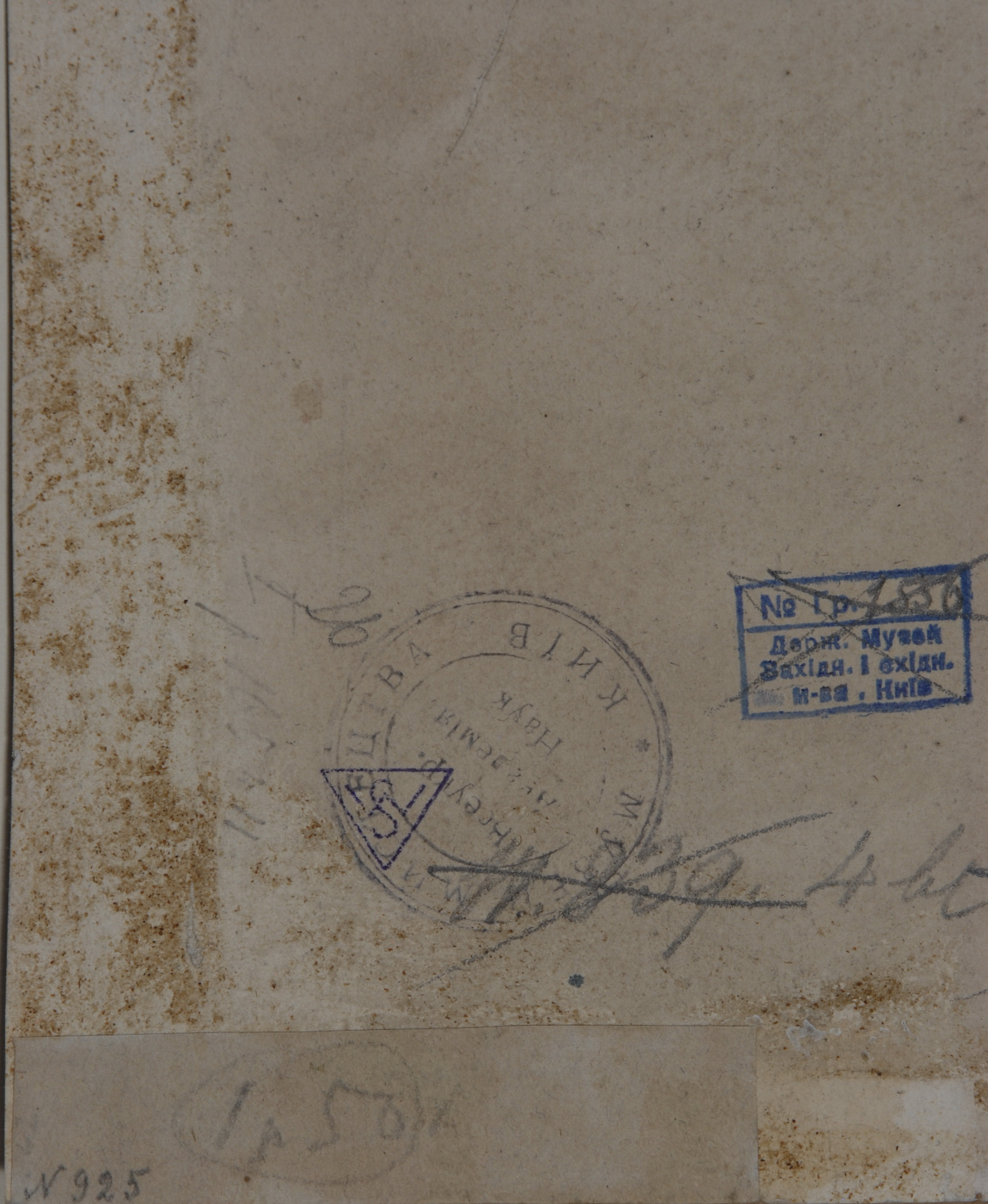 Аркуш обрізаний, плями, унизу праворуч - підклеєна втрата. На звороті сліди клею.,