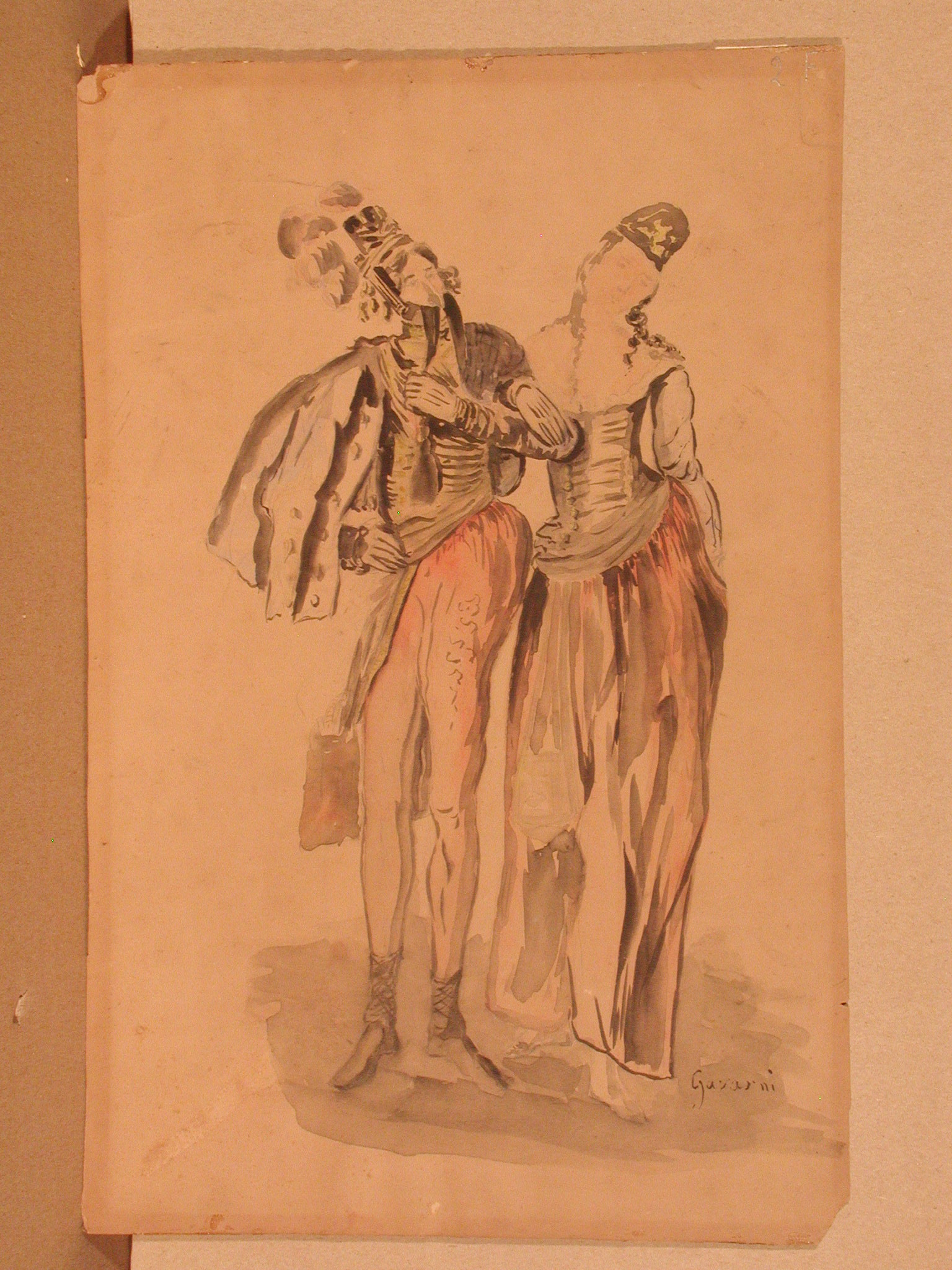 Закладка “Атрибуція” - Змiн. авторські пiдписи i написи: Унизу праворуч підпис Gavarni./Змiн.опис: В центрі трохи витягнуті фігури чоловіка та жінки. Чоловік у військовій формі, головному уборі з плюмажем; на його правому боці прикріплена до поясу сумка. Права рука вперта в бік, лівою тримає кінчик великого вуса. Праворуч дама, яка стоїть, відставивши назад праву ногу, схиливши до правого плеча голову, спираючись на руку кавалера; вона в сильно декольтованій сукні із довгою спіницею, невеличкому капелюшку, з довгим волоссям, що кучерями лежить на її плечах./Змiн. Iншi написи, штампи, печатки, етикетки, наклейки: На звороті хімічним олівцем 2480, тушшю 4579, наклейка з № 6098 і № Київського державного музею російського мистецтва - 381.