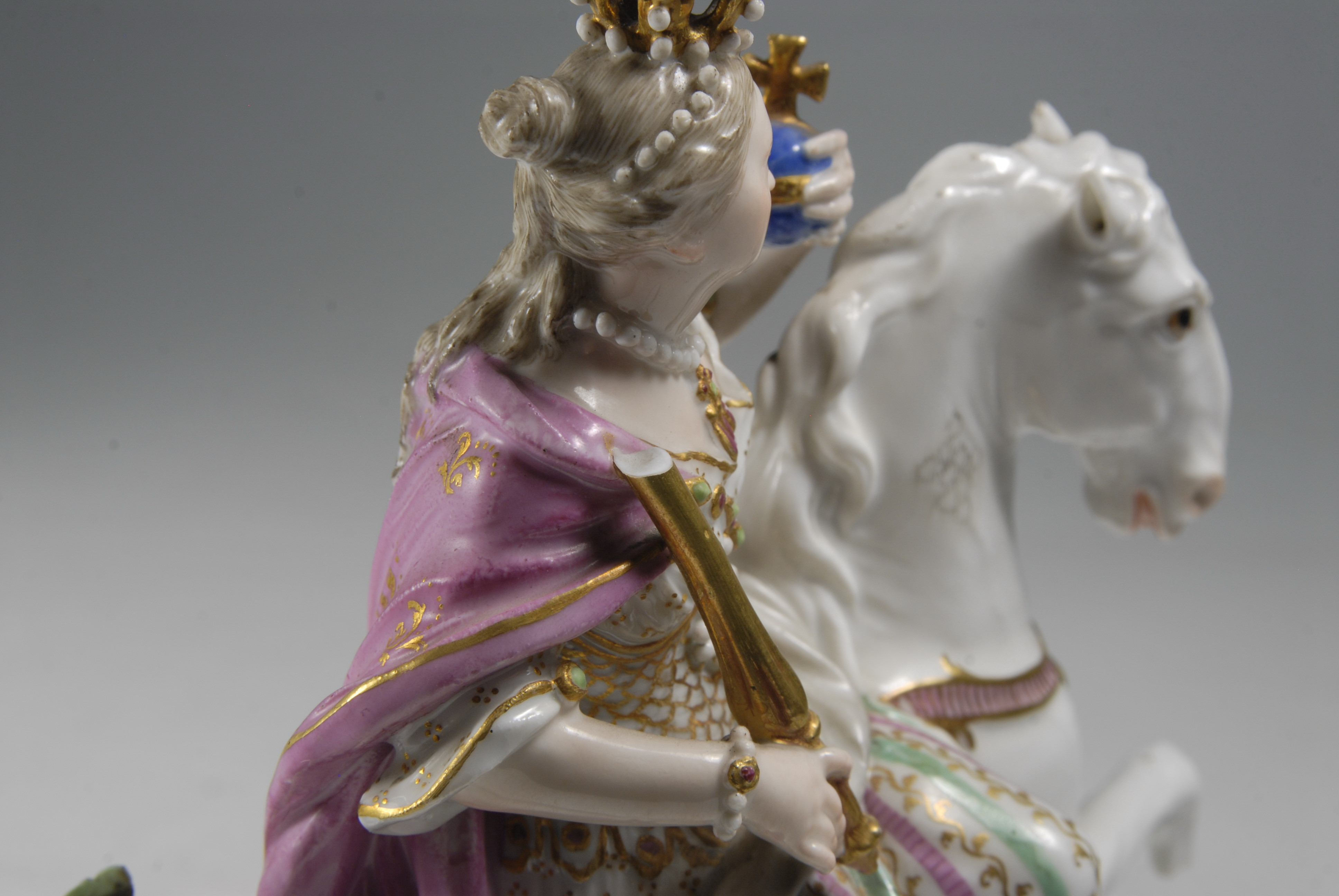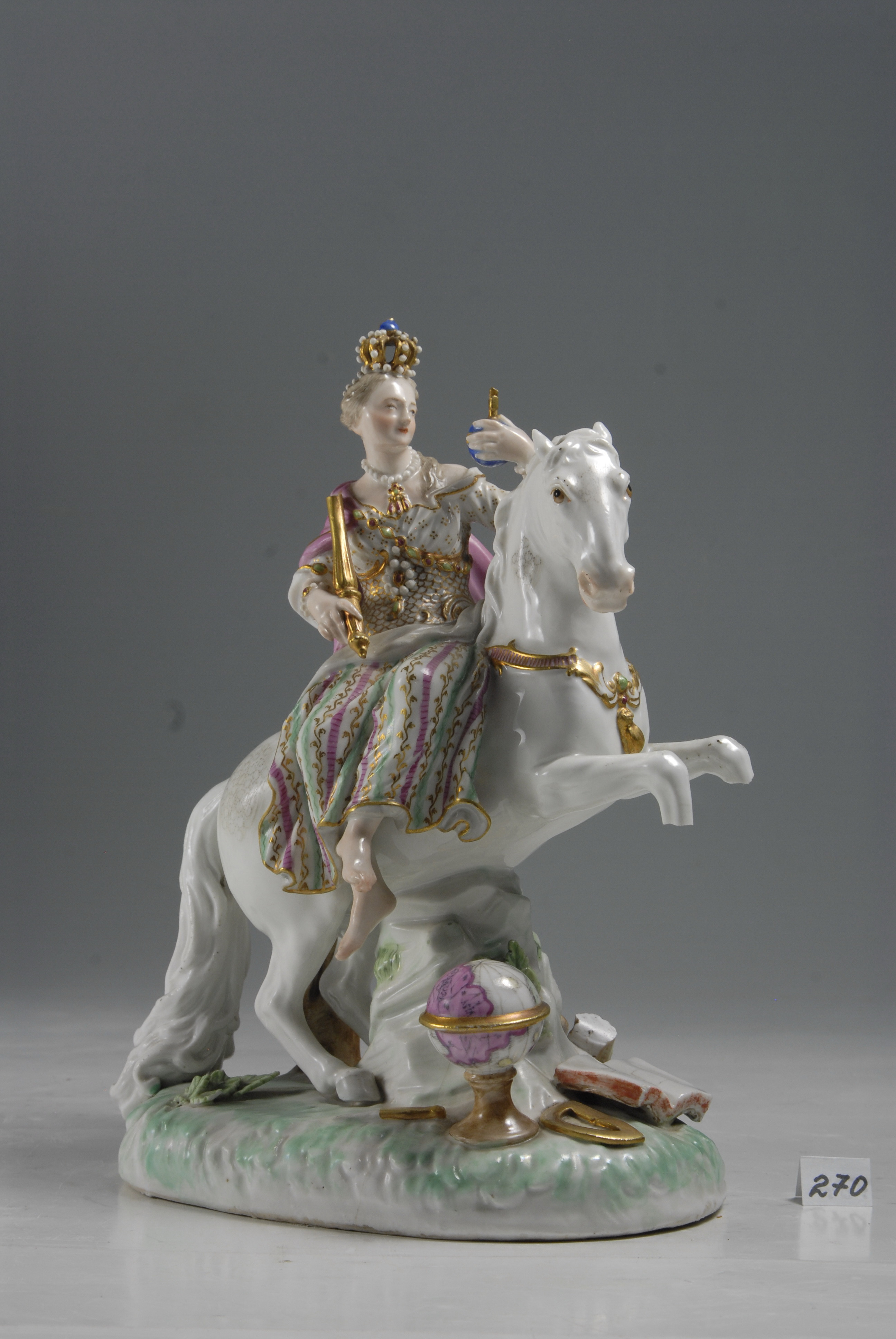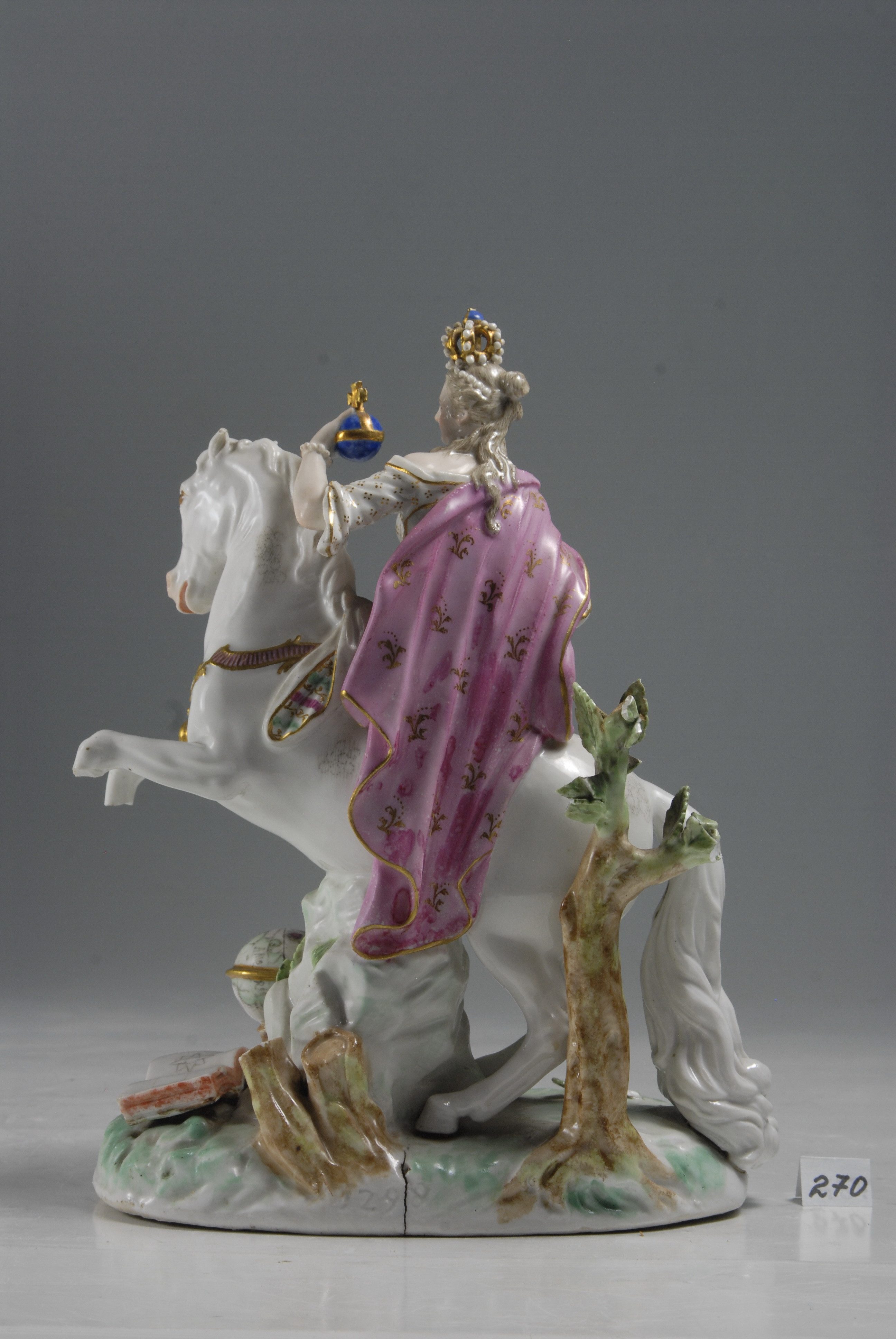 Закладка “Атрибуція” - Наим. предмета, издания: Європа/Змiн. Написи, клейма, марки: Марка синя підглазурна: перехрещені мечі з крапкою./Змiн.опис: Молода жінка в короні, зі скіпетром та державою в руках, на білому в коричневі яблука коні, який скаче. На ній рожевий плащ, розписаний золотими гілочками, підхоплений ланцюгом з кольорового каміння, золотий лускоподібний панцир, біле плаття з золотими крапками та смугаста нижня спідниця. Підніжжя з ліпним листям; на ньому - глобус, розкрита книга та кутомірний інструмент./Змiн. час створення: 1763 - 1774місце створення, школа: Німеччина