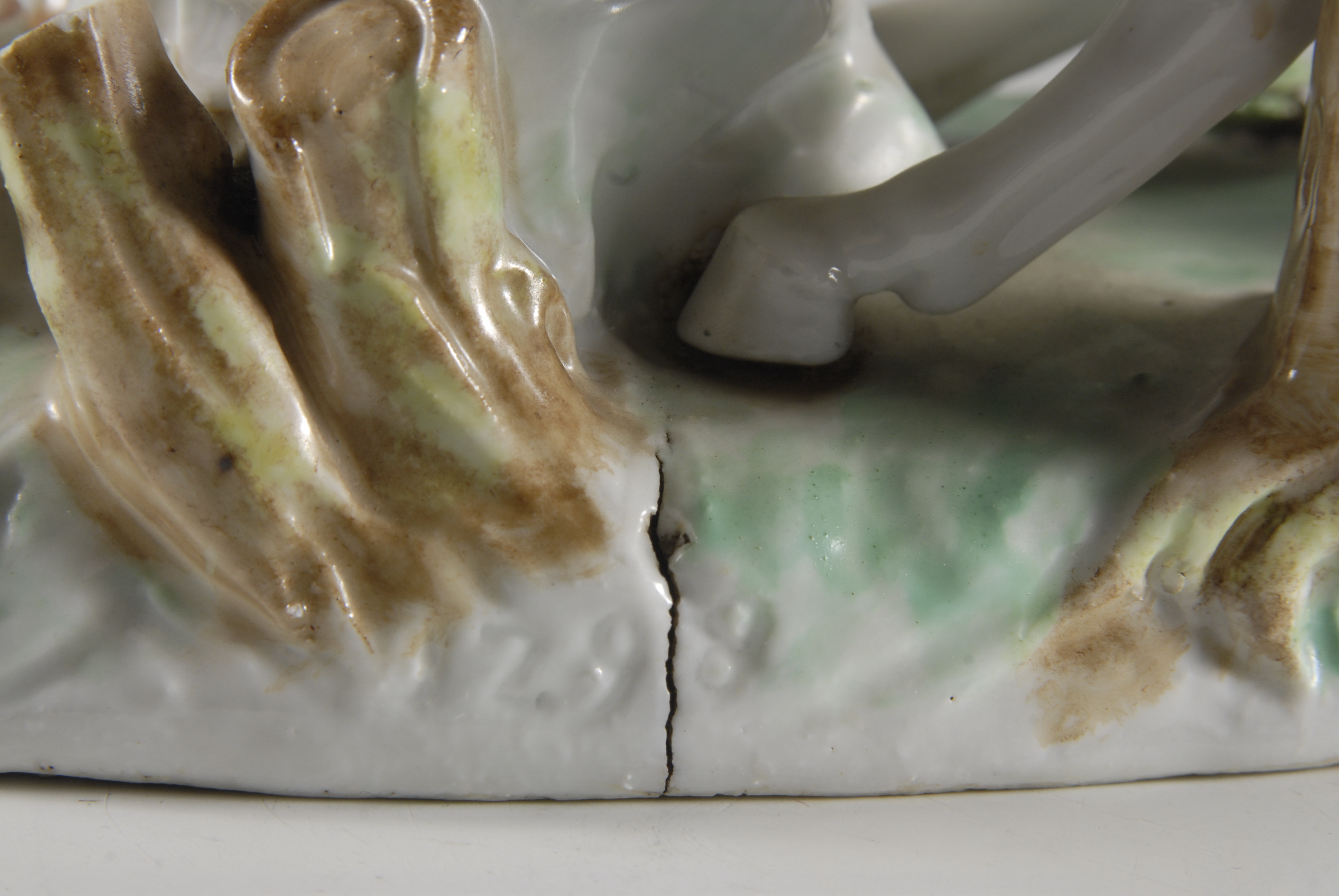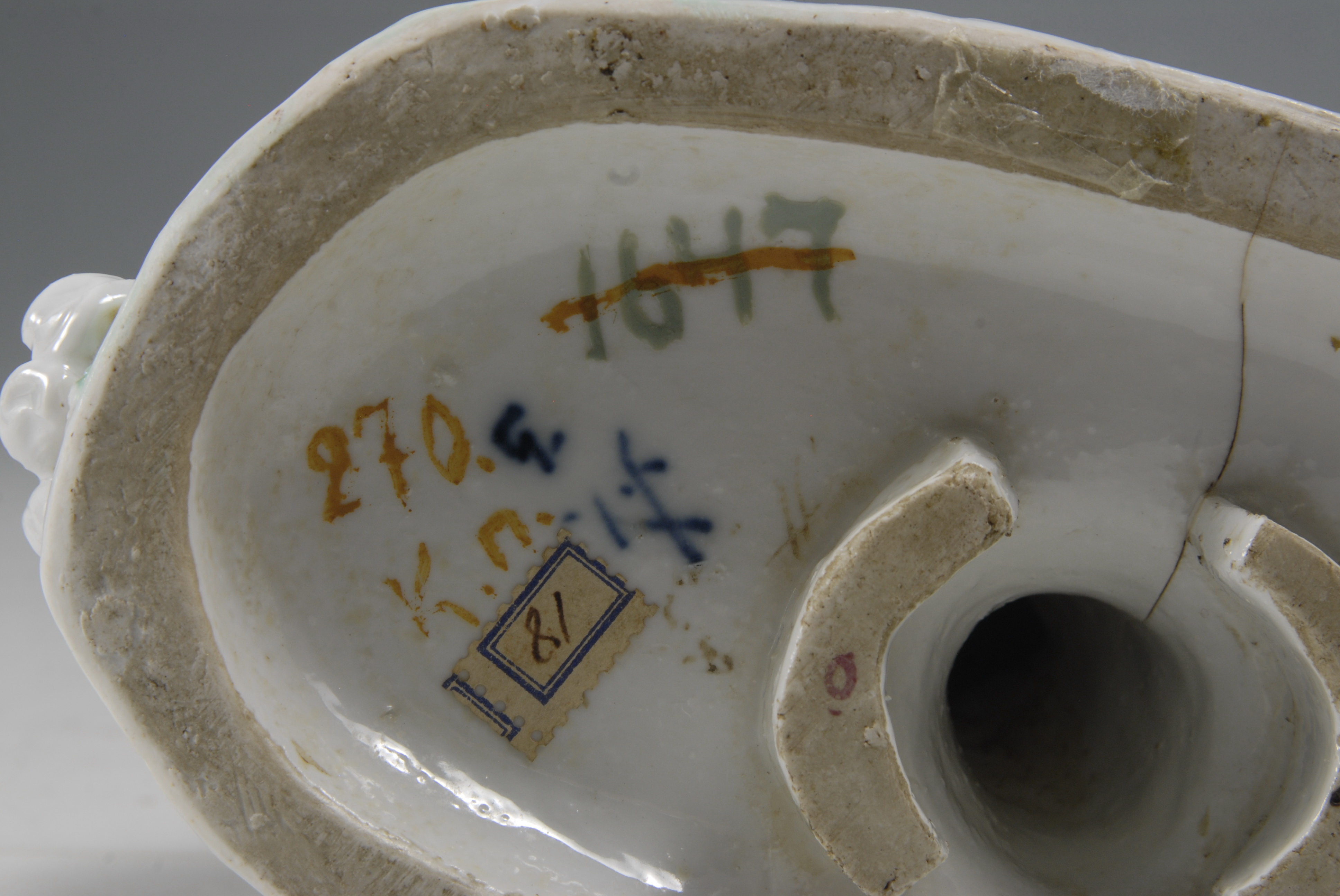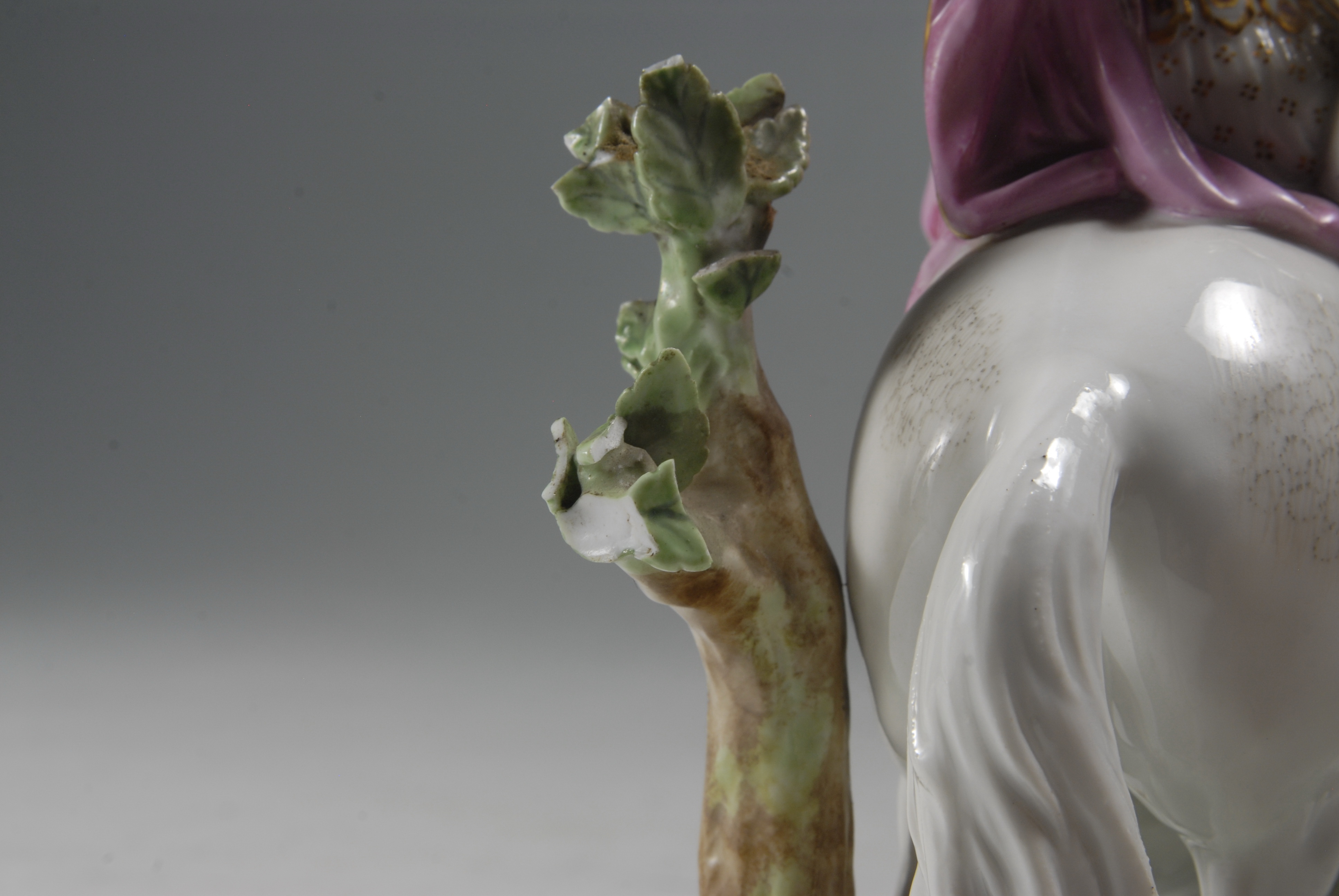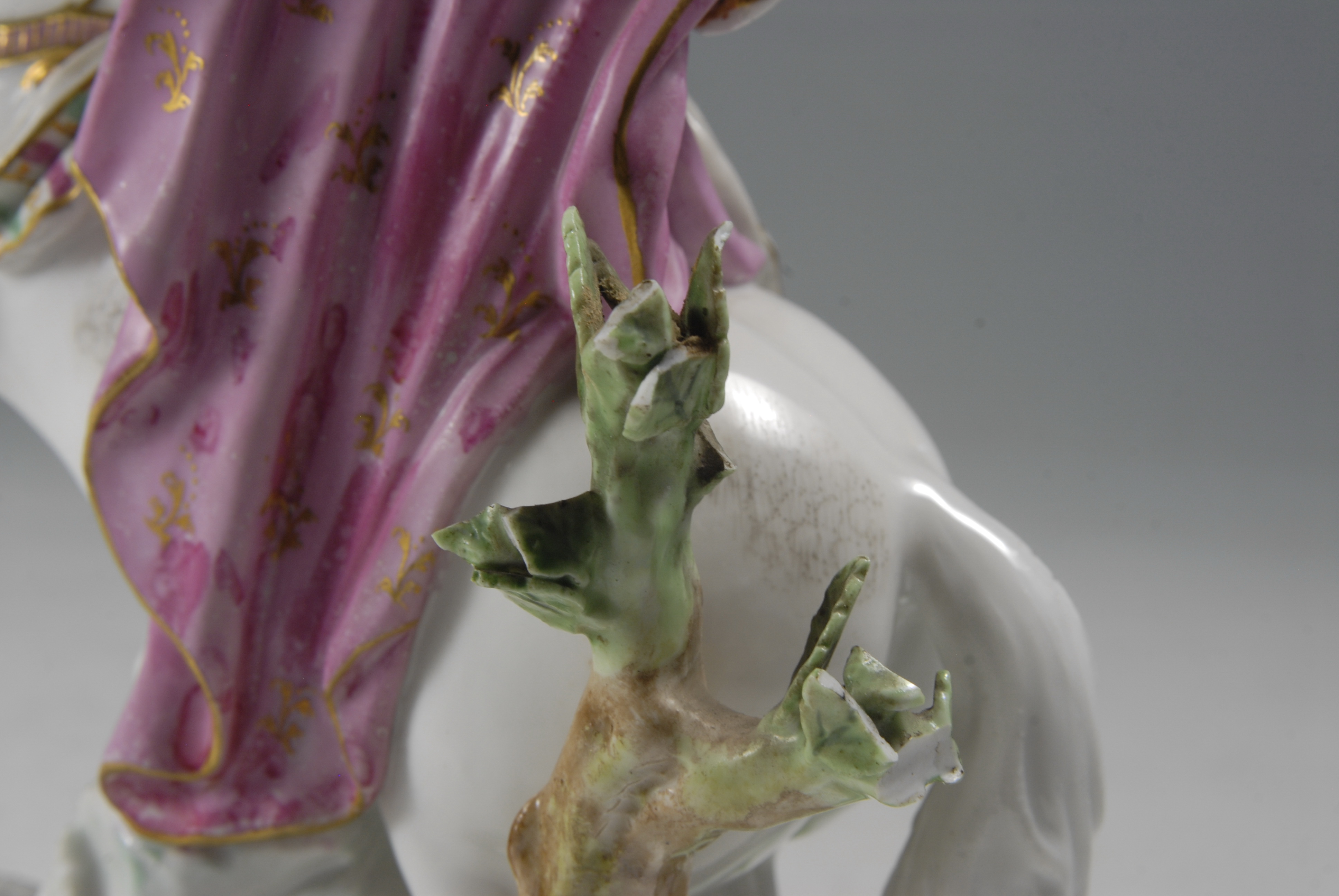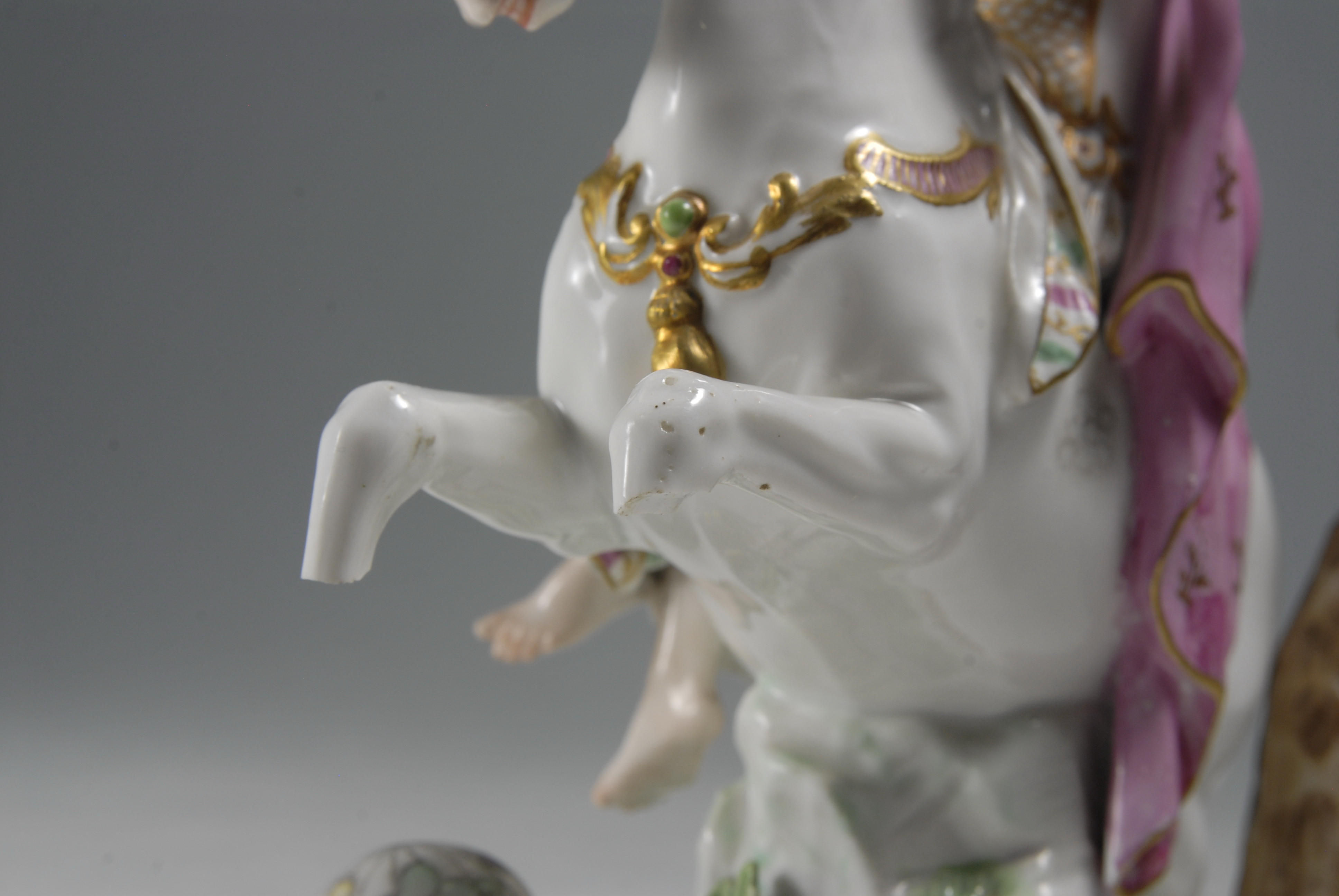 Комм.: Група з серії "Чотири частини світу". Ця серія була виконана І.Ф. Еберлейном (Iohann Friedrich Eberlein, 1696 - 1749), І.І. Кендлером (Iohann Ioachim Kaendler, 1706 - 1775) та П. Рейніке (Peter Reinicke, 1715 - 1768) у 1744 - 1746 рр. Серія існувала в двох варіантах: великого (висота 26 - 32) та малого розміру (висота близько 20), які дещо відрізнялись одна від одної. Ця серія повторювалась на мануфактурі в продовж багатьох років. Детальну інформацію про цю серію наводить К. Бутлер у каталозі мейсенської порцелянової пластики з ермітажної збірки./Історія Атрибуціi: Консультація Соловєйчік Р.С. (Ермітаж, 1961 р.) - Мейсен, 1763 - 74 рр. (Європа. Академічний період)/Кількість: 1/Модель, форма: модель І.І. Кендлера 1745 - 1746 рр., форма № 1298