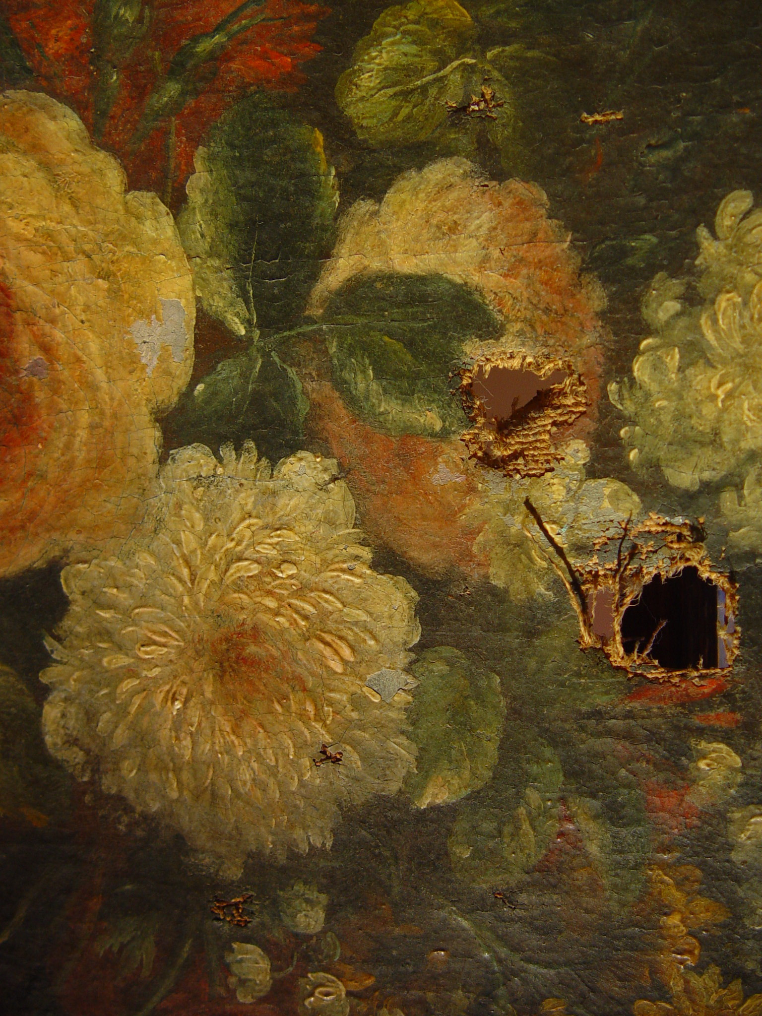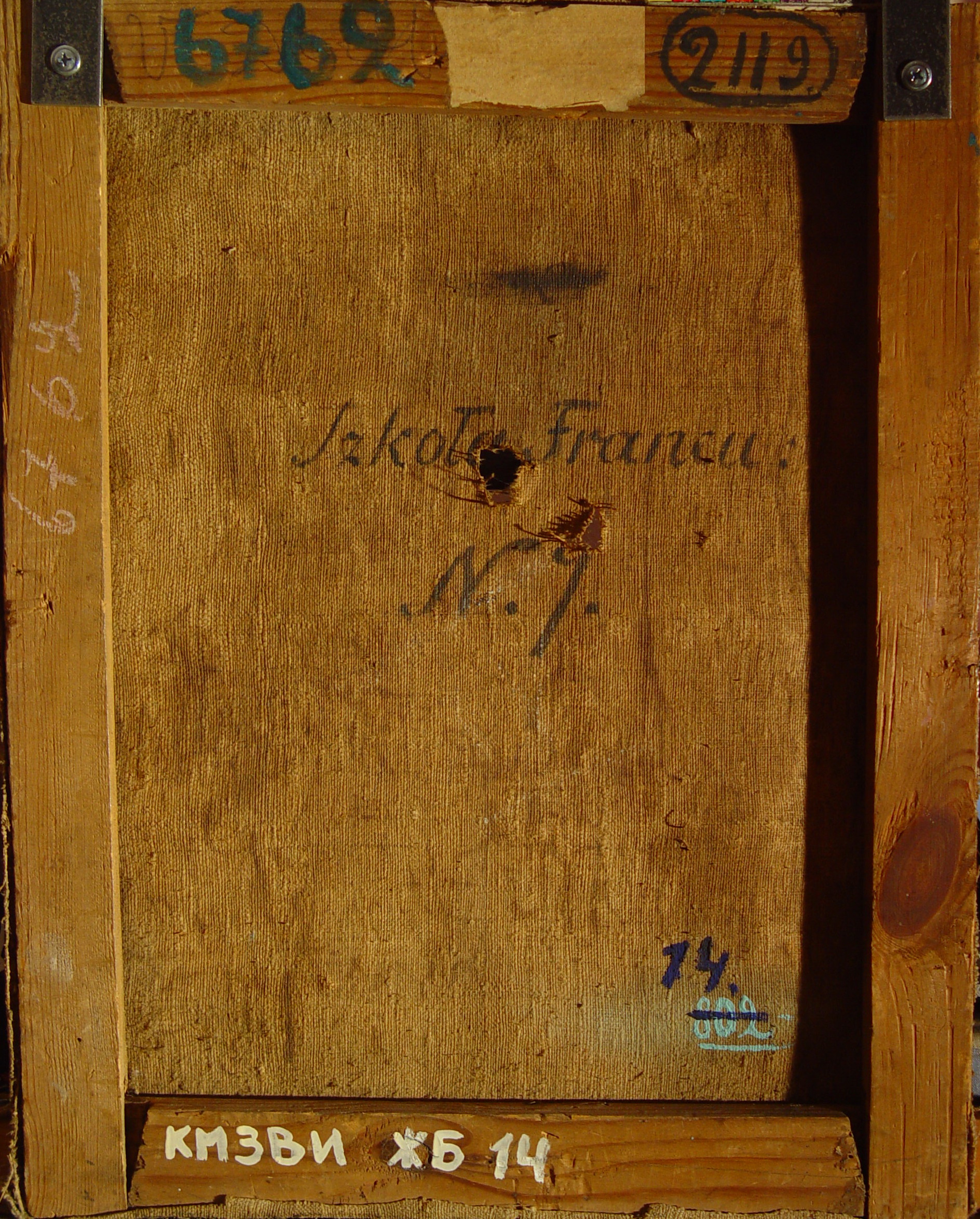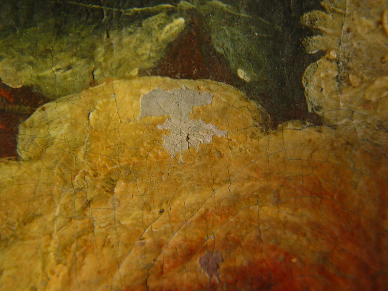 Інвентар 1948 р.: У центрі дві пробоїни, помутніння та забруднення лаку.,