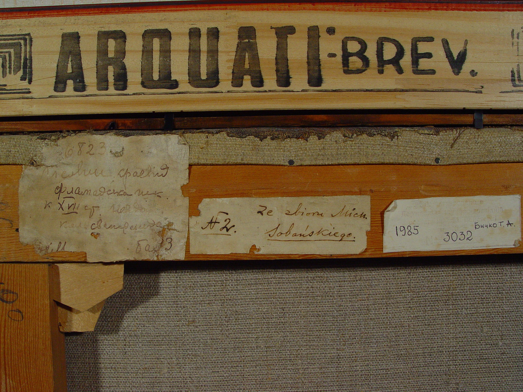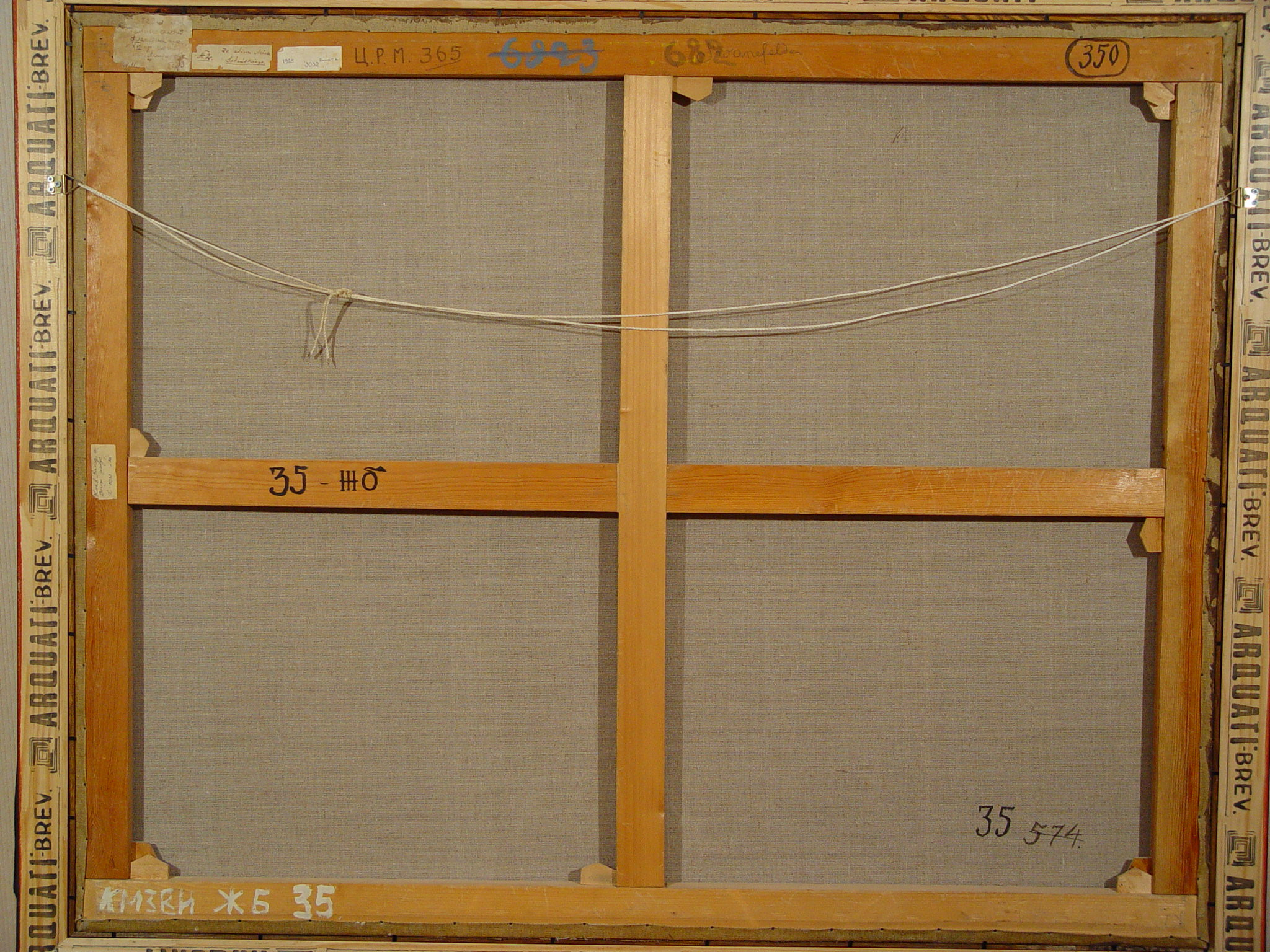 Інвентар 1948р.: на всю поверхню картини наклеєно закріплювальну наклейку.,