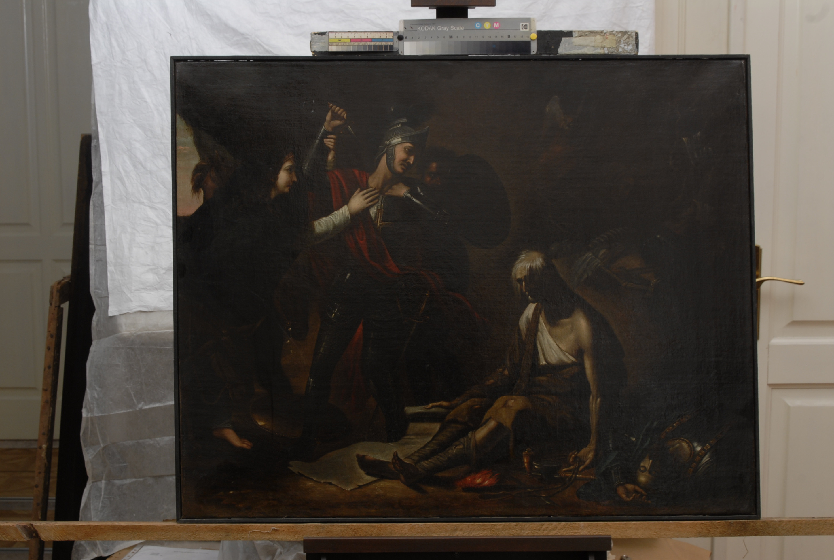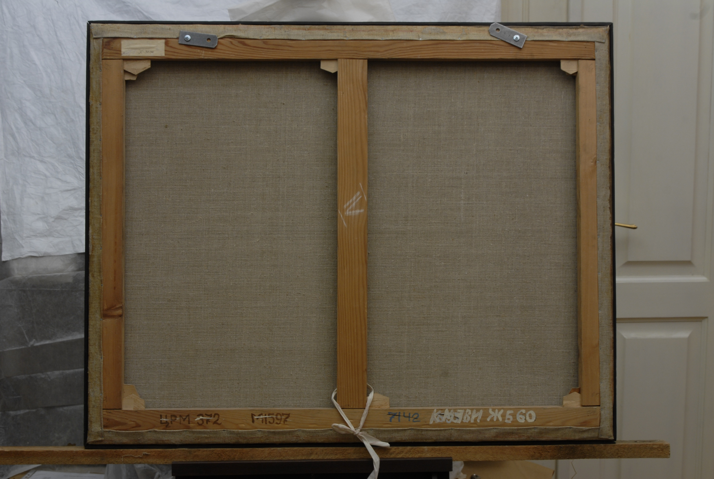 Інвентар 1948р.: кракелюри, втрати фарбового шару, закріплювальна наклейка на всій картині.,