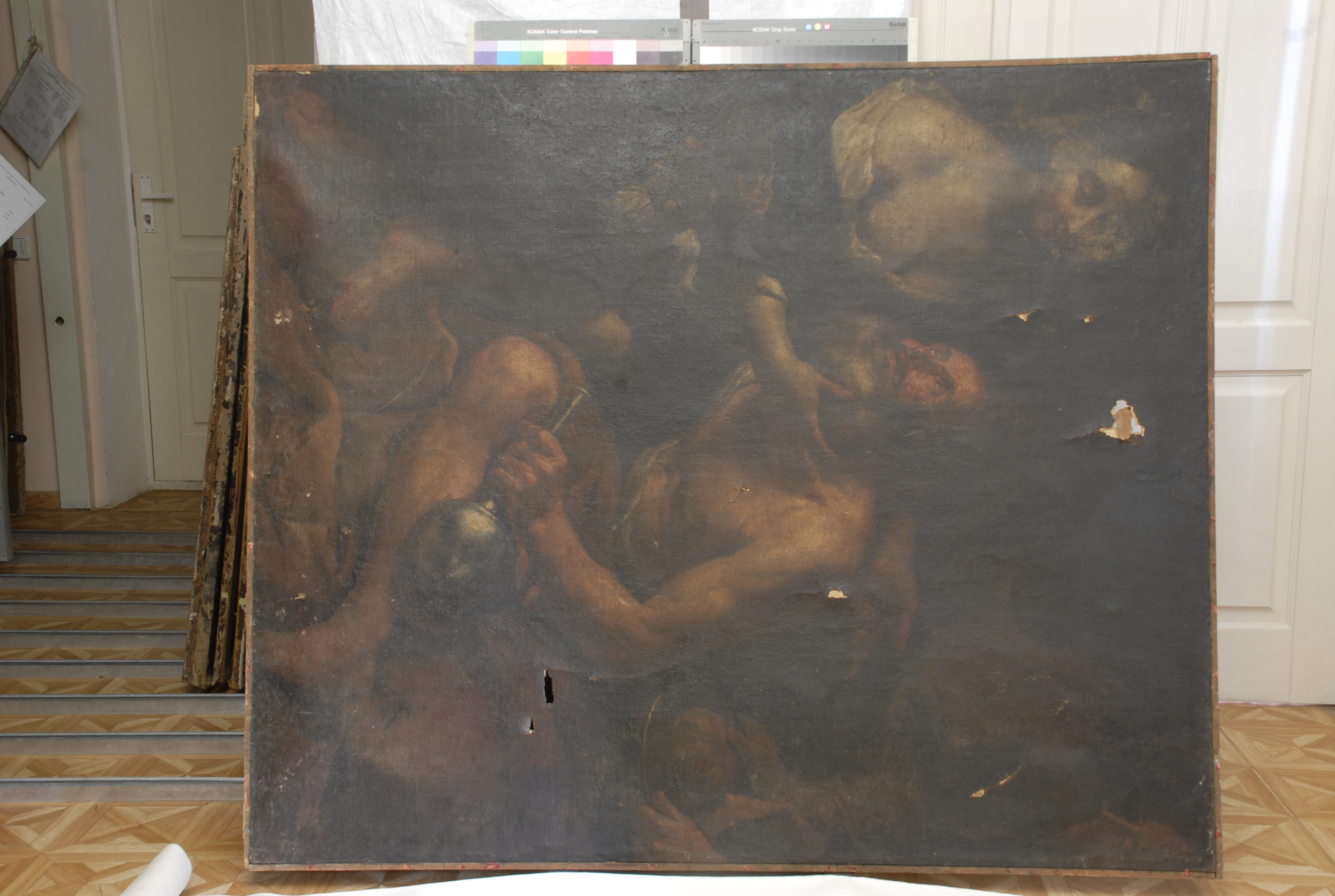 Інвентар 1948р.: сильне потемніння та розклад лаку, 6 пробоїн, глибокі подряпини з осипаннями фарбового шару.,