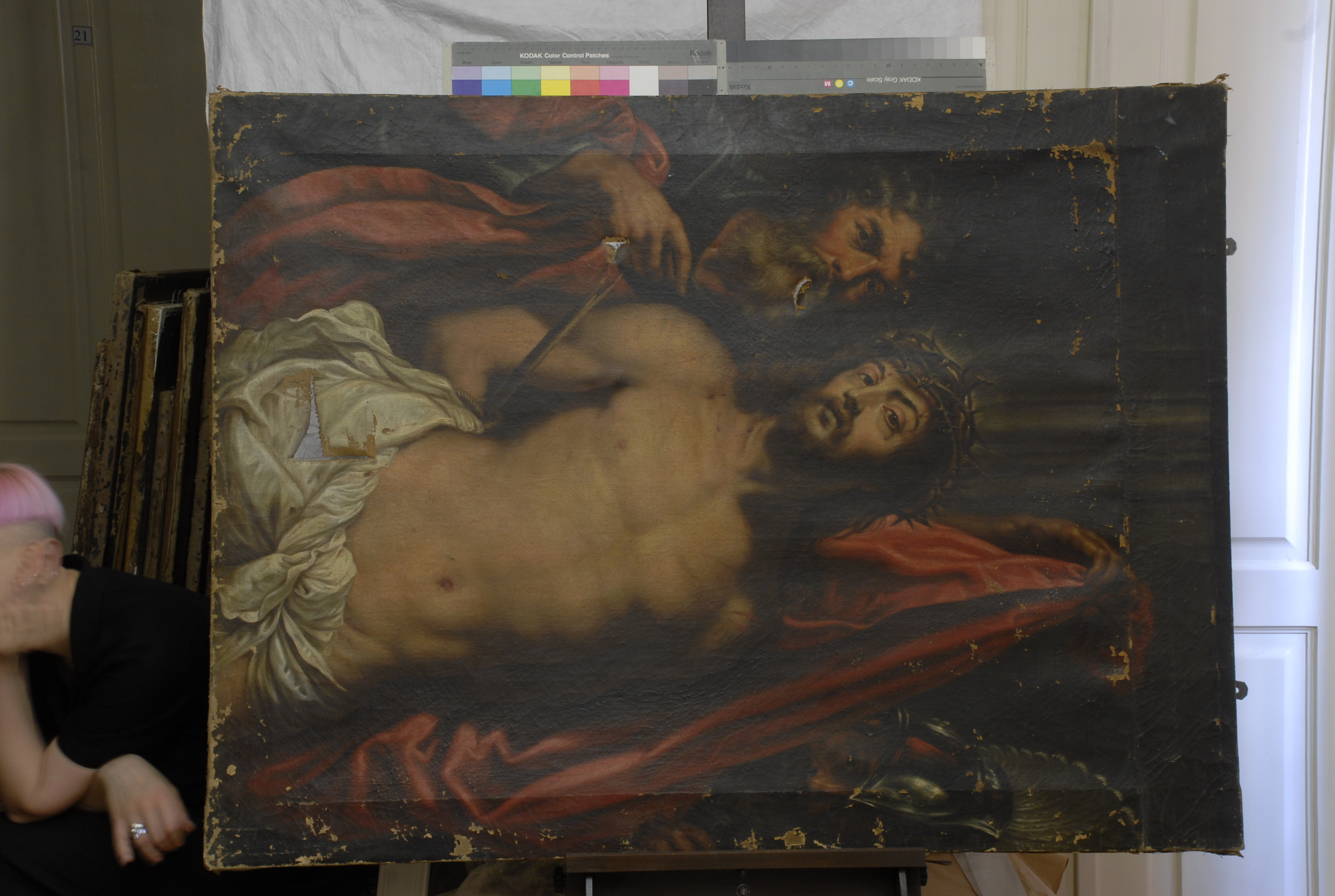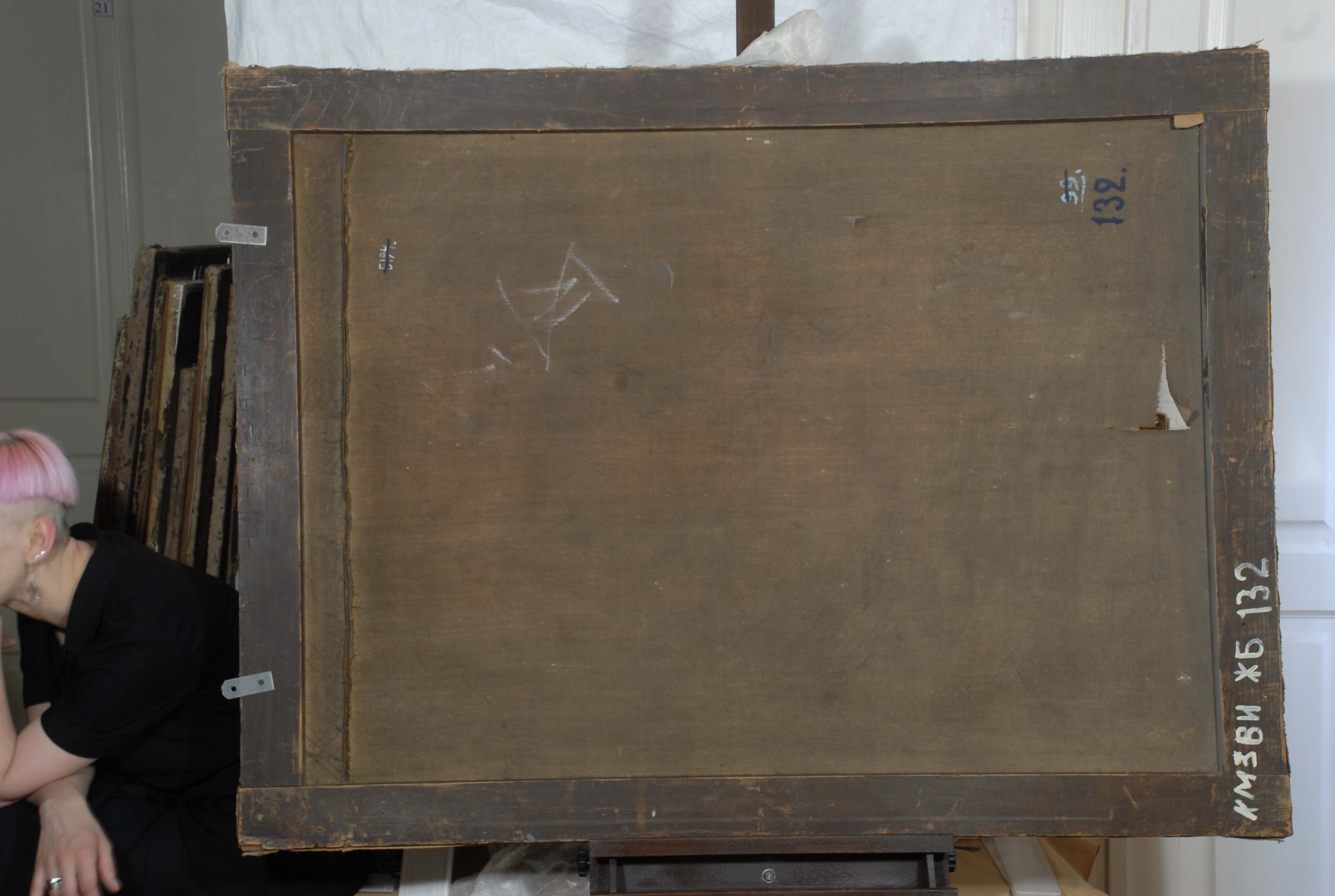 Інвентар 1948р.: полотно продавлене, в трьох місцях прориви. Осипання фарбового шару в трьох місцях картини.,