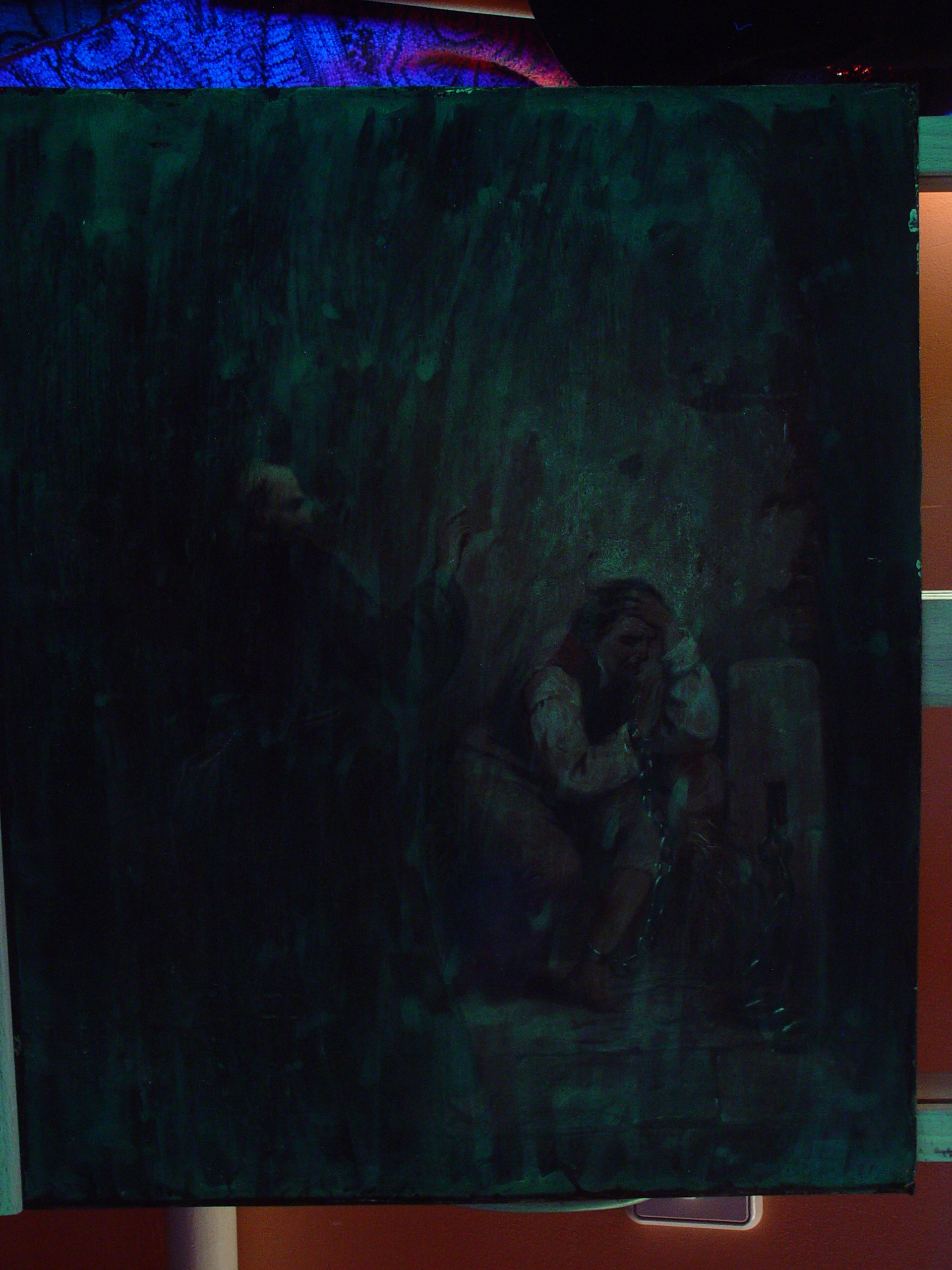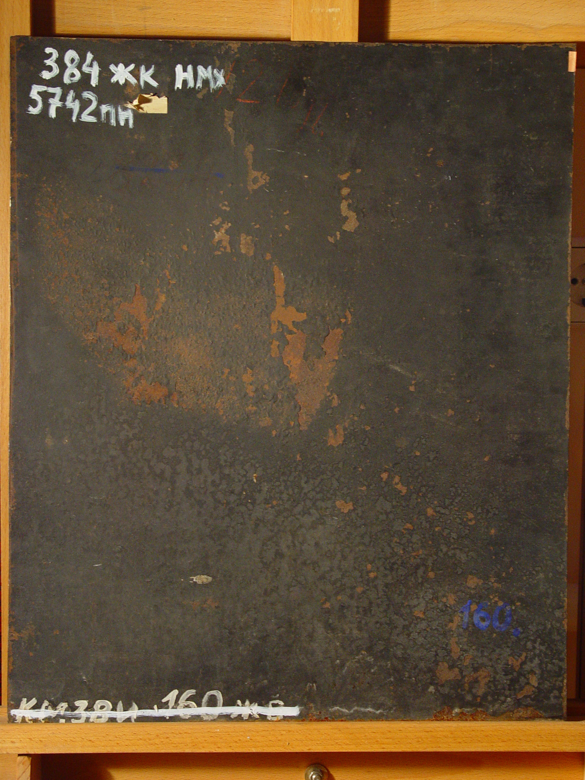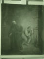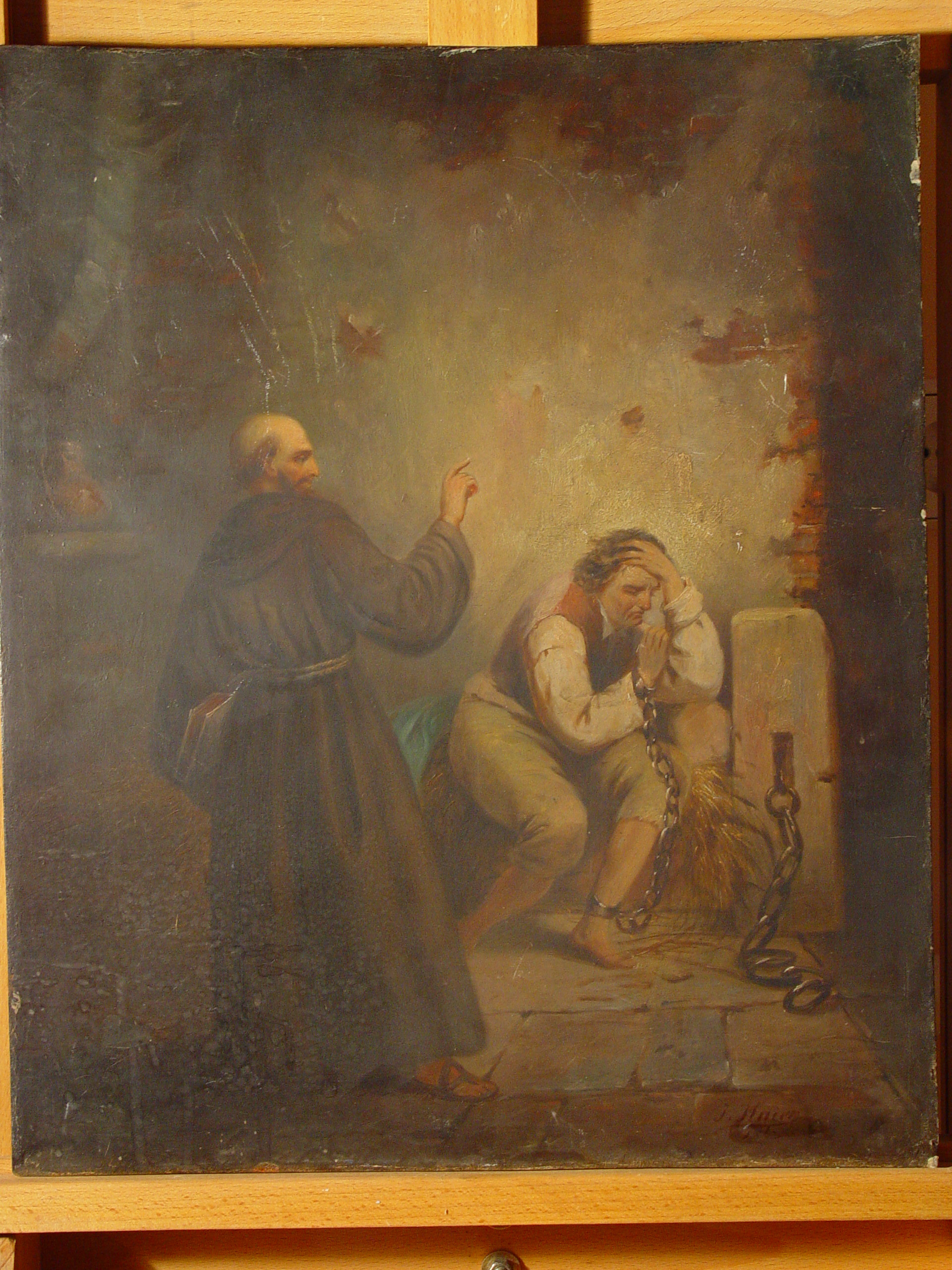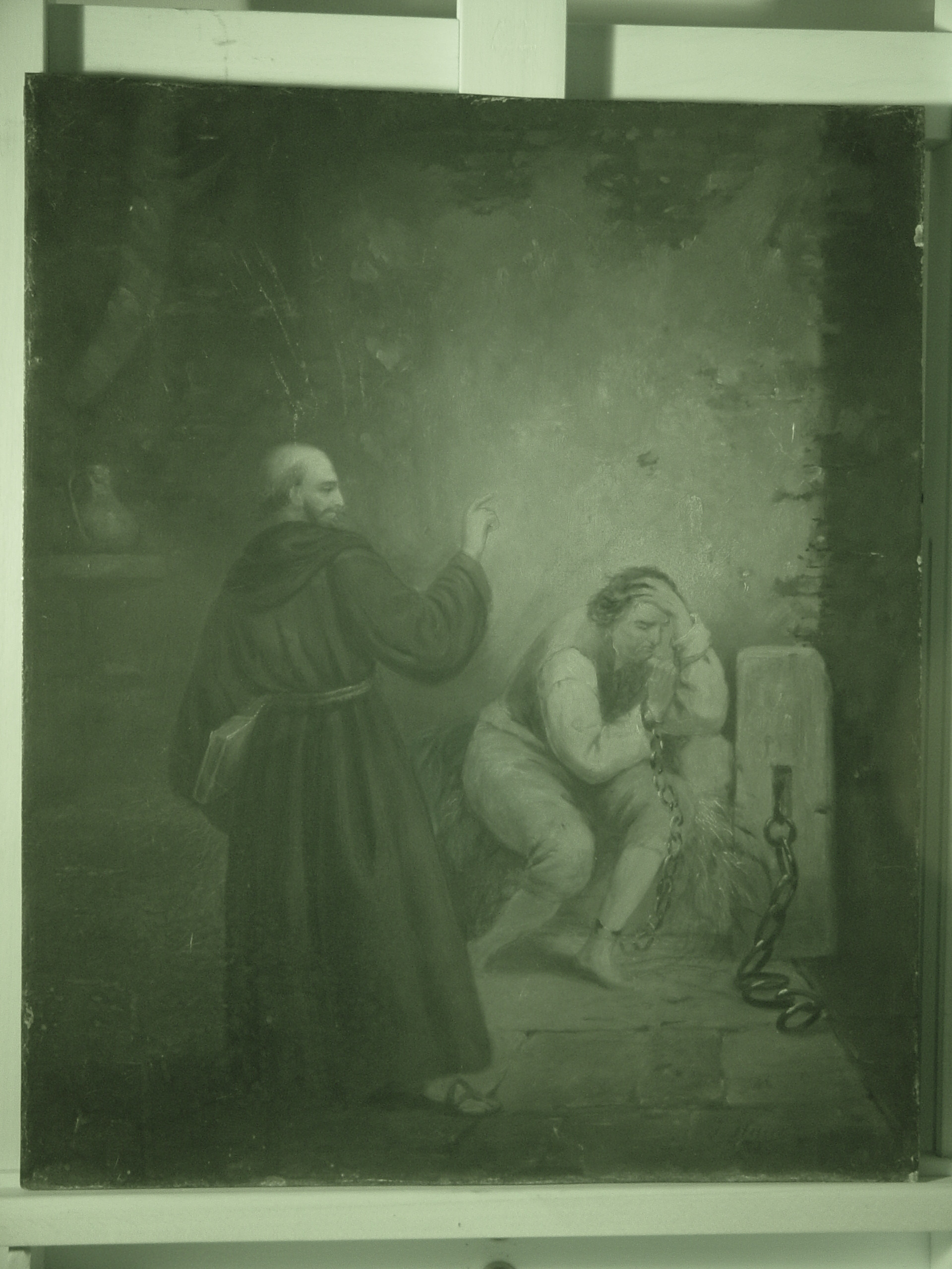 Закладка “Атрибуція” - Змiн. назва: Сцена у в’язниці/Змiн. розміри: 49х43х0,1/Змiн.опис: Сцена в інтер’єрі. На тлі мурованої стіни – чоловік, закутий у кайдани, який сидить на ліжку, вкритому соломою. На передньому плані ліворуч – чернець з книгою, зображений зі спини. Ліворуч вглибині – глек на полиці. Біля правого нижнього кута – підпис і дата: «J.Haier 1862»./Змiн. Iншi написи, штампи, печатки, етикетки, наклейки: Біля лівого верхнього кута – напіввтрачена паперова наклейка з залишками напису; біля верхнього краю – червоним олівцем:" «121. Л.(?)». Біля нижнього правого кута: «160» (темно-блакитною олійною фарбою), у лівого – «КМЗВИ 160 ЖБ»./Змiн. час створення: 1862місце створення, школа: НімеччинаНовый материал: металНовый материал: залізо