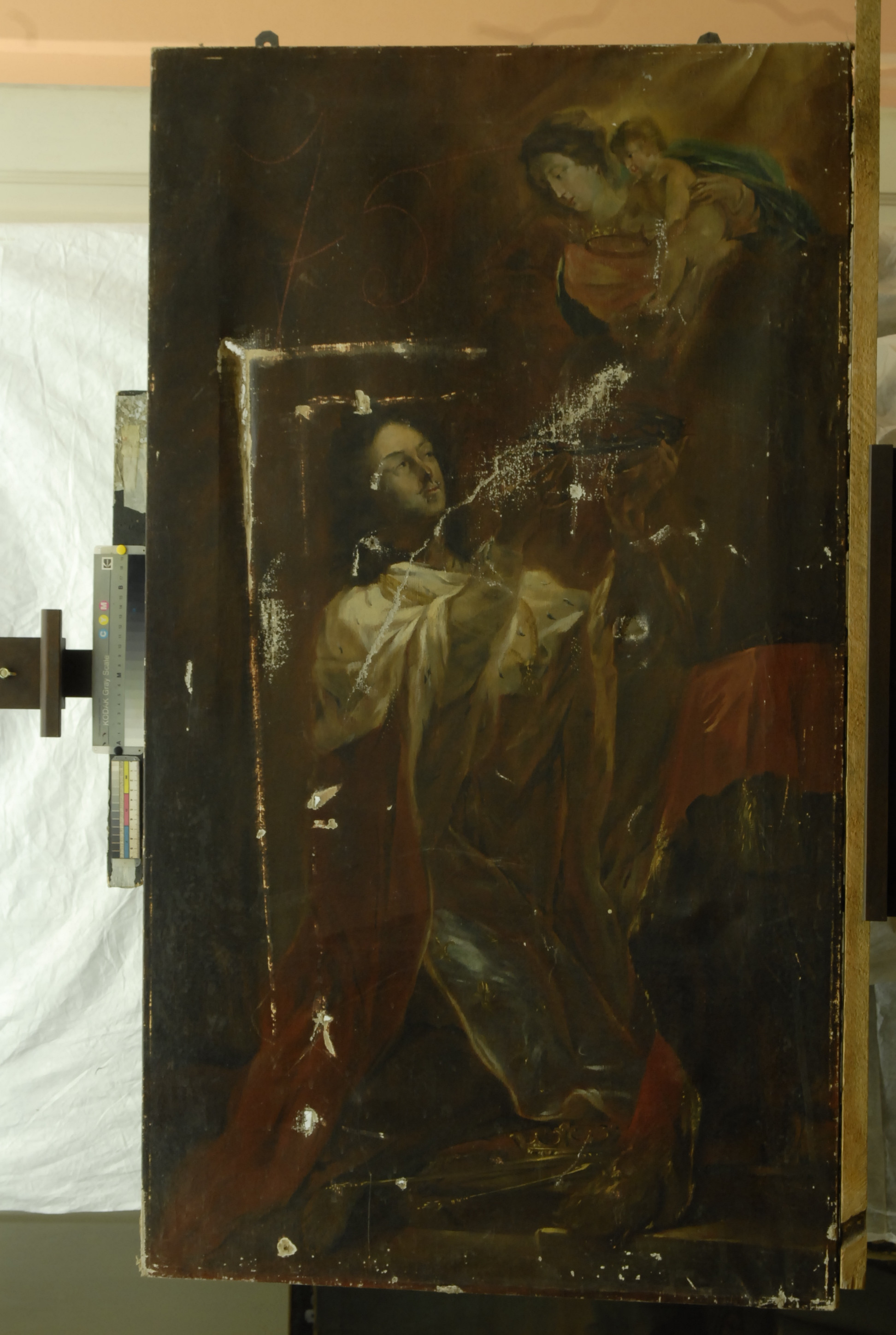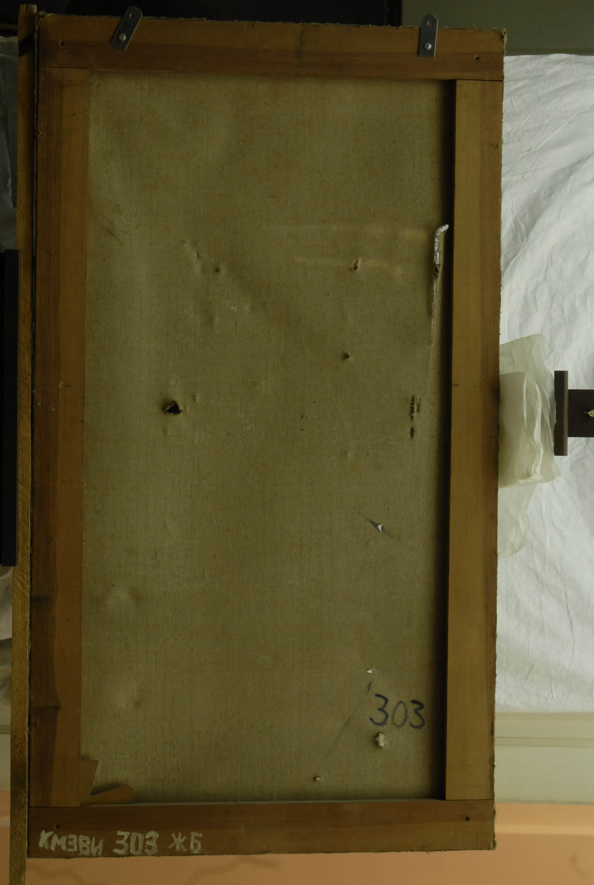 Інвентар 1948р.: розірвана у багатьох місцях, випадінням фарбового шару, забруднення лаку.,