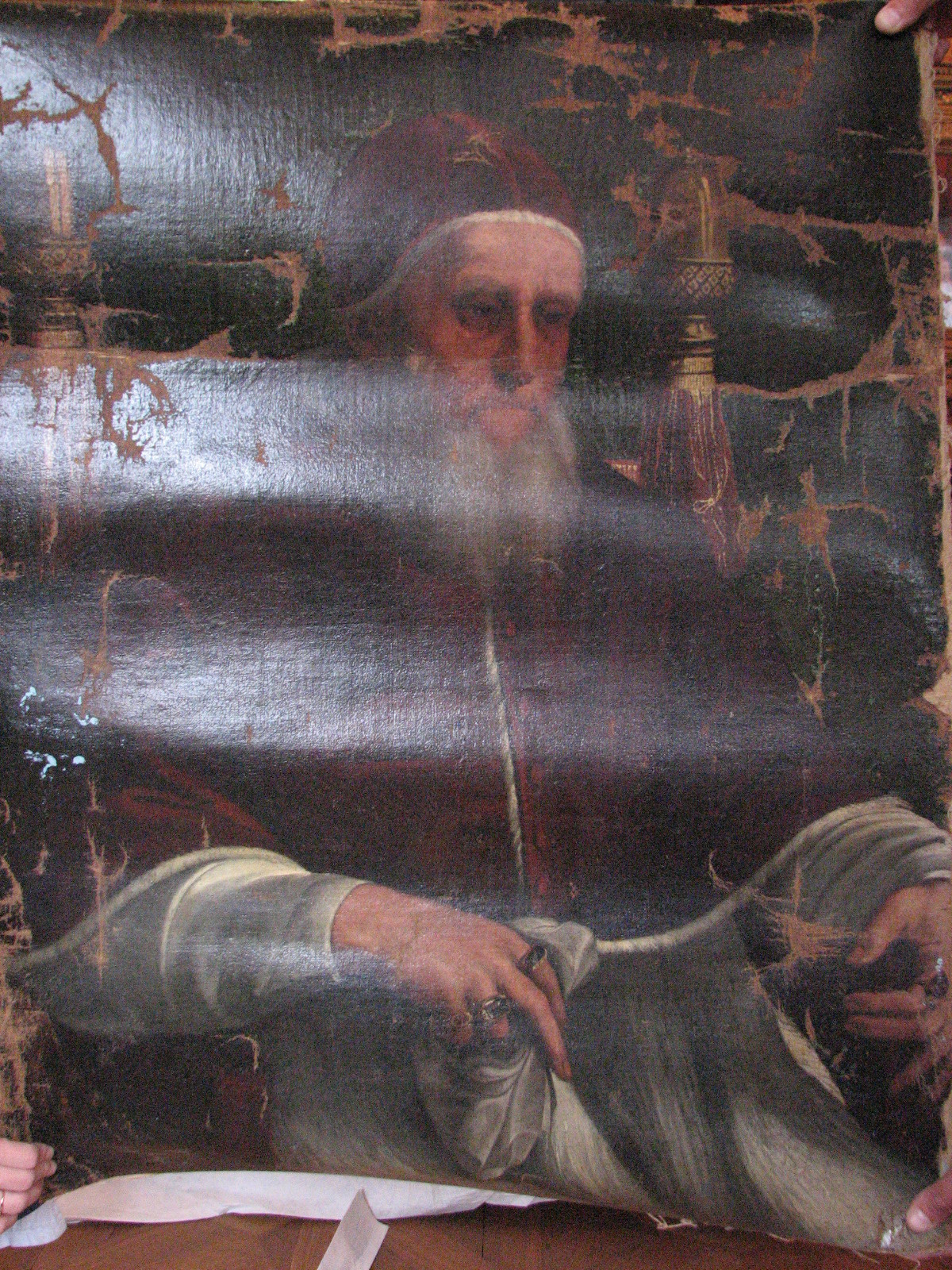 Інвентар 1948р.: без підрамника, дубльована, в багатьох місцях численні злами полотна зі випадіннями фарбового шару. Зрізана по краях.,
