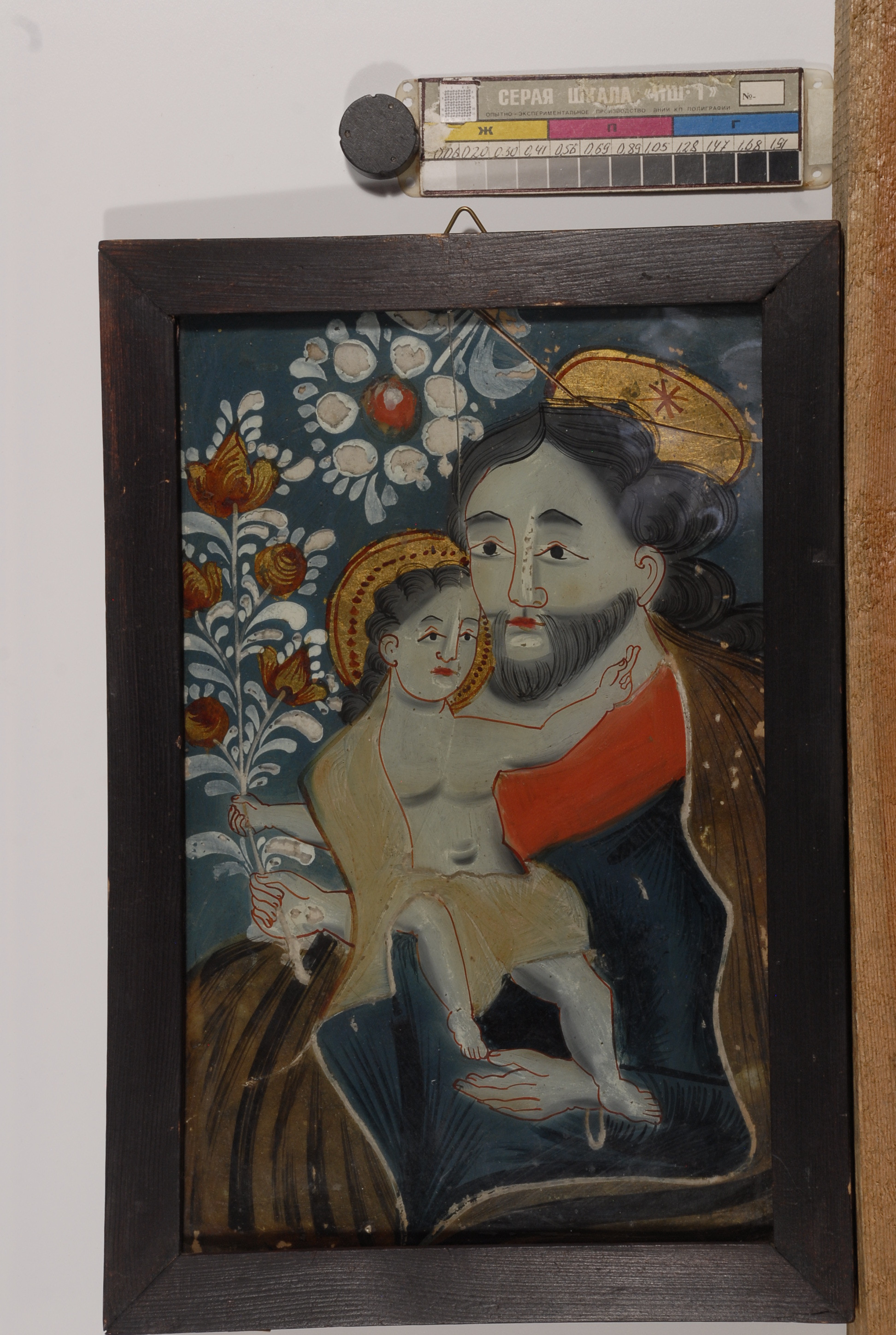 Інвентар 1967р.: загальне забруднення, численні осипання фарбового шару.Дефект скла з білим рельєфним украпленням (діаметр 0,25 мм) поблизу нижнього краю ліворуч. Клиноподібна розколина скла (від середини верхнього краю – три фрагменти). Чисельні осипання білила (пелюстки квітів, рука та ніс святого). Інші втрати фарбового шару – уздовж правої сторони, біля лівої ніжки Немовляти. Пилові забруднення скла й рами. Мушині екскременти.,